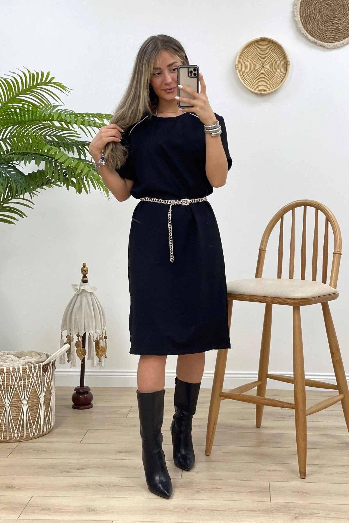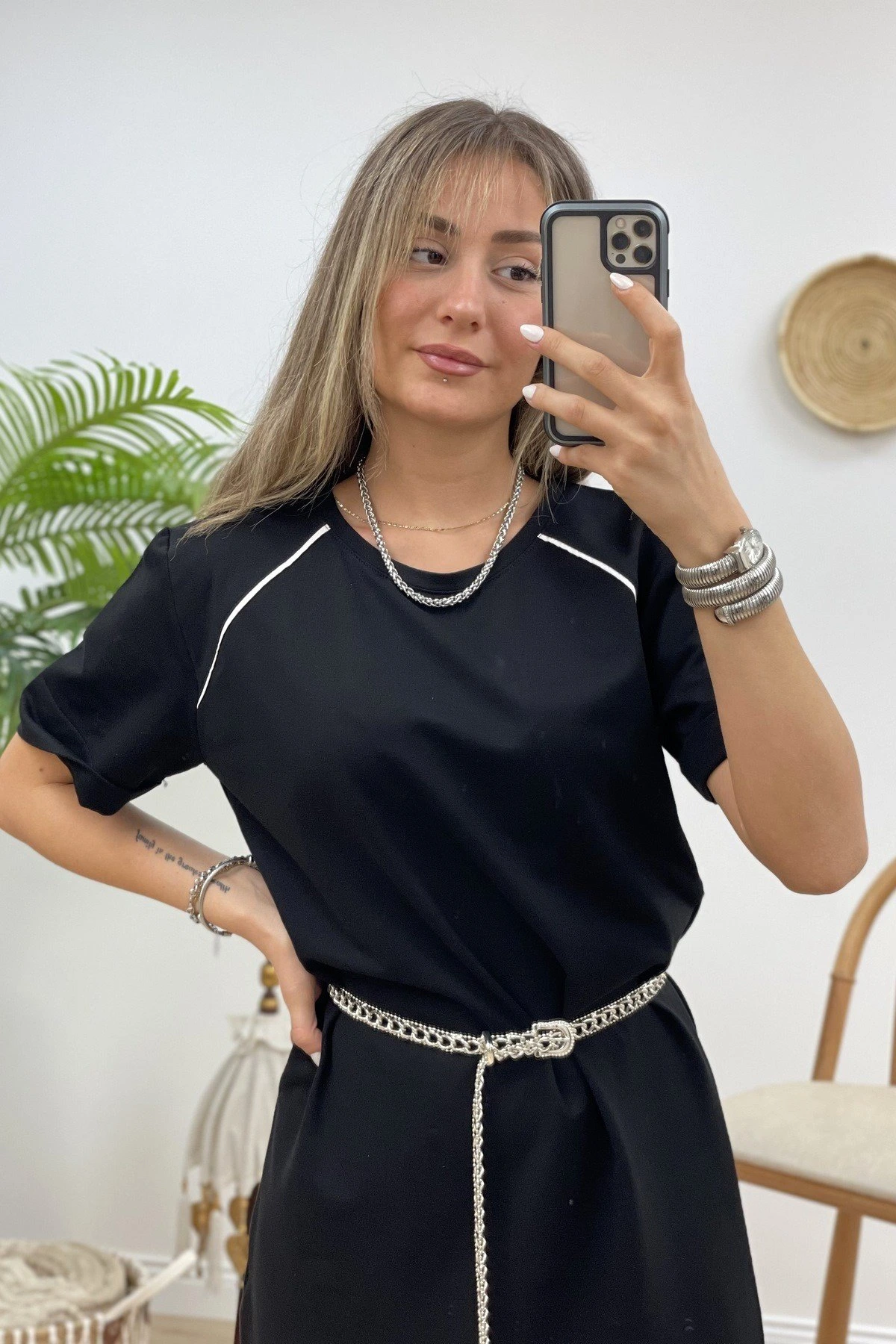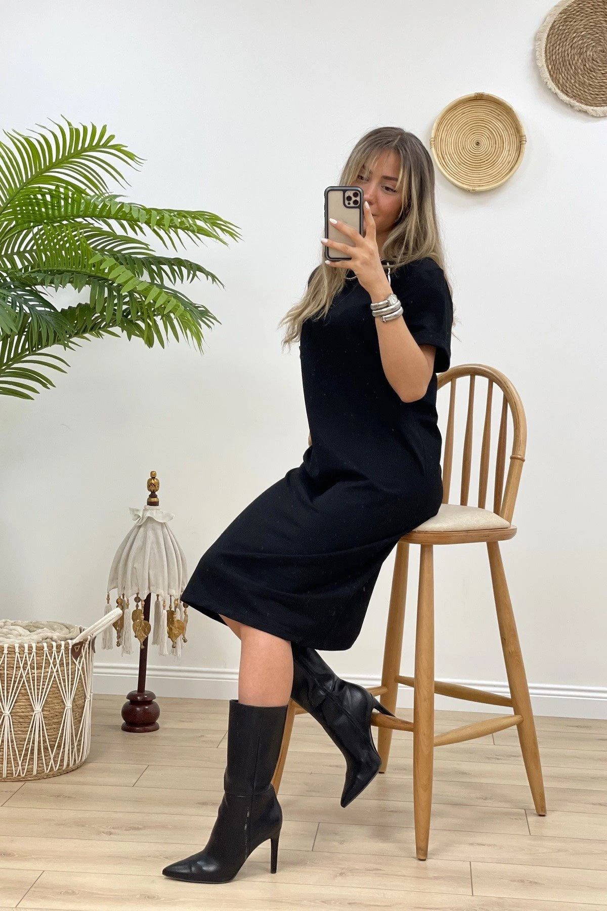 MİDİ BOY YAN YIRTMAÇ BİYELİ ELBİSE – SİYAH