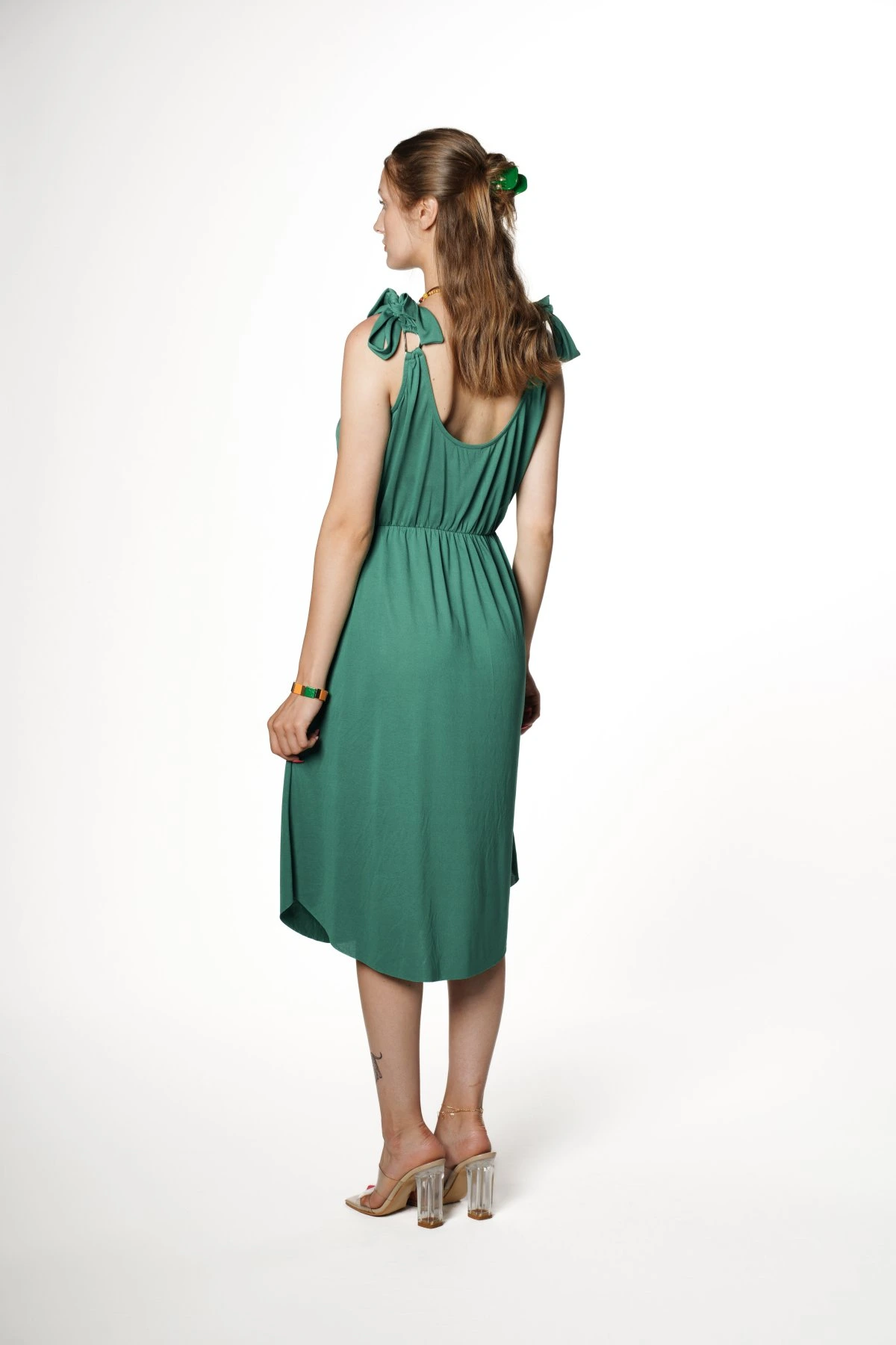 OMUZ BAĞLAMALI ETEK UCU LAZER KESİM PAMUK ELBİSE – ZÜMRÜT YEŞİL