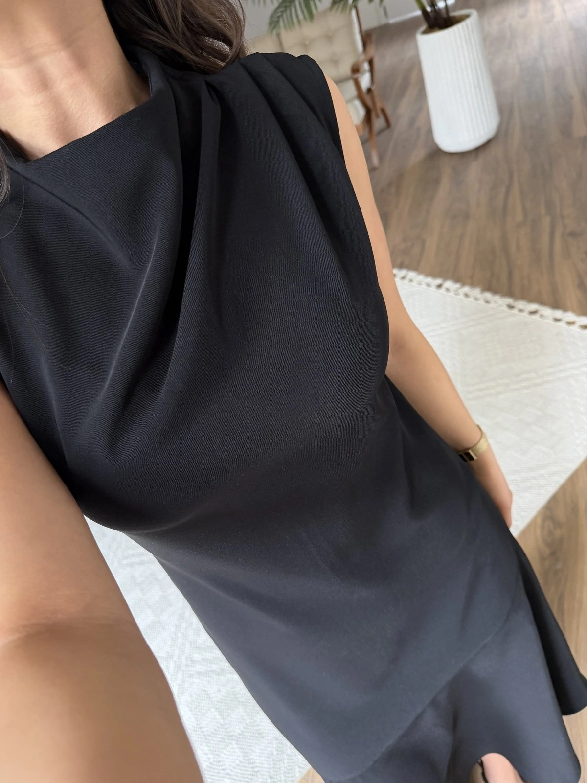 OMUZ PİLE ASİMETRİK YAN YIRTMAÇ MAXİ ELBİSE – SİYAH