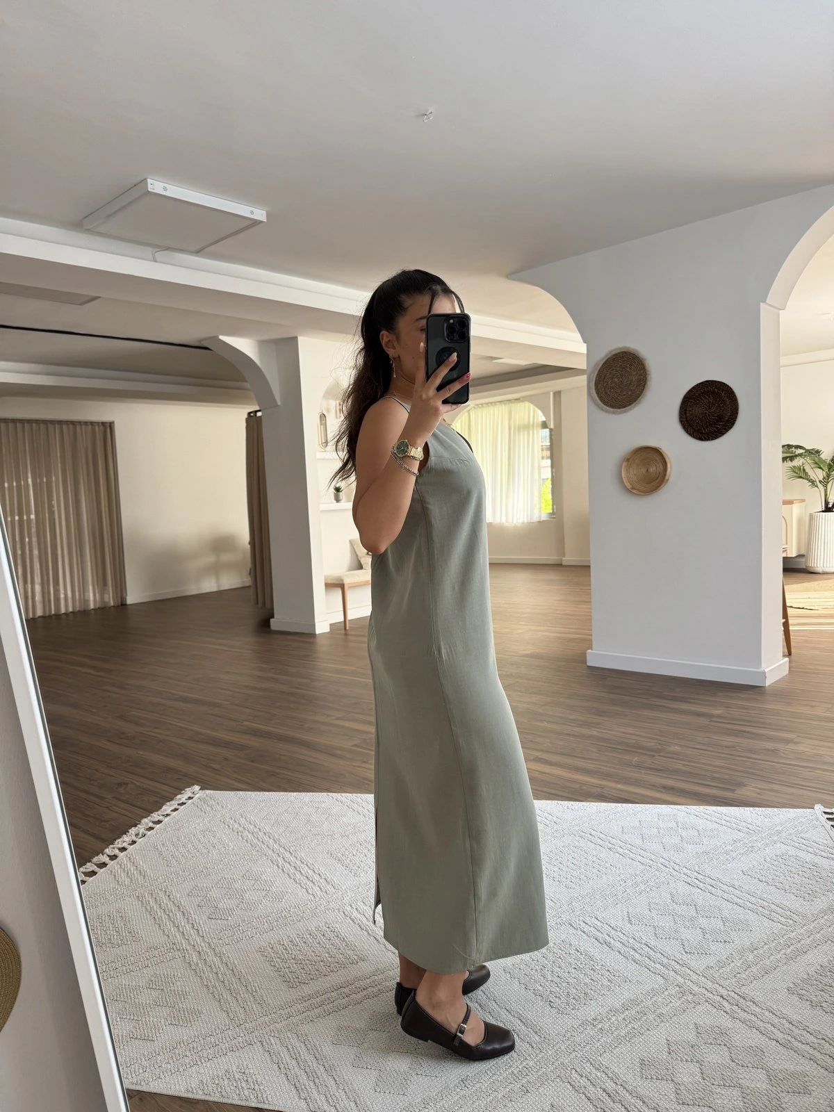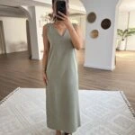 ÖN ARKA V ARKA YIRTMAÇLI TENSEL ELBİSE – HAKİ