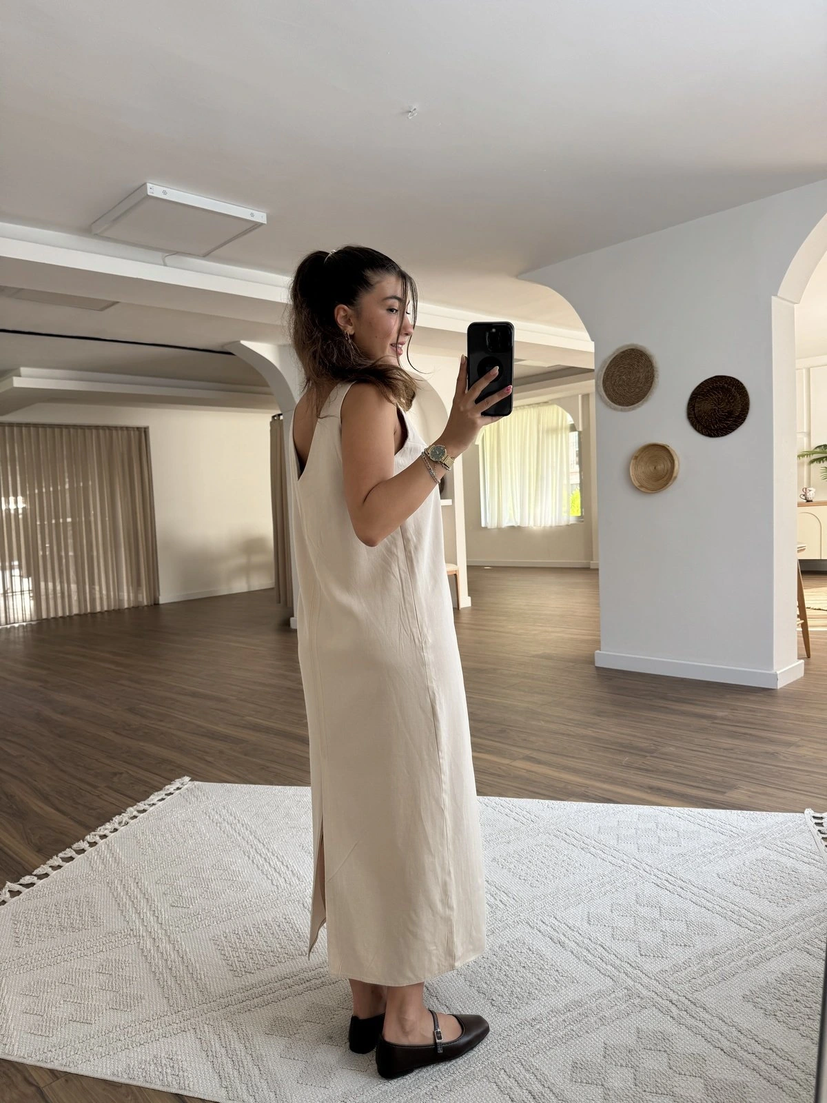 ÖN ARKA V ARKA YIRTMAÇLI TENSEL ELBİSE – TAŞ