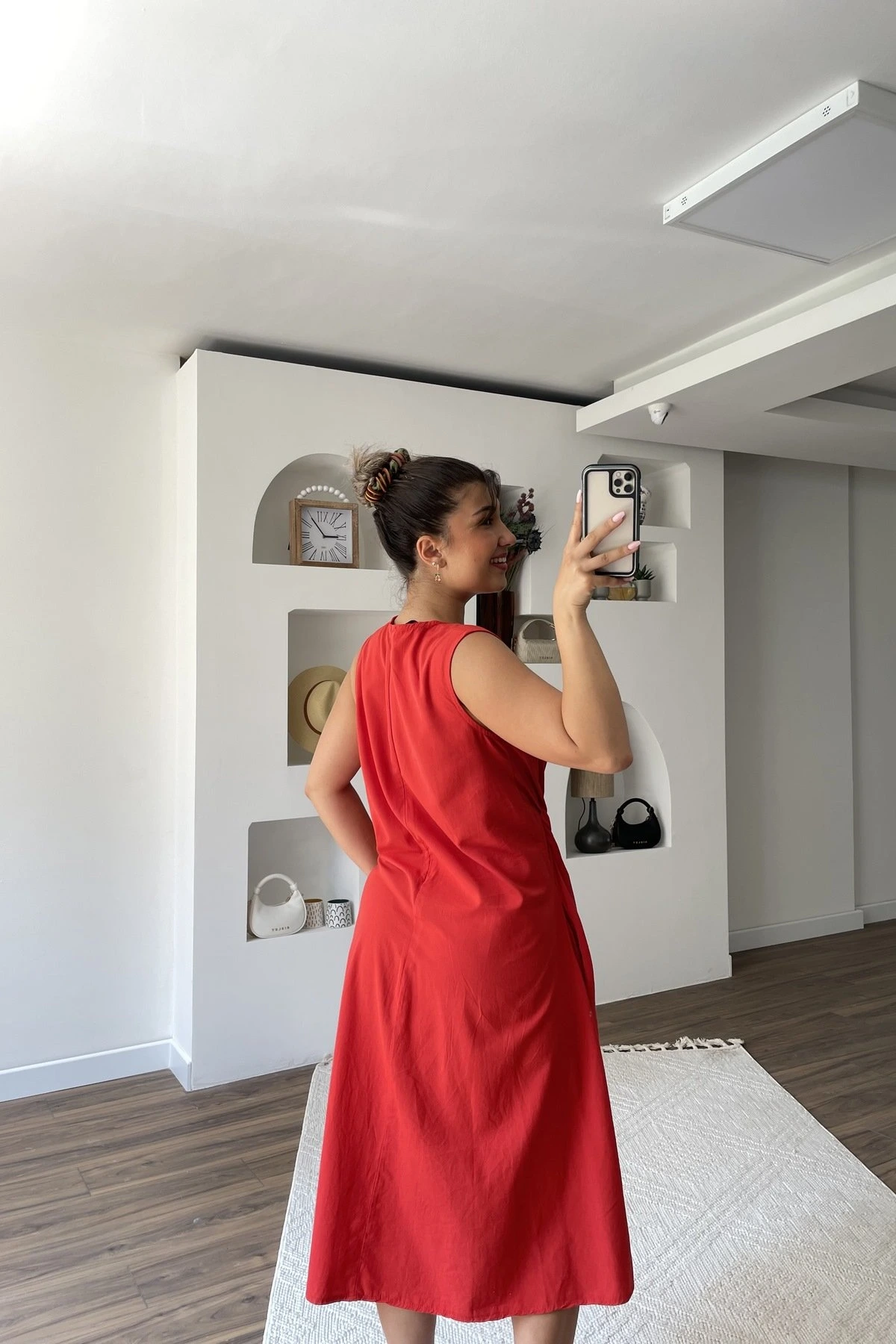 ÖN BEL BÜZGÜ CEPLİ MAXİ BOY PAMUK ELBİSE – KIRMIZI