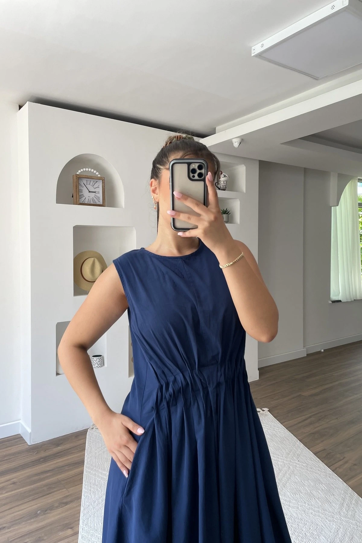 ÖN BEL BÜZGÜ CEPLİ MAXİ BOY PAMUK ELBİSE – LACİVERT