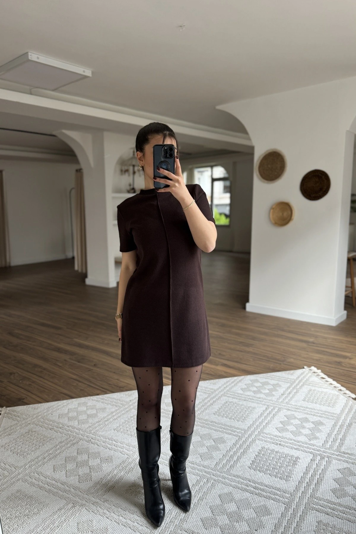 ÖN DİKİŞ YUMUŞAK DOKU KISA KOL PAMUK ELBİSE – KAHVE