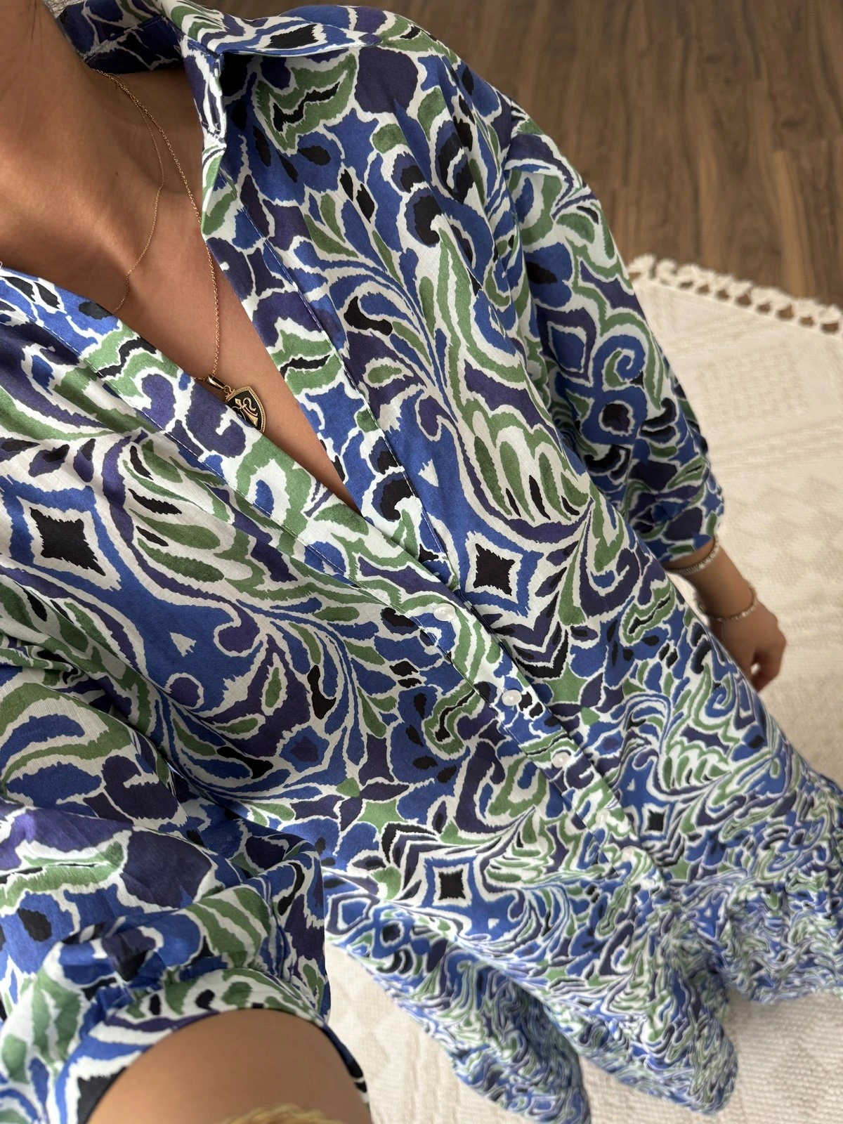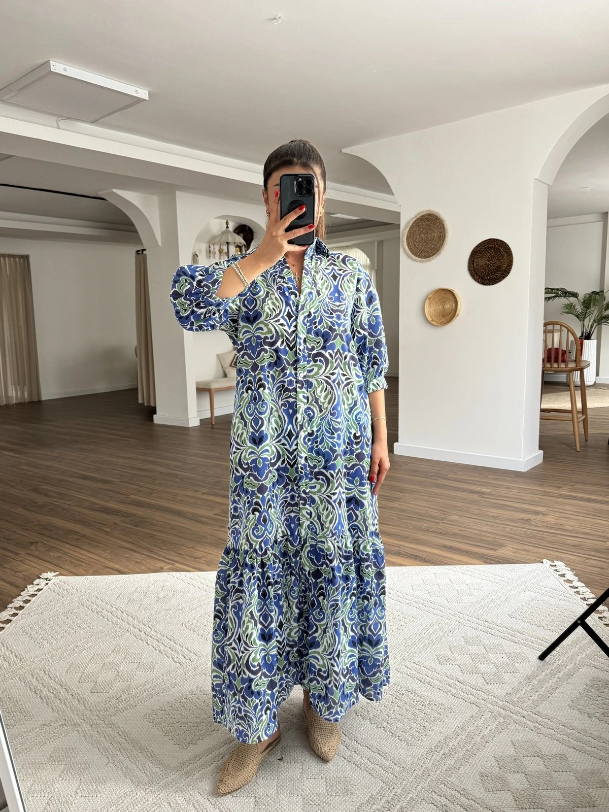 ÖN DÜĞMELİ ETEĞİ FIRFIR PAMUK UZUN ELBİSE – LACİVERT
