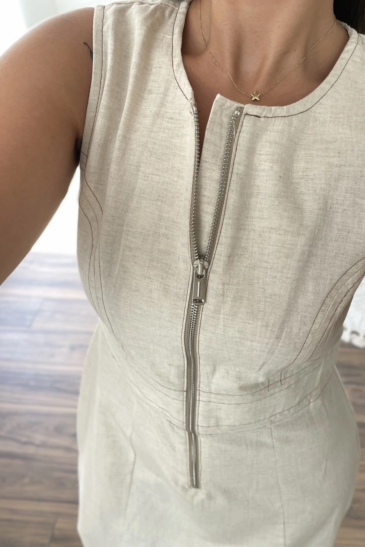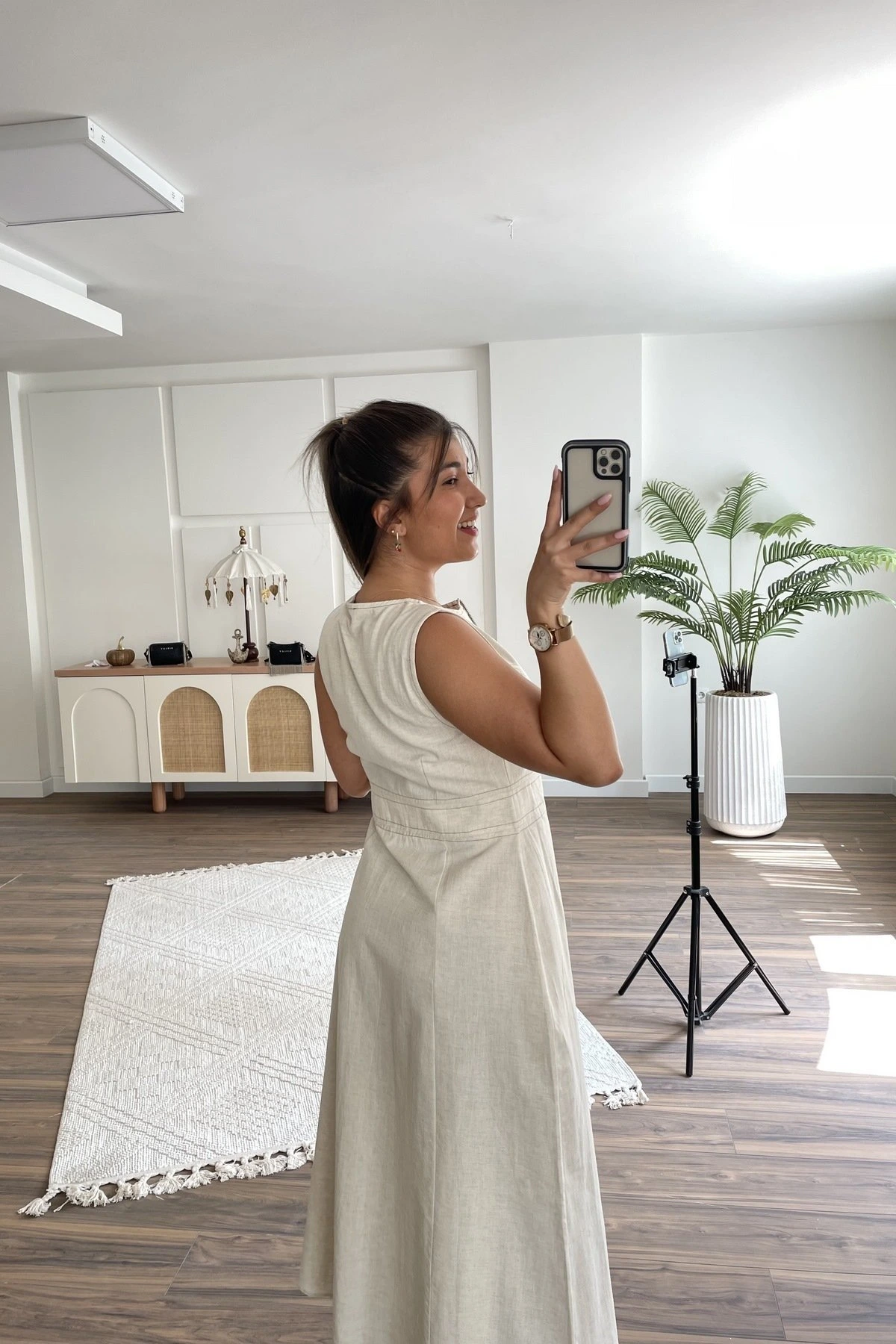 ÖN FERMUAR SPOR DİKİŞ MAXİ BOY KETEN ELBİSE – NATUREL