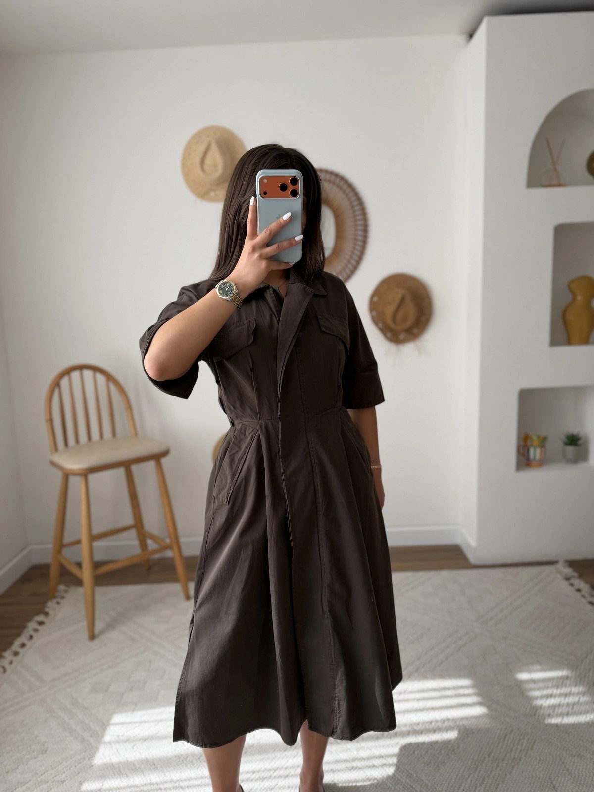 ÖN FERMUARLI ARKA BEL LASTİK KUŞAKLI PAMUK ELBİSE – ACI KAHVE