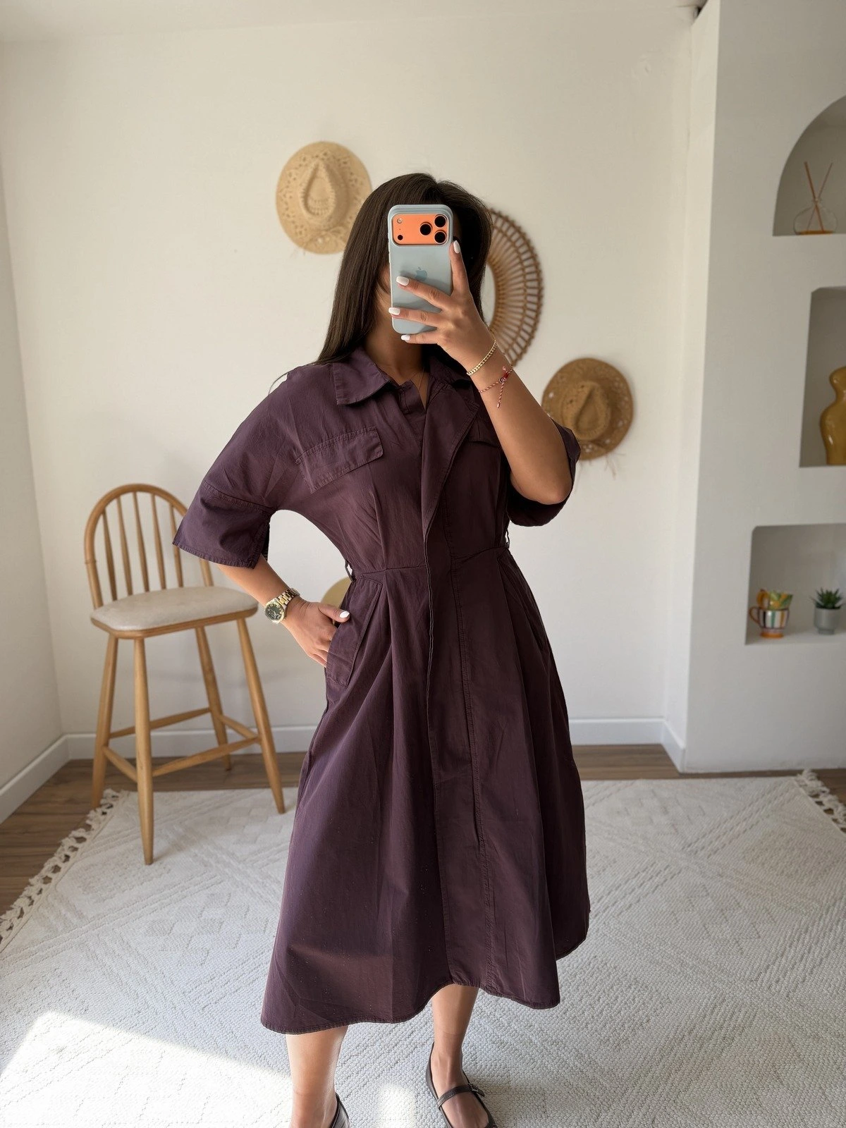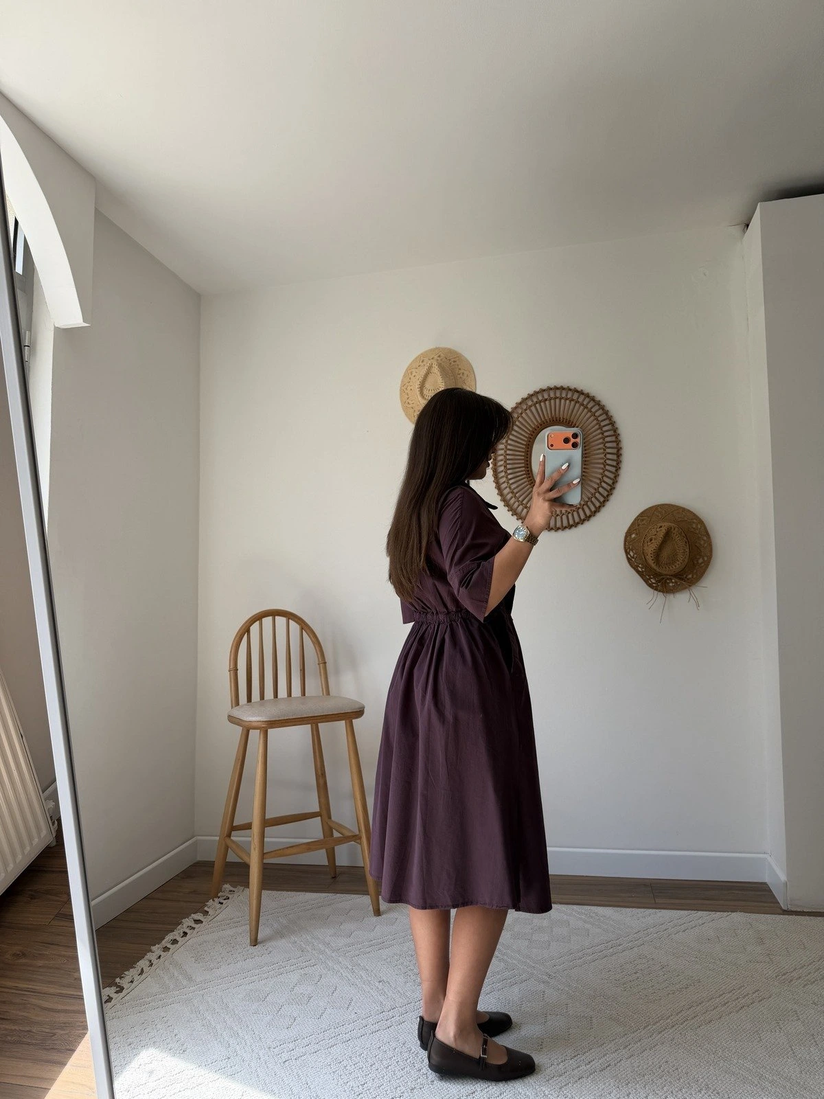 ÖN FERMUARLI ARKA BEL LASTİK KUŞAKLI PAMUK ELBİSE – MOR