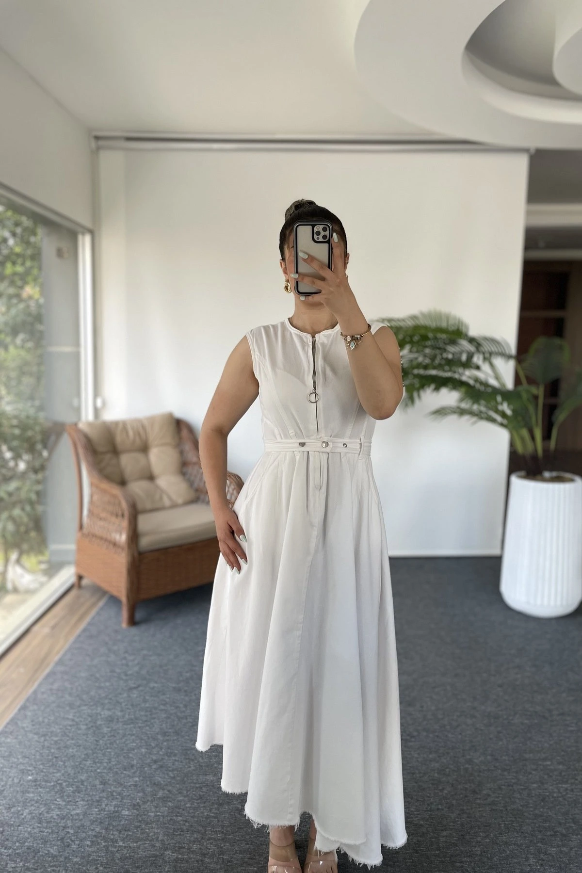 ÖN FERMUARLI ASİMETRİK PÜSKÜL JEAN ELBİSE – BEYAZ