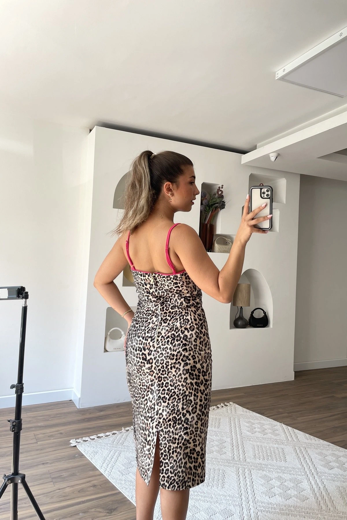 PEMBE ŞERİT ASKI ARKA YIRTMAÇ PAMUK LİKRA ELBİSE – LEOPAR