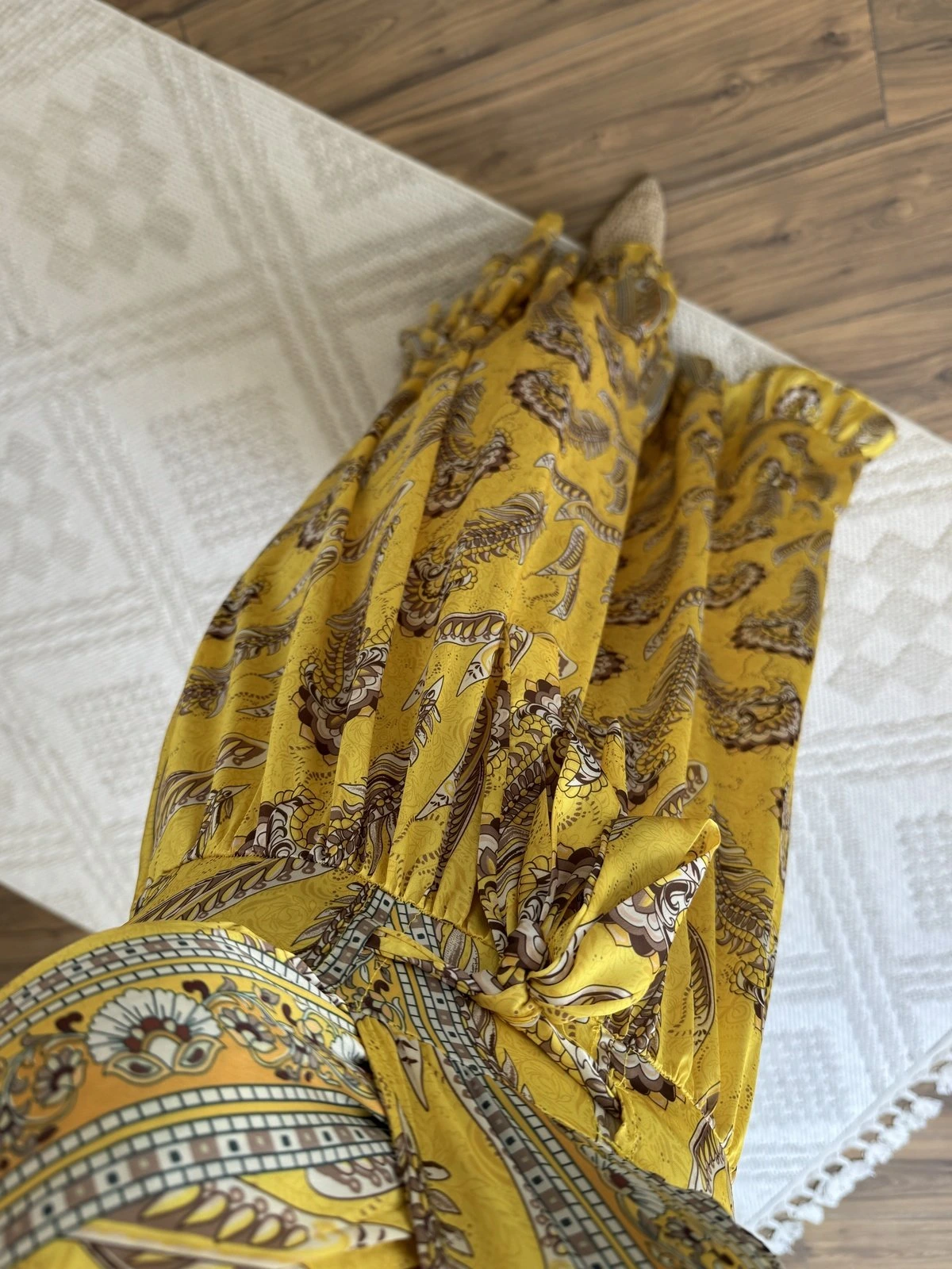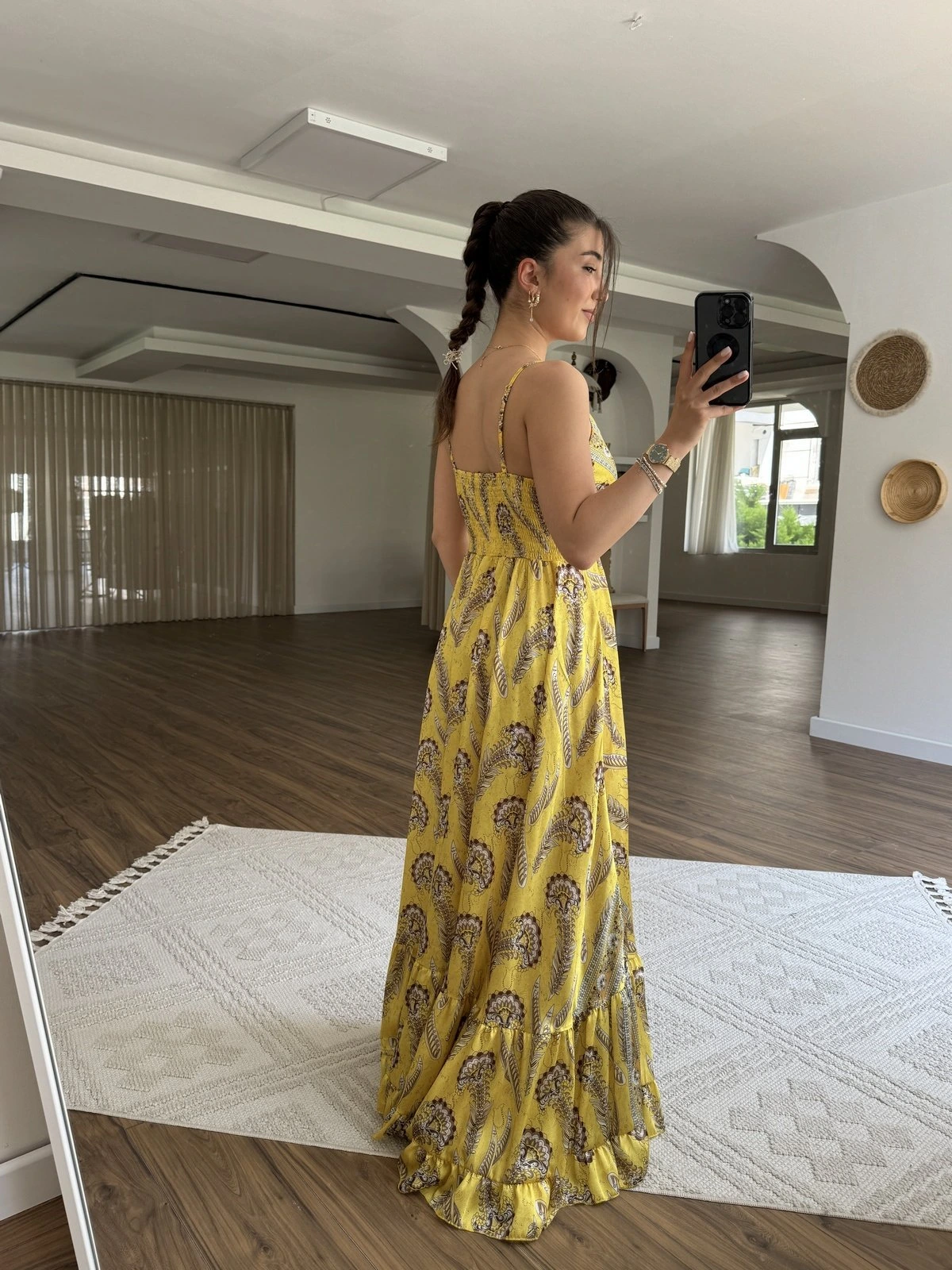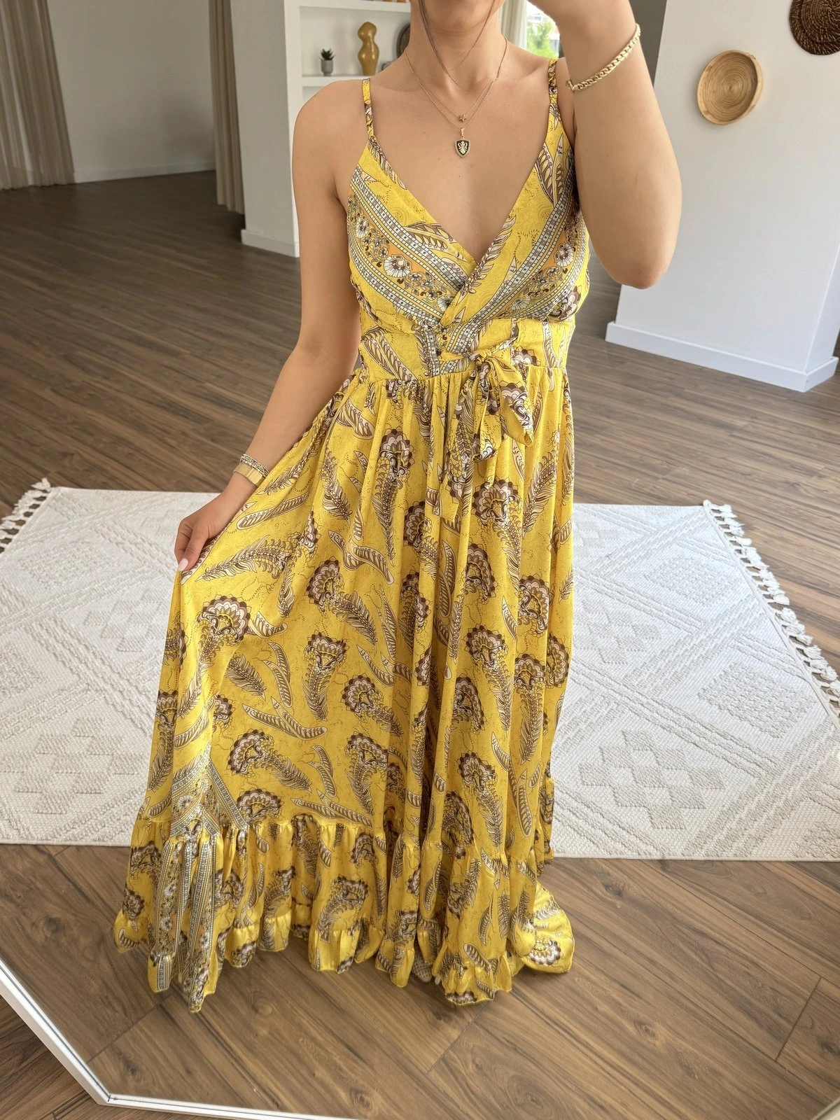 ROBADAN İP BAĞCIKLI ETEĞİ FIRFIR DESENLİ MAXİ ELBİSE – SARI