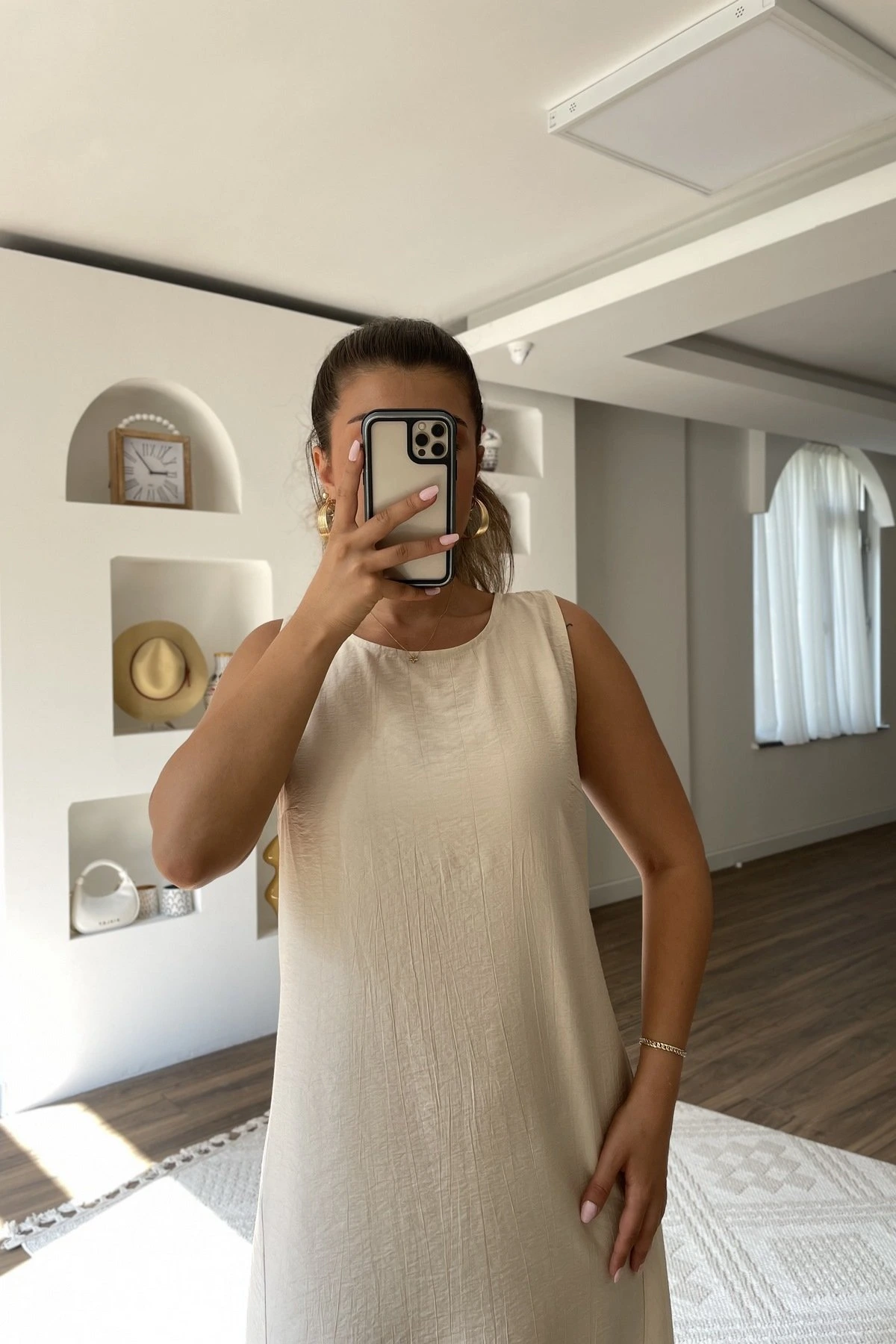 SIFIR KOL ARKA PENCERE MİDİ VİSKON ELBİSE – TAŞ
