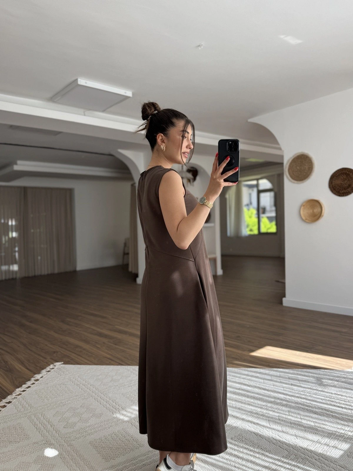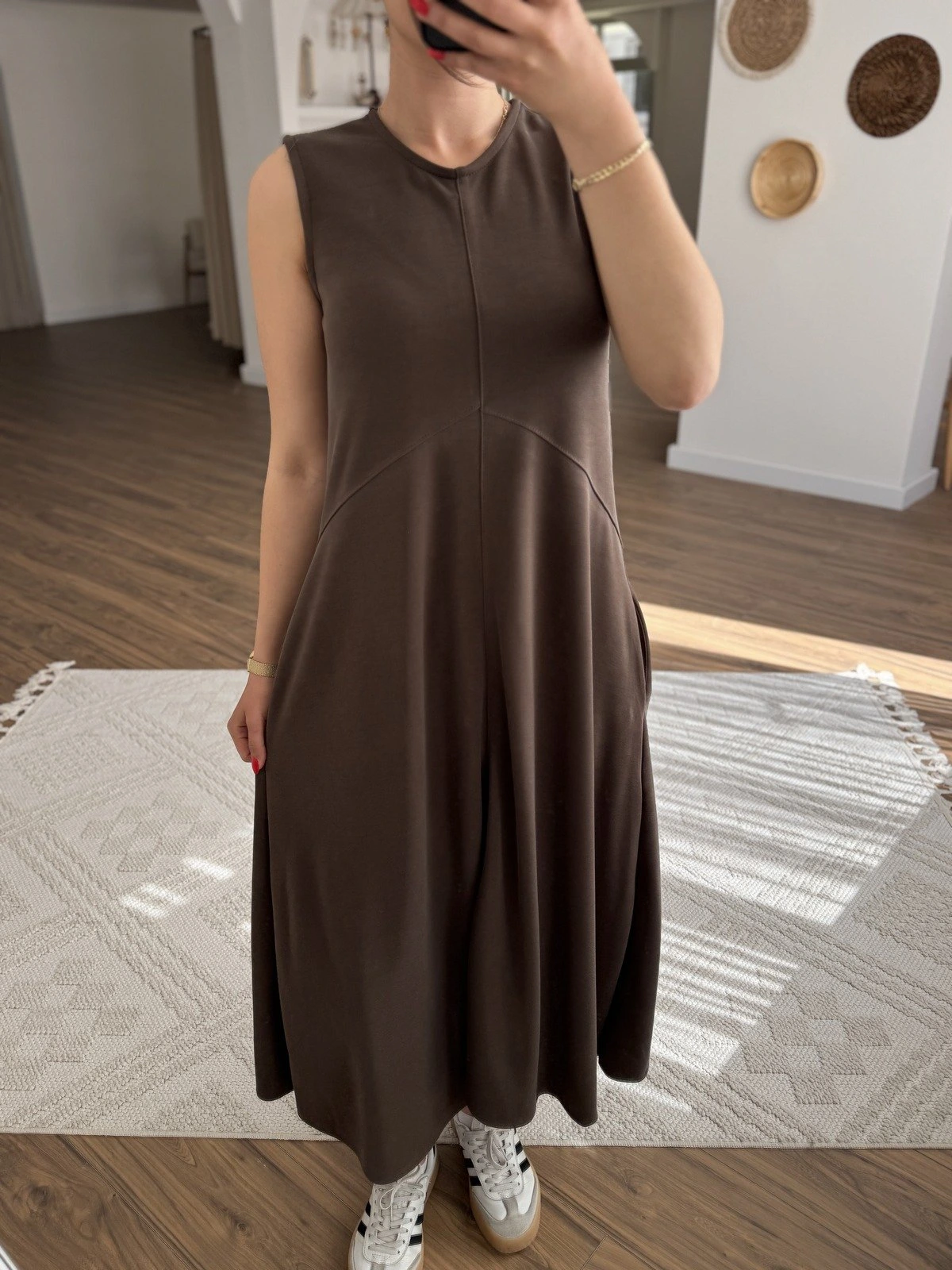 SIFIR KOL DİKİŞ DETAY CEPLİ UZUN ELBİSE – KAHVE
