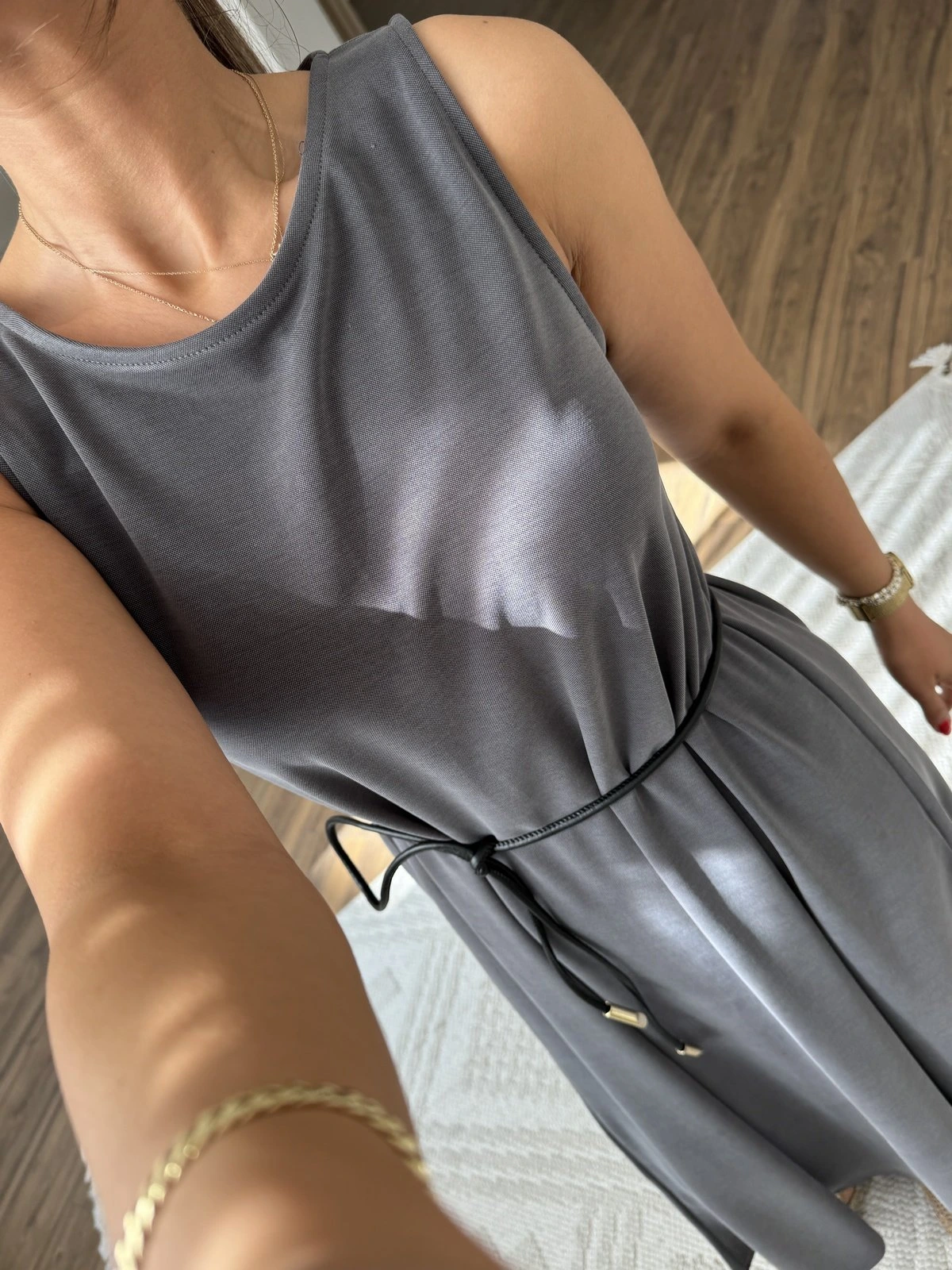 SIFIR KOL MIKNATIS KEMER MODAL PAMUK MAKSİ ELBİSE – GRİ
