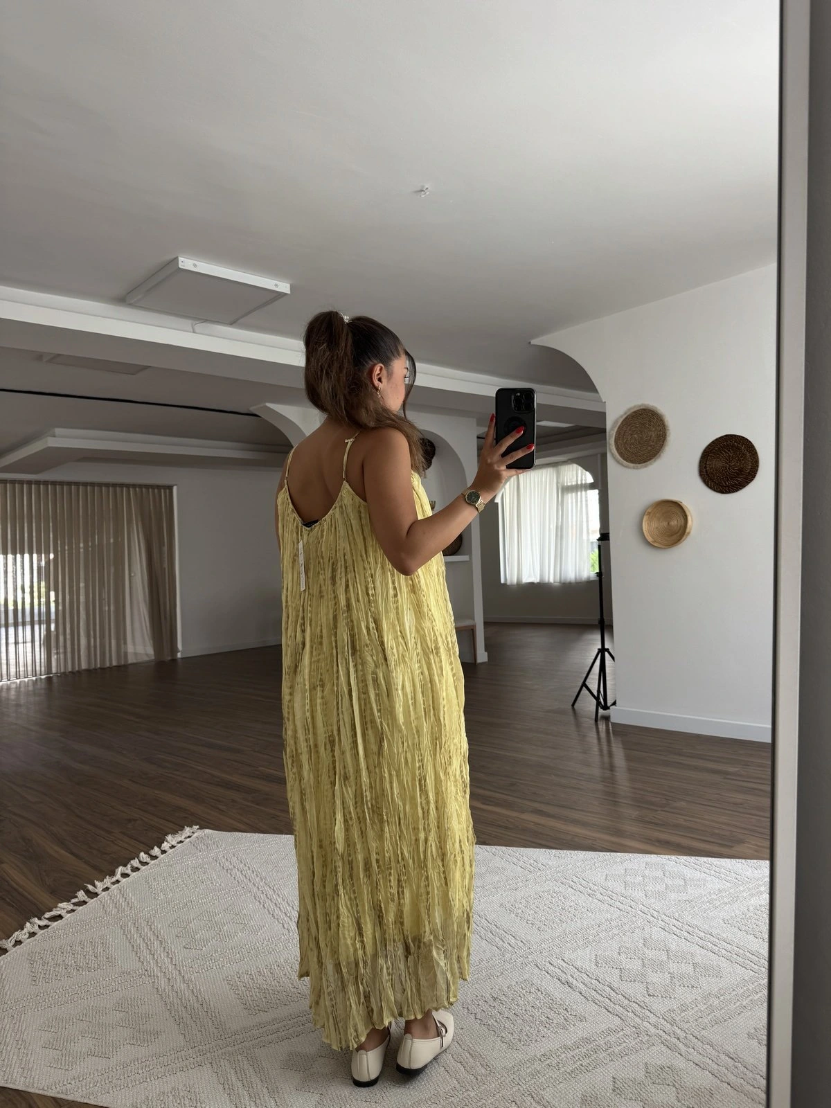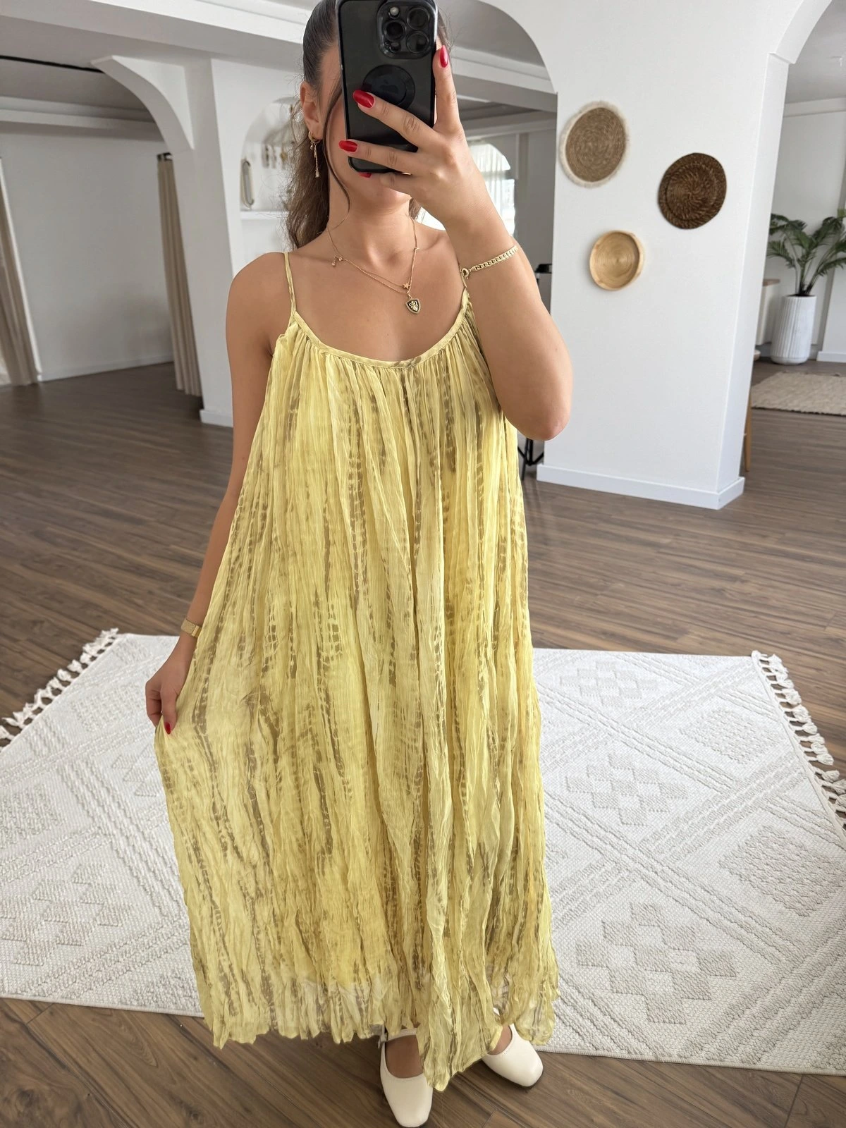 ŞİFON DESENLİ TAM BOY ASTARLI SALAŞ ELBİSE – SARI