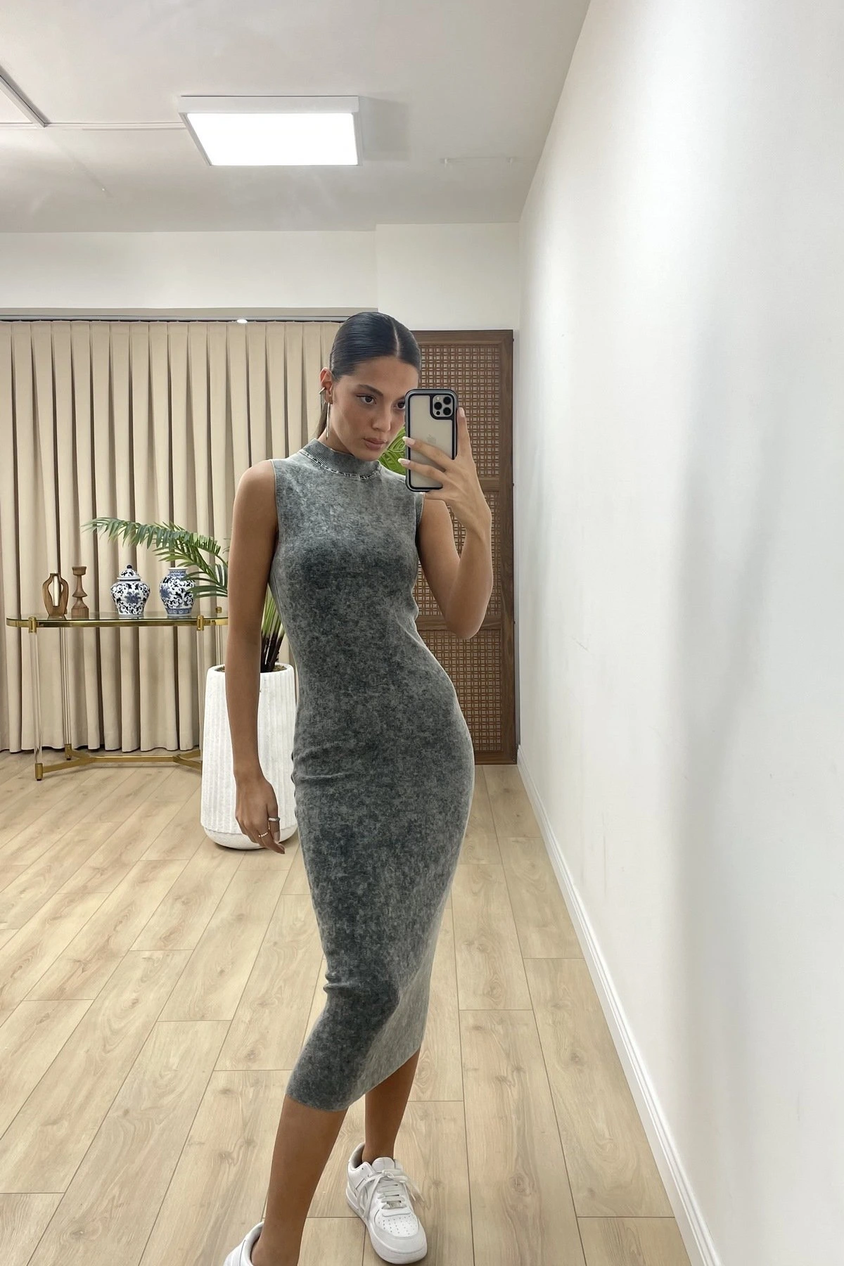 SOLUK EFEKLİ DİK YAKA PAMUK ELBİSE – ANTRASİT