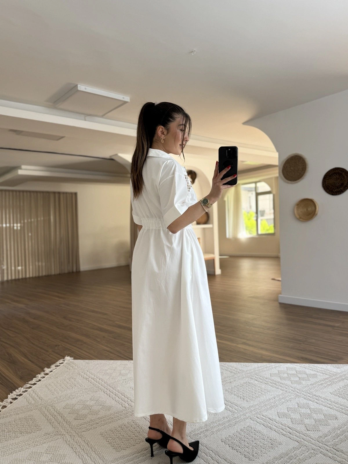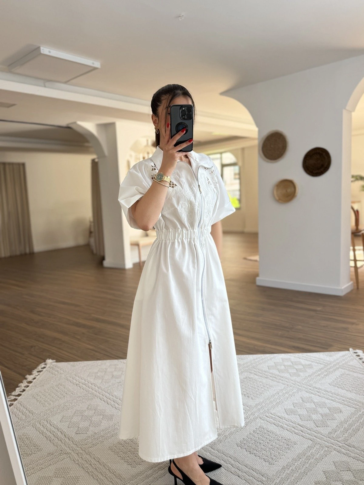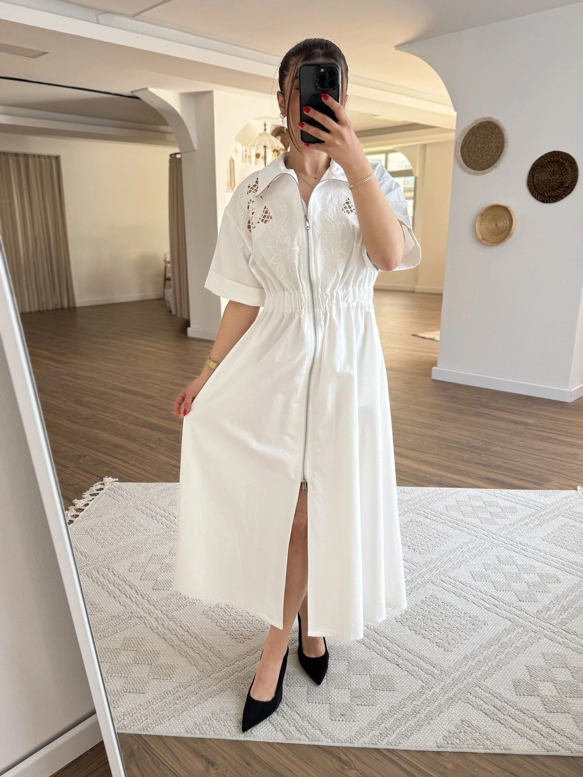 ÜST NAKIŞ TAM FERMUAR BEL BÜZGÜ LASTİK VİSKON UZUN ELBİSE – BEYAZ
