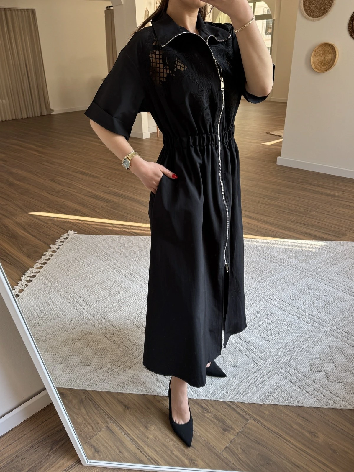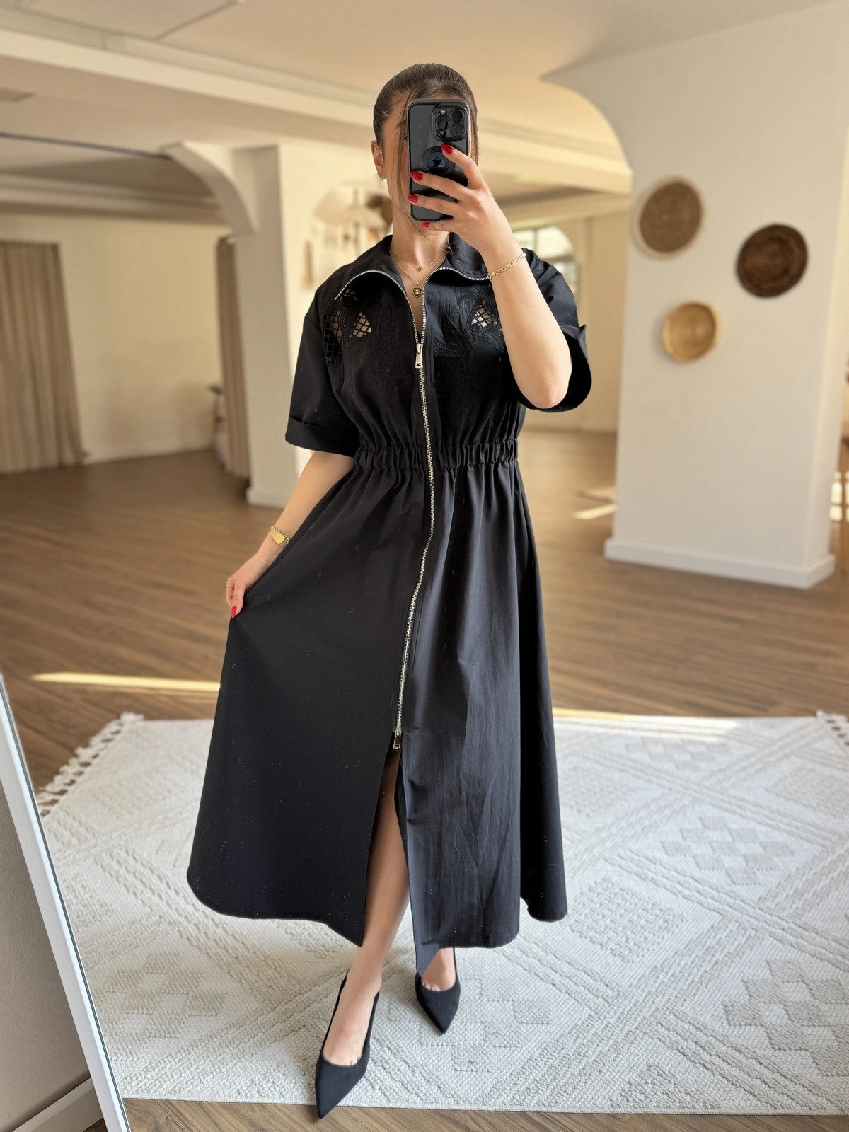 ÜST NAKIŞ TAM FERMUAR BEL BÜZGÜ LASTİK VİSKON UZUN ELBİSE – SİYAH