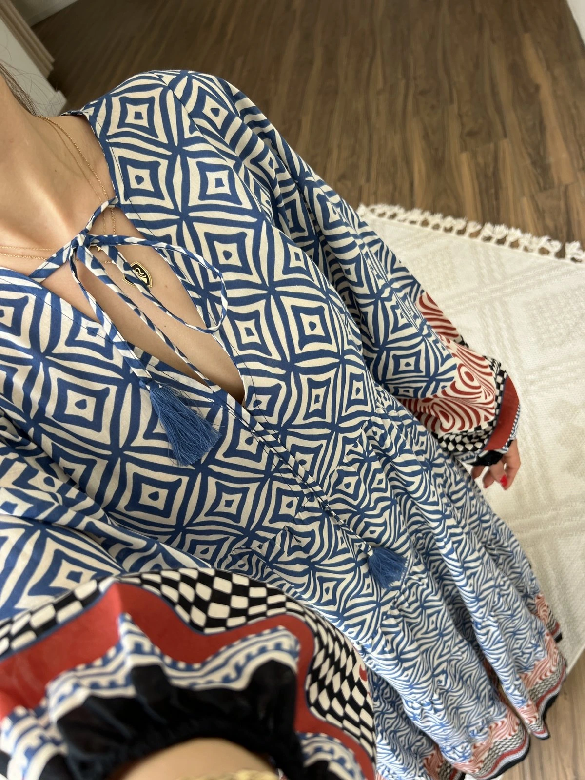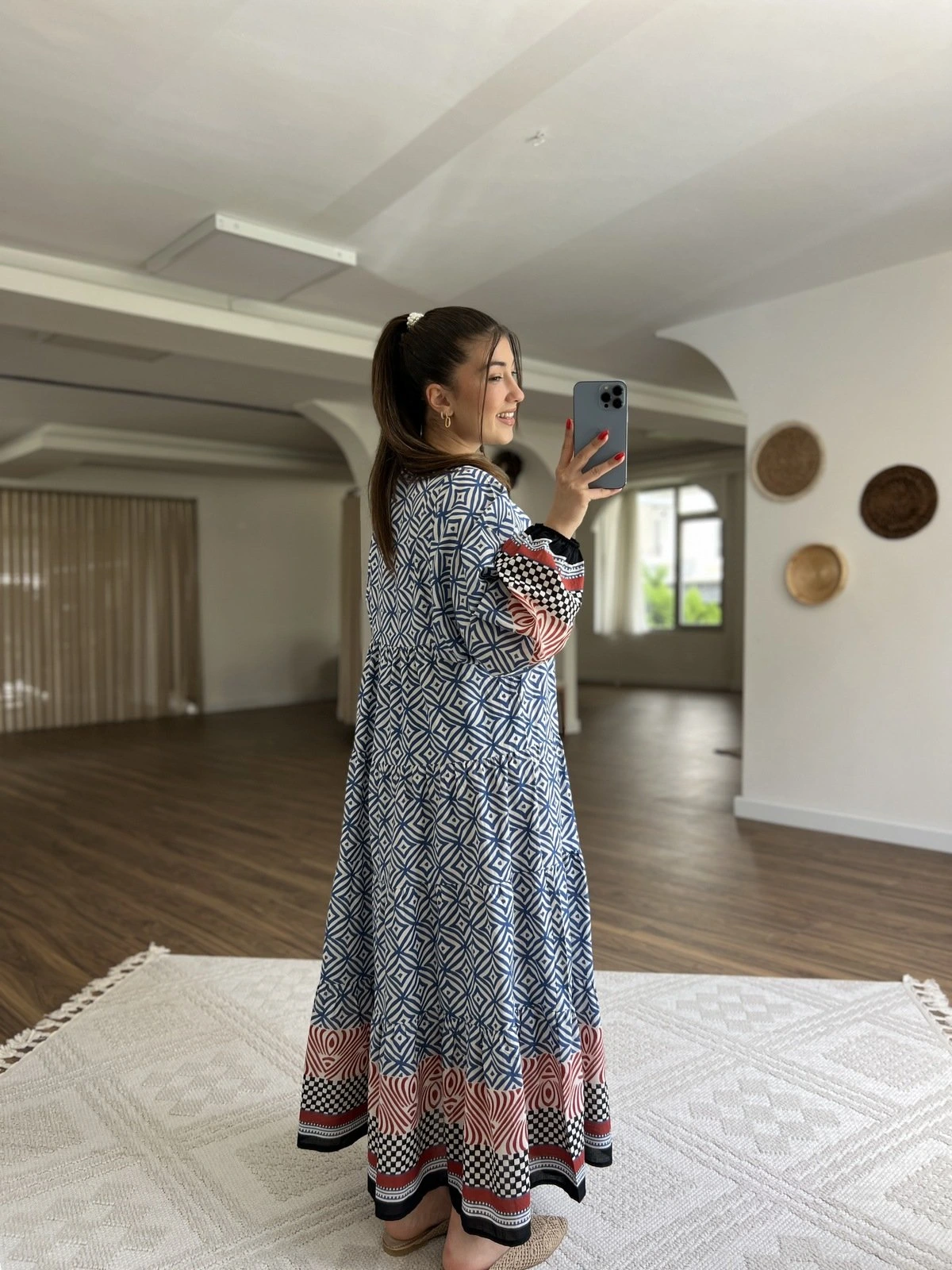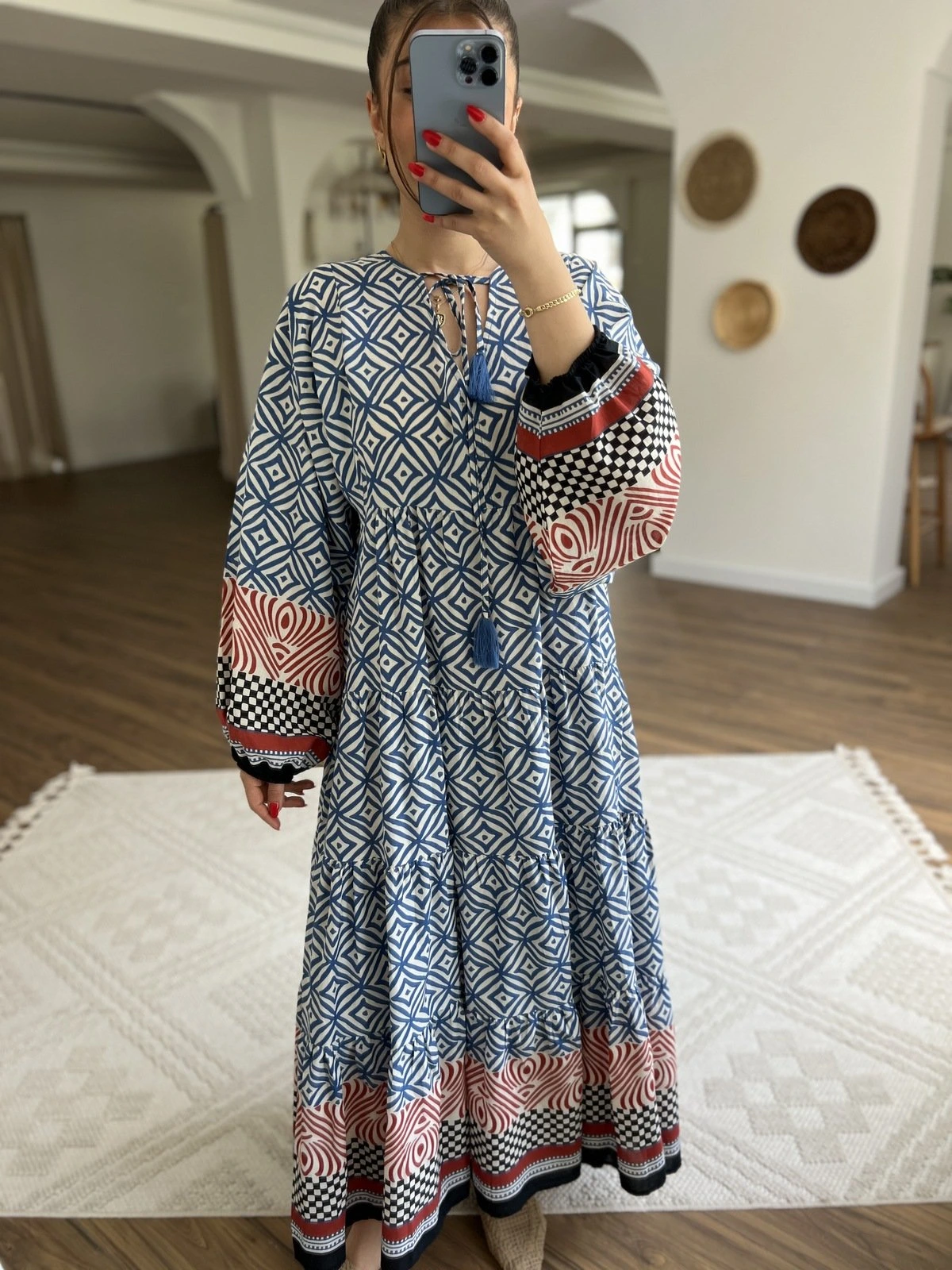 V YAKA BAĞ İPLİ DESENLİ UZUN PAMUK ELBİSE – MAVİ