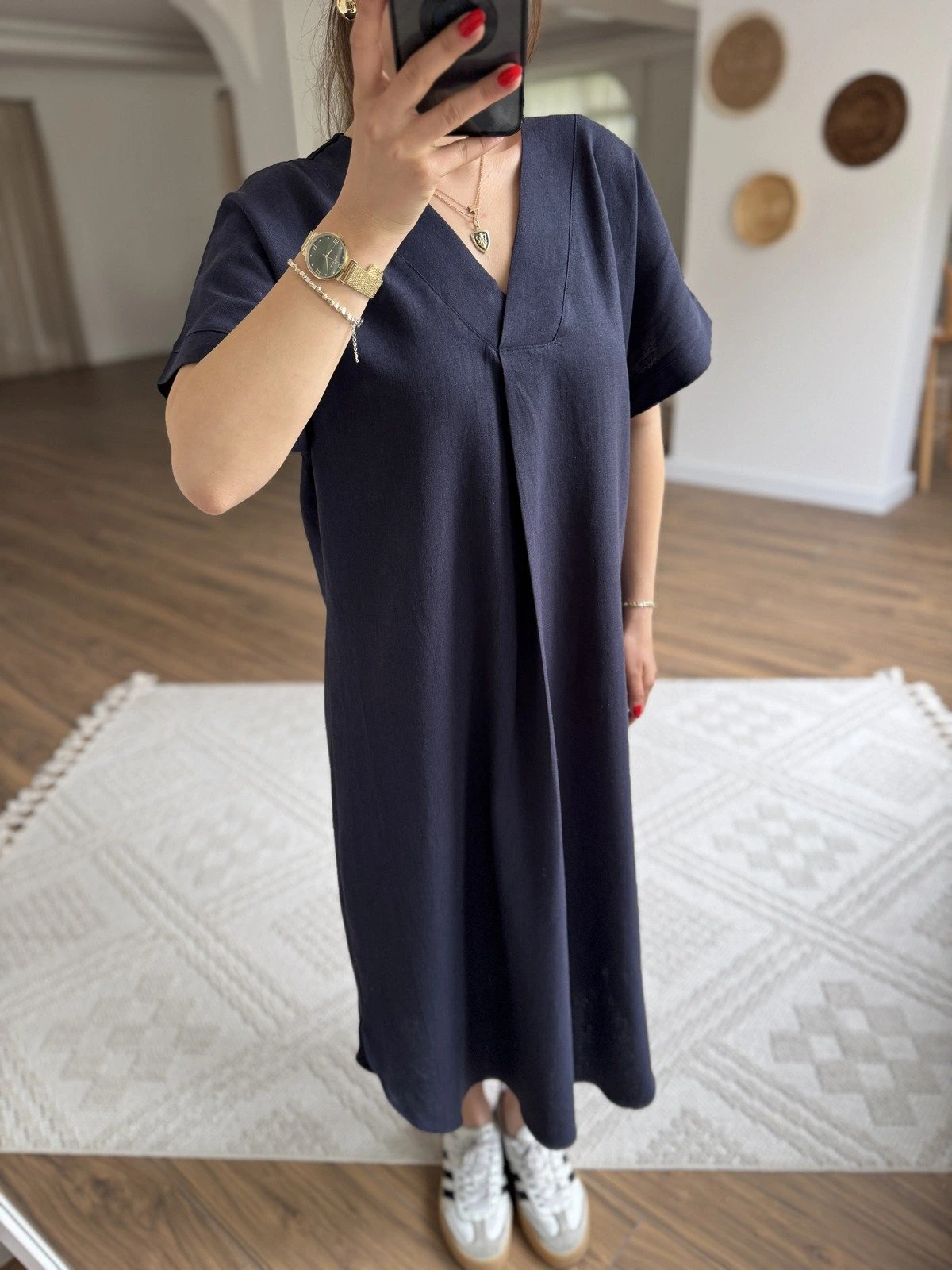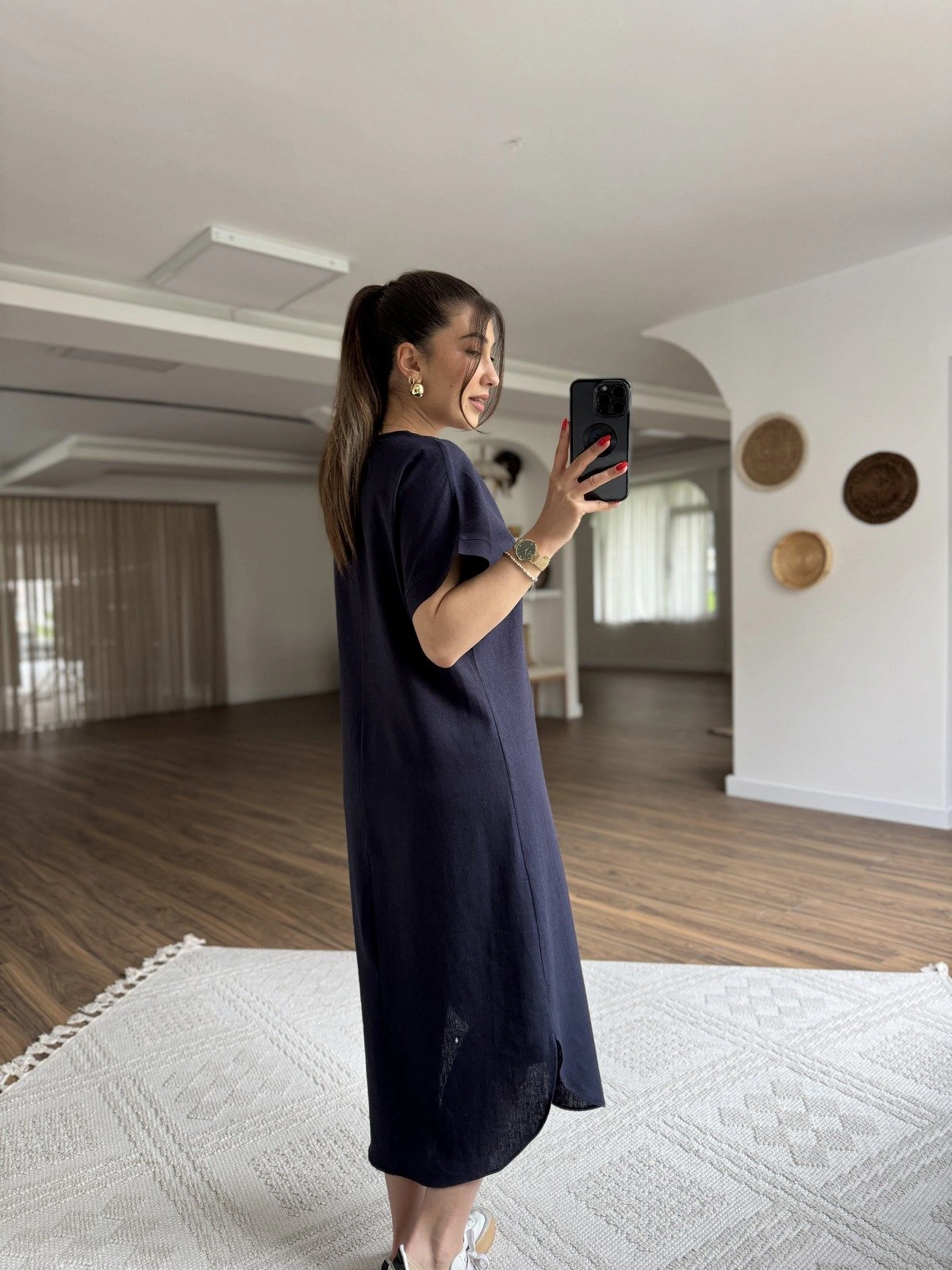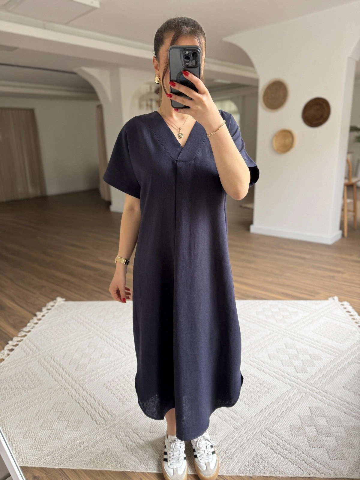 V YAKA DÜŞÜK KOL ETEĞİ OVAL KETEN ELBİSE – LACİVERT