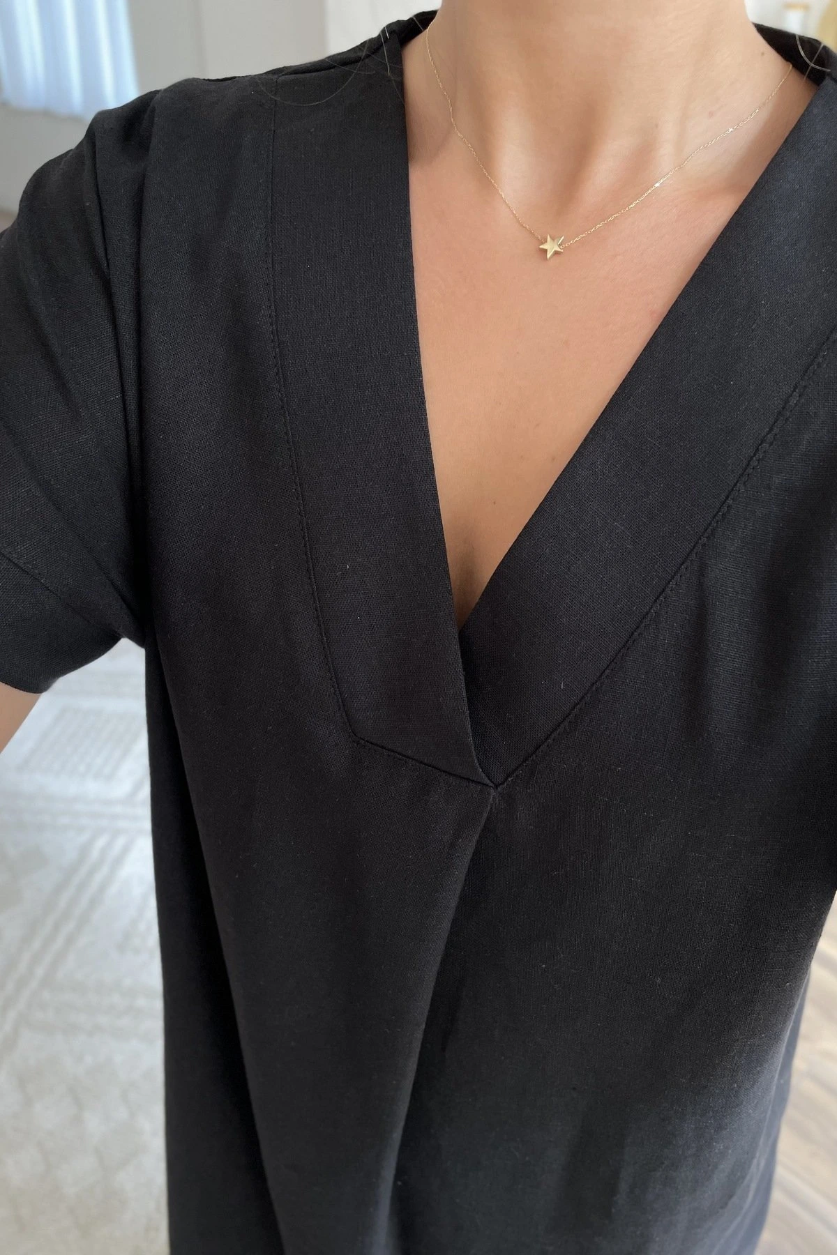 V YAKA ETEĞİ OVAL SALAŞ KETEN KISA KOL ELBİSE – SİYAH