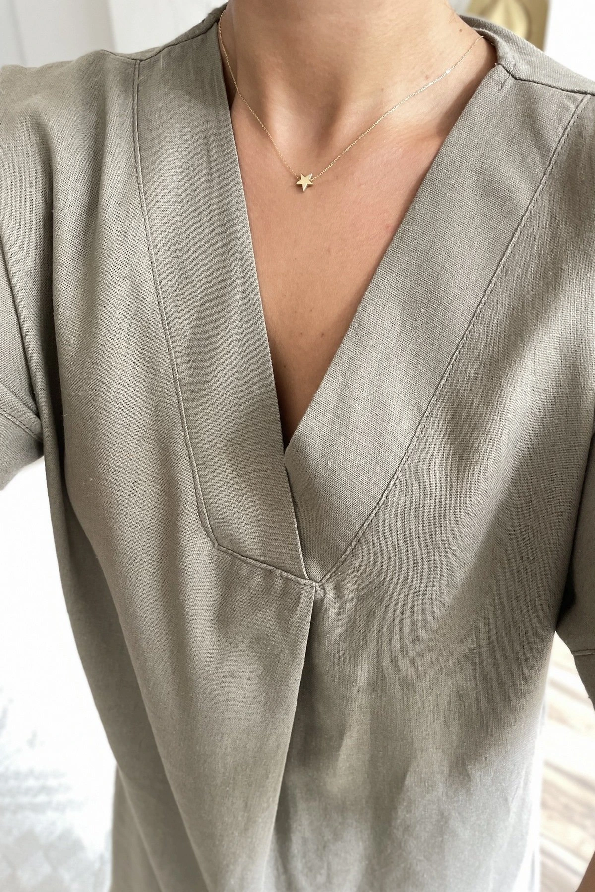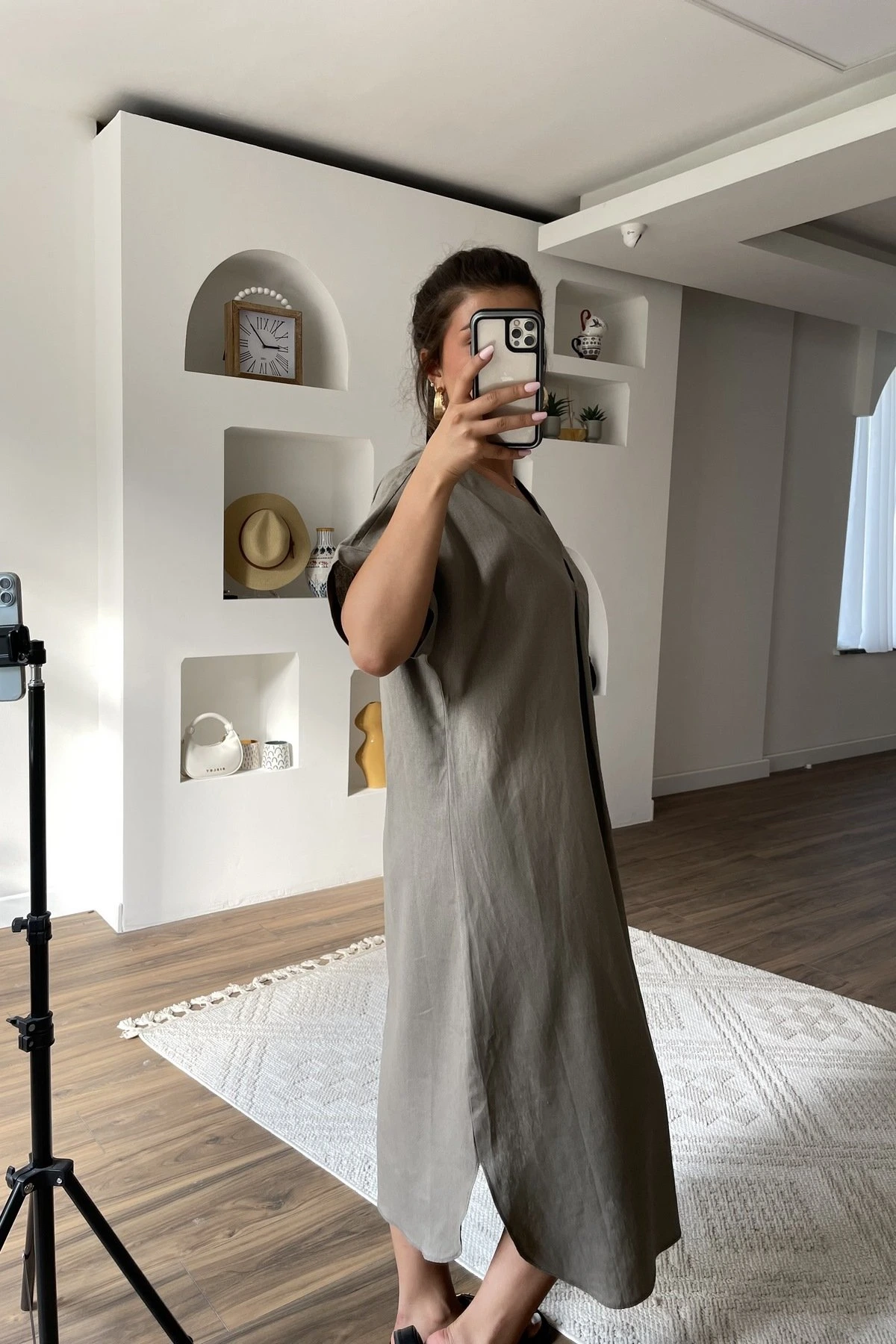 V YAKA ETEĞİ OVAL SALAŞ KETEN KISA KOL ELBİSE – VİZON
