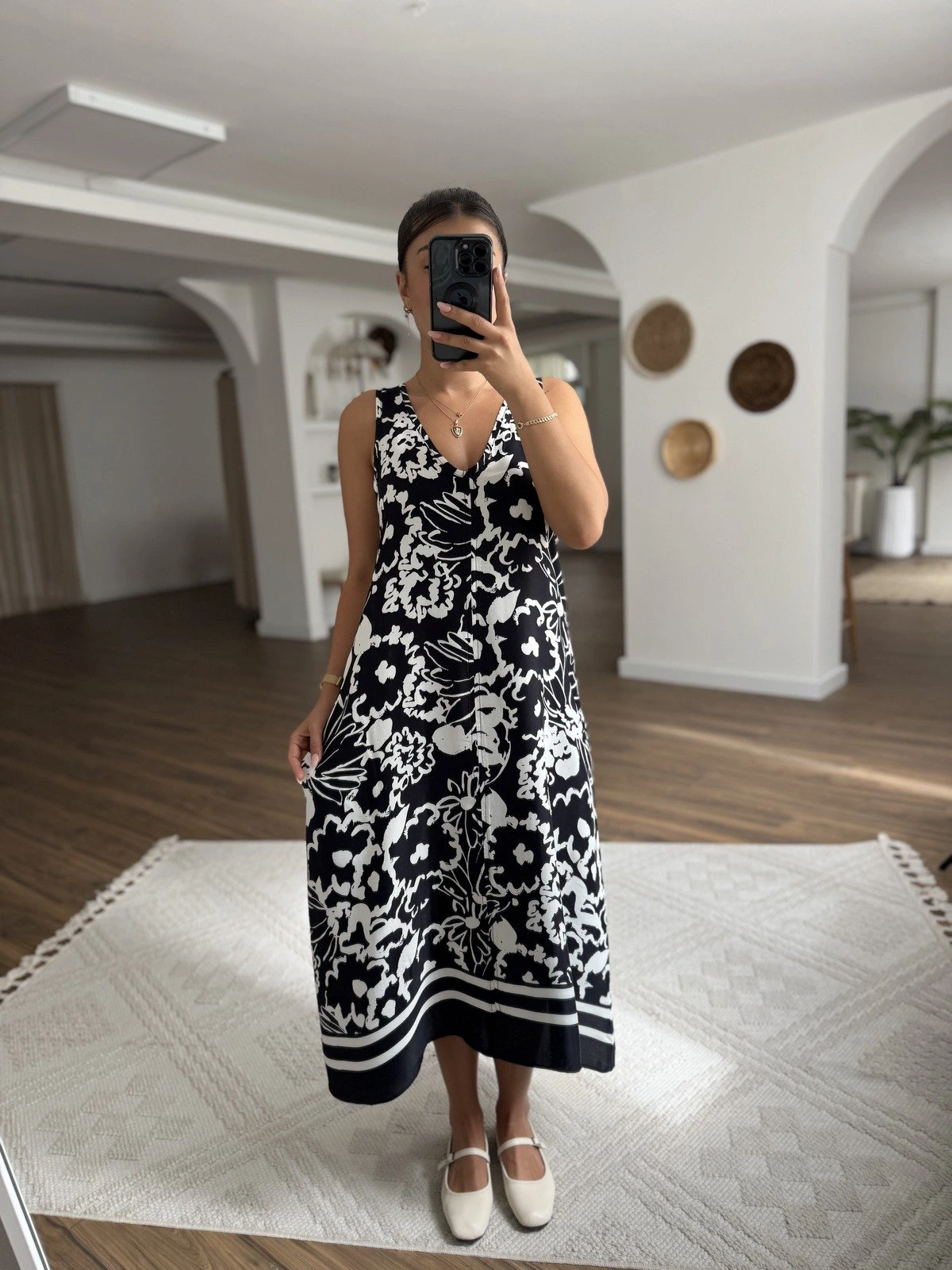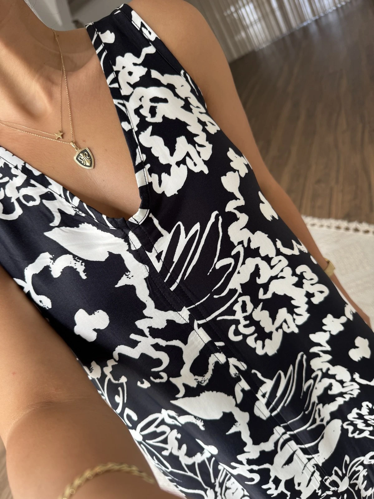 V YAKA ÖN DİKİŞ CEPLİ DESENLİ SATEN ELBİSE – SİYAH BEYAZ