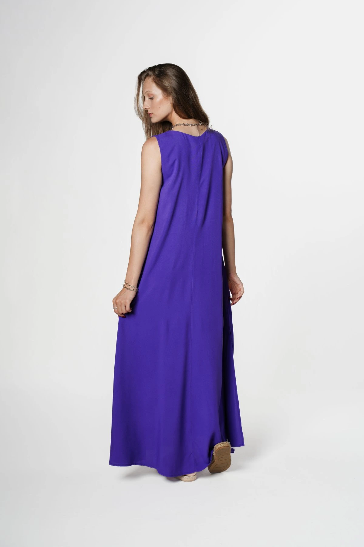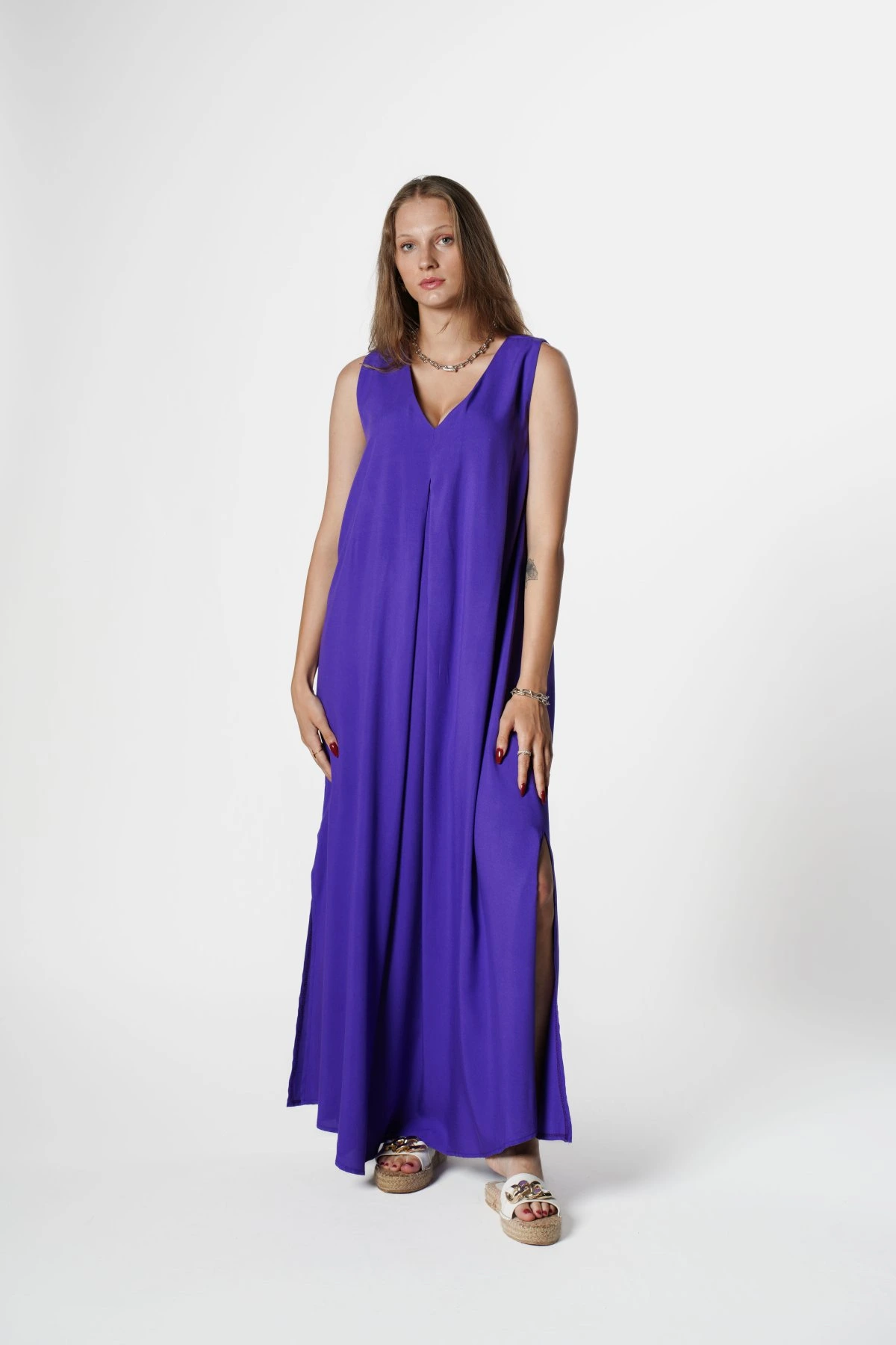 V YAKA ÖN PLİSE MAXİ BOY YAN YIRTMAÇ VİSKON ELBİSE – MOR