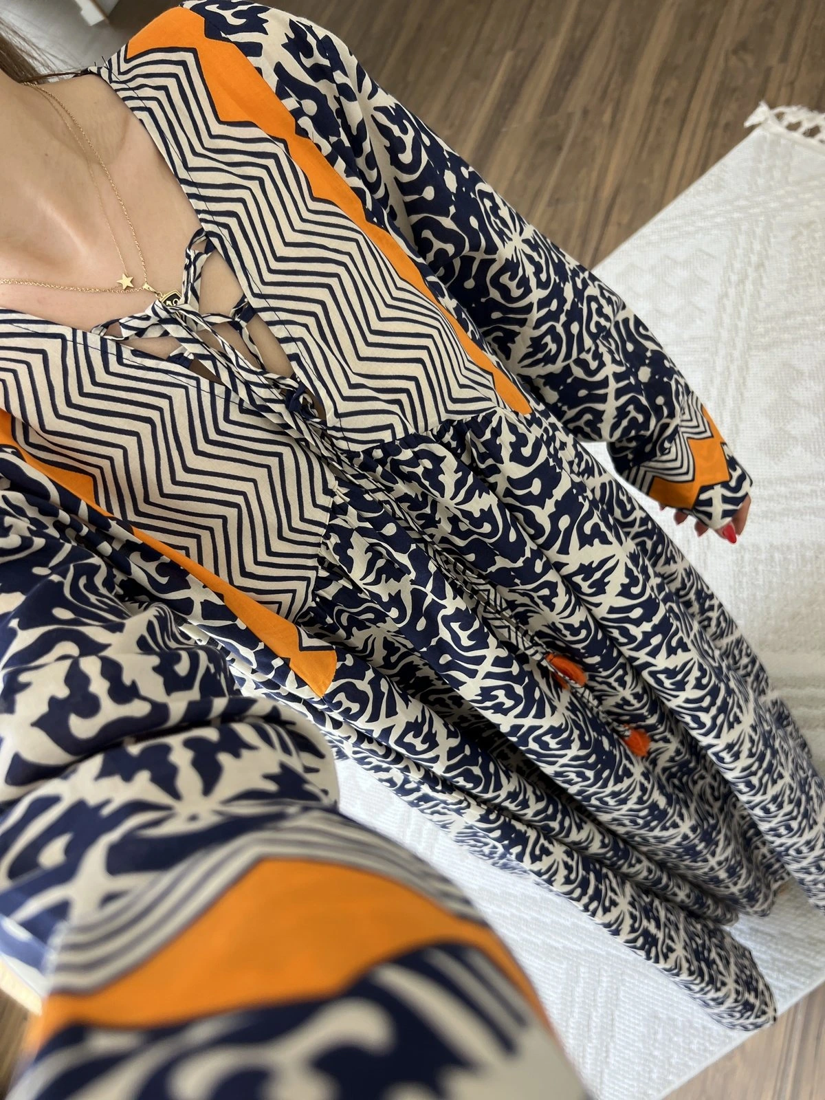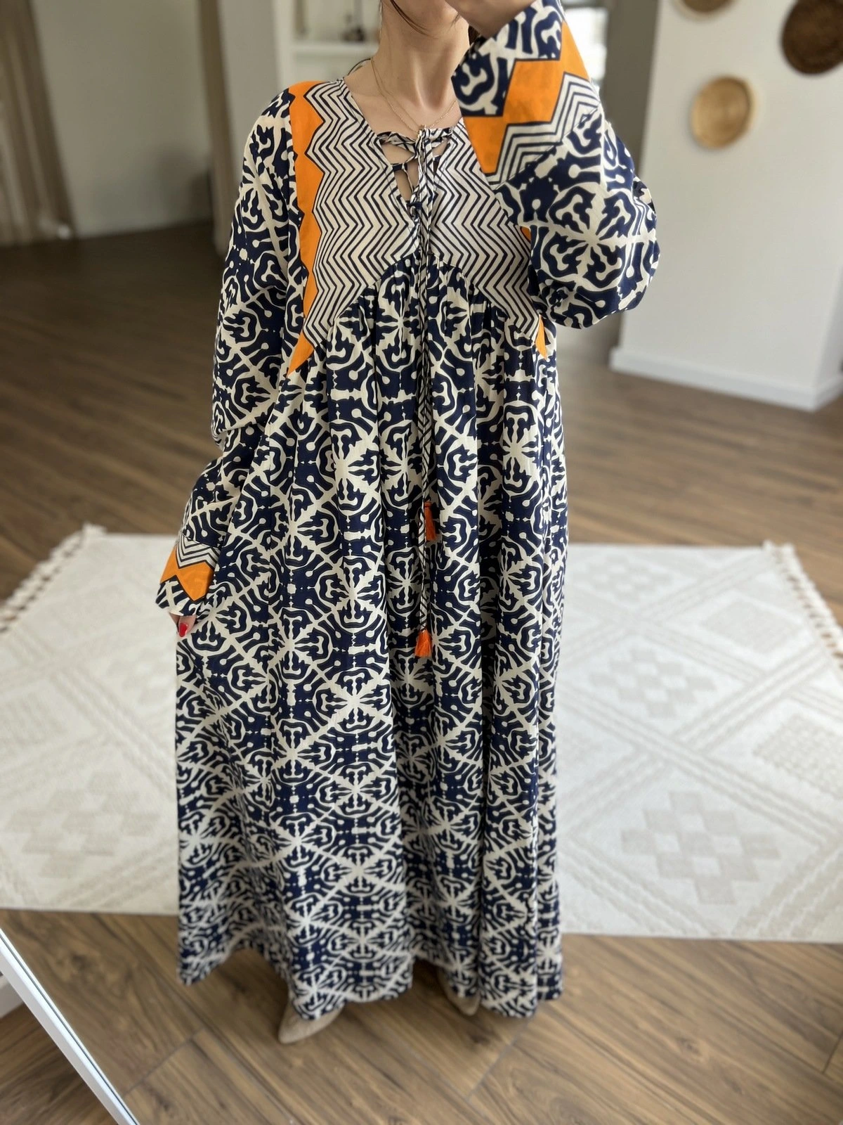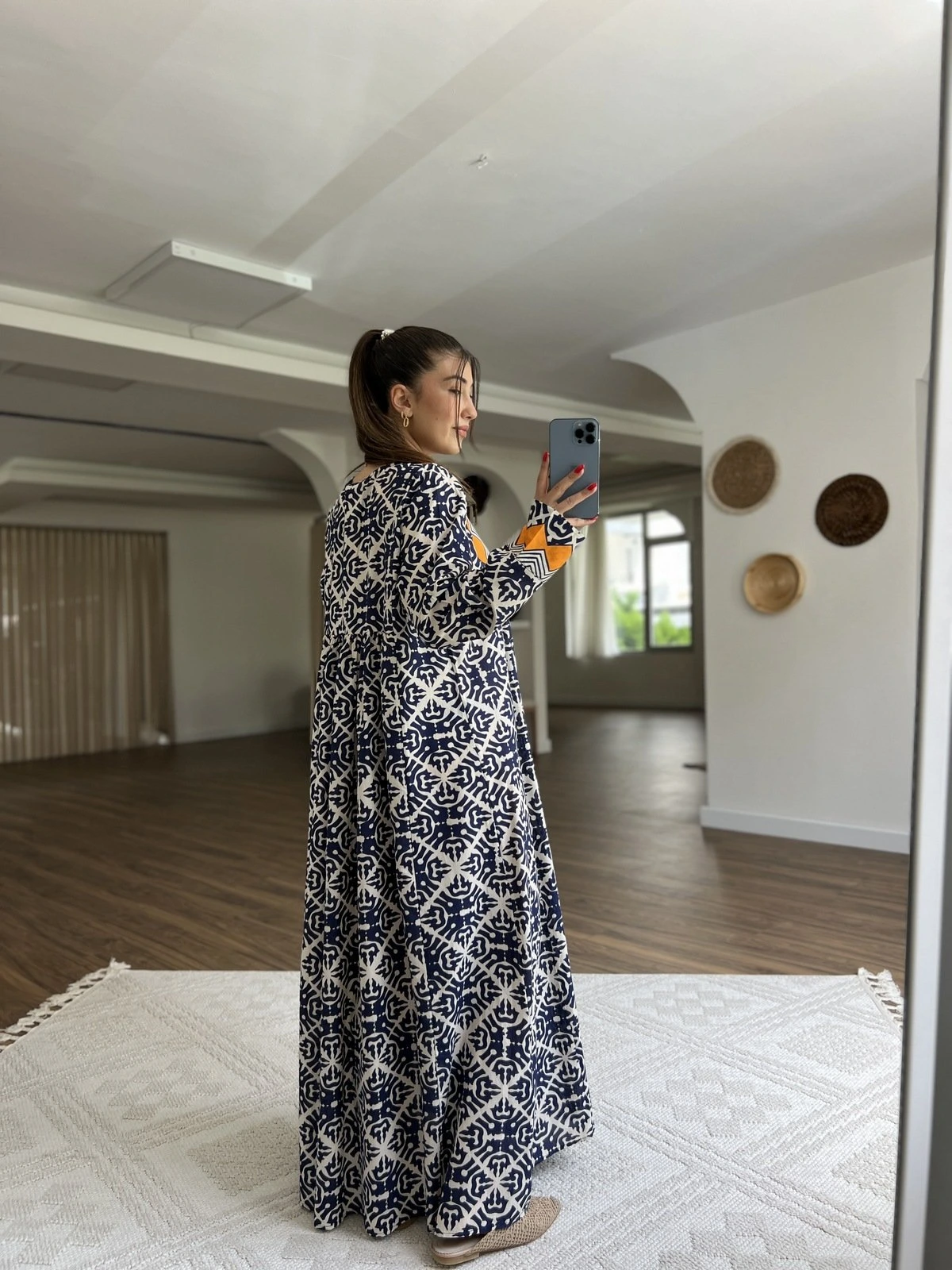 YAKA İP ŞERİT ROBADAN PİLE DESENLİ UZUN PAMUK ELBİSE – LACİVERT