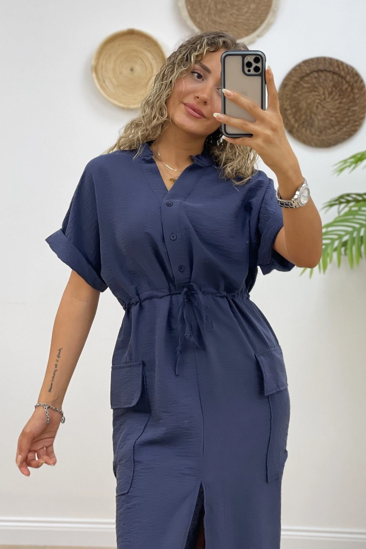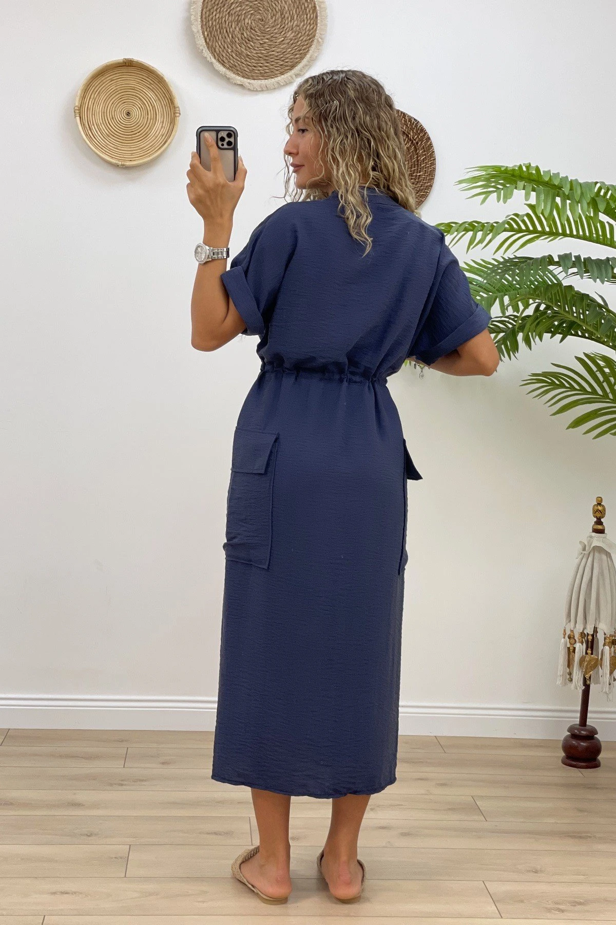 YAN CEP BEL BÜZGÜ YIRTMAÇLI UZUN ELBİSE – LACİVERT