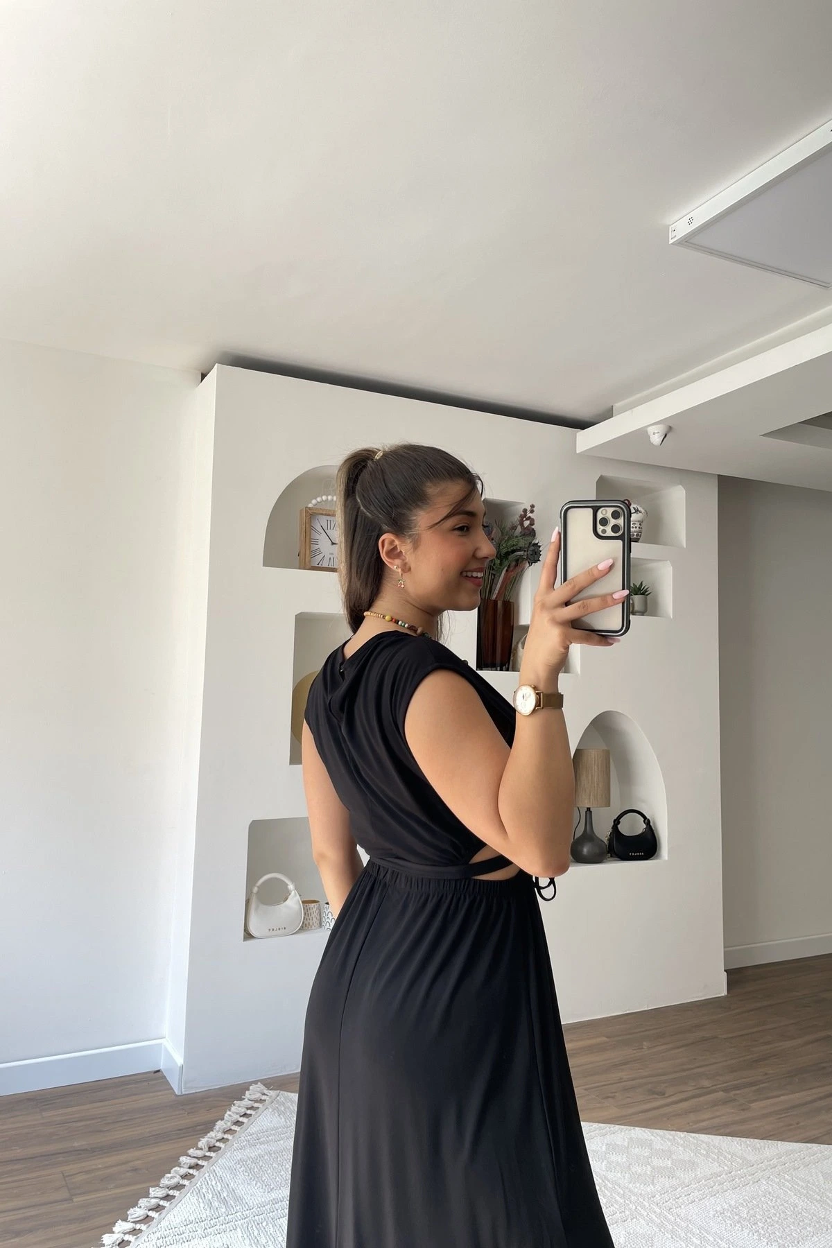 YAN DEKOLTE YIRTMAÇLI DÜŞÜK KOL VİSKON ELBİSE – SİYAH