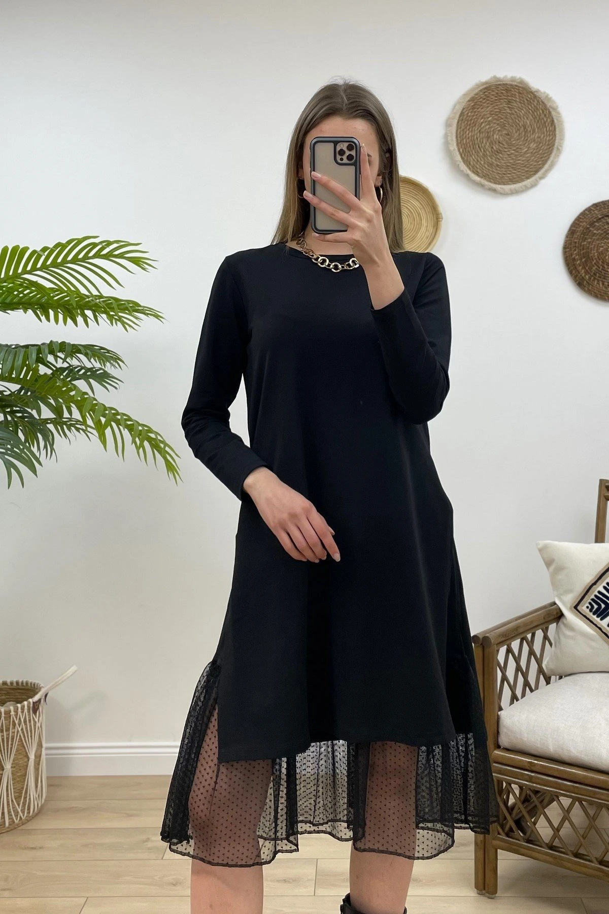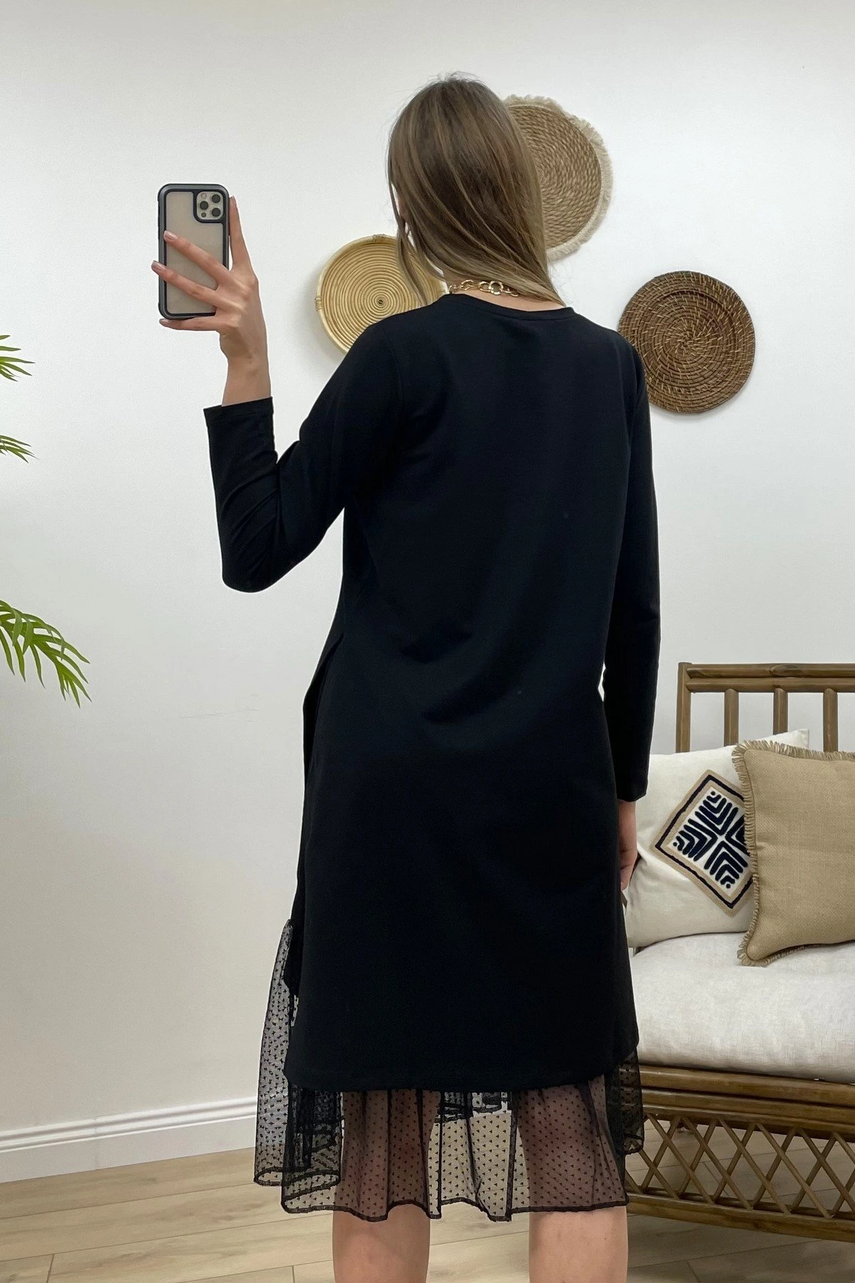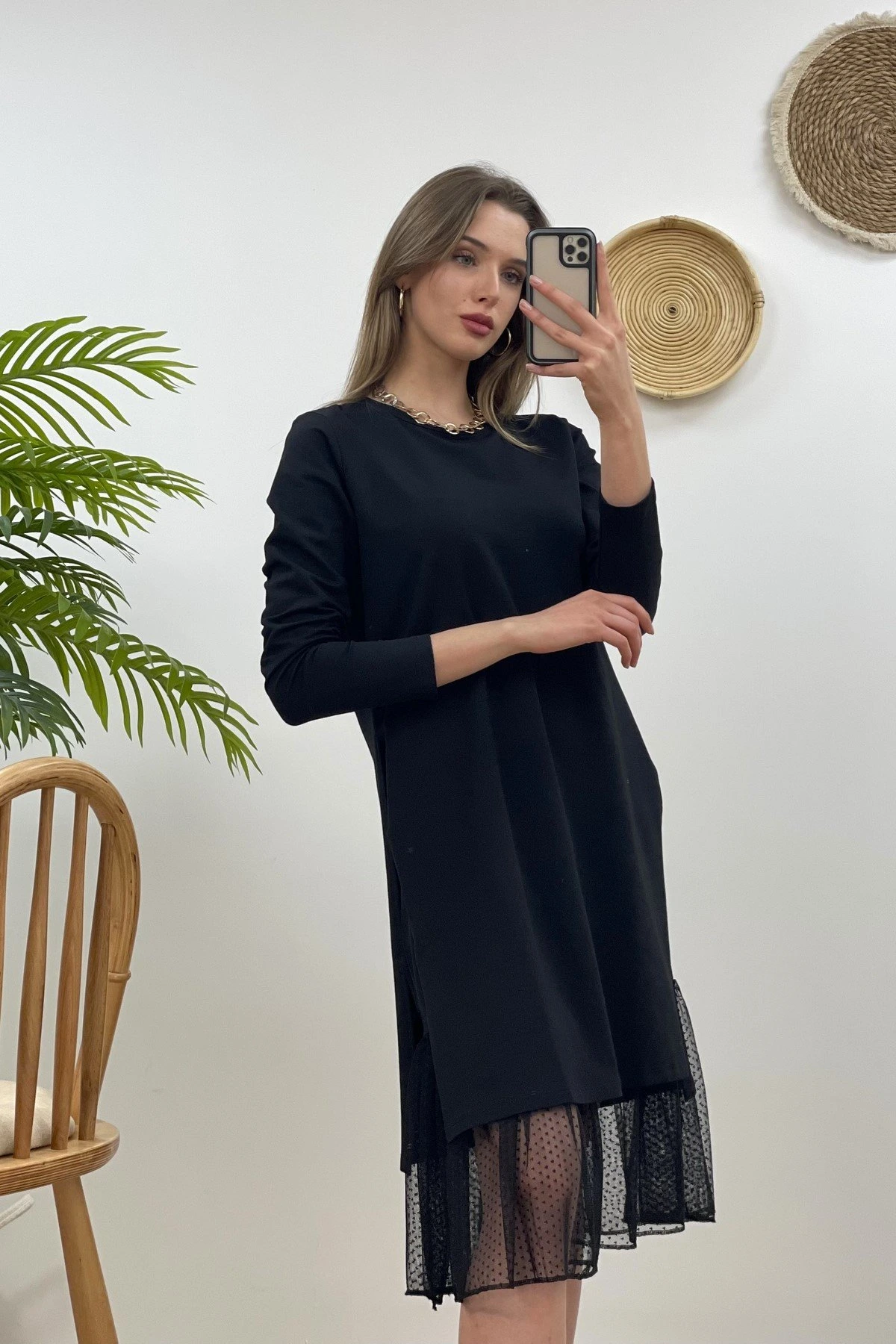 YANI AÇIK TÜL DETAY ELBİSE – SİYAH