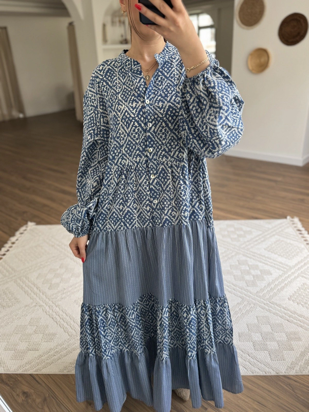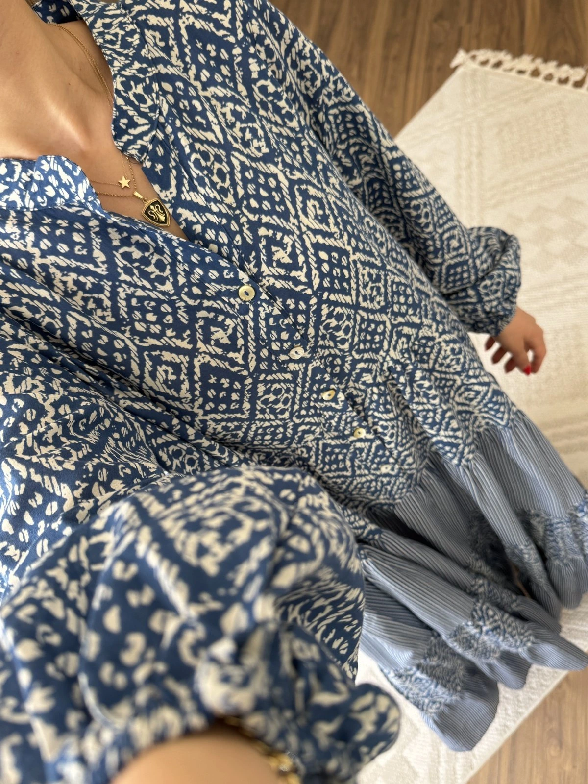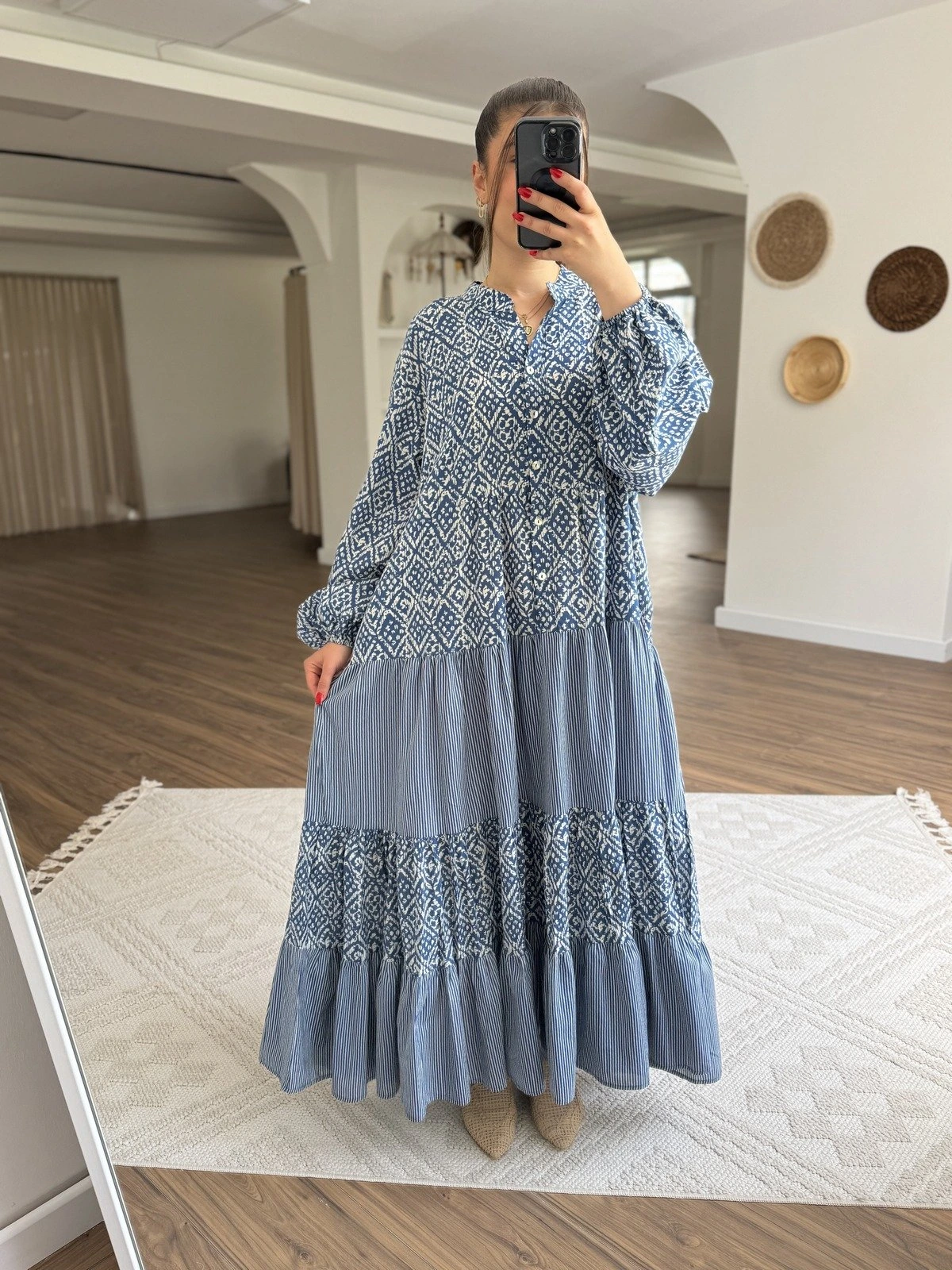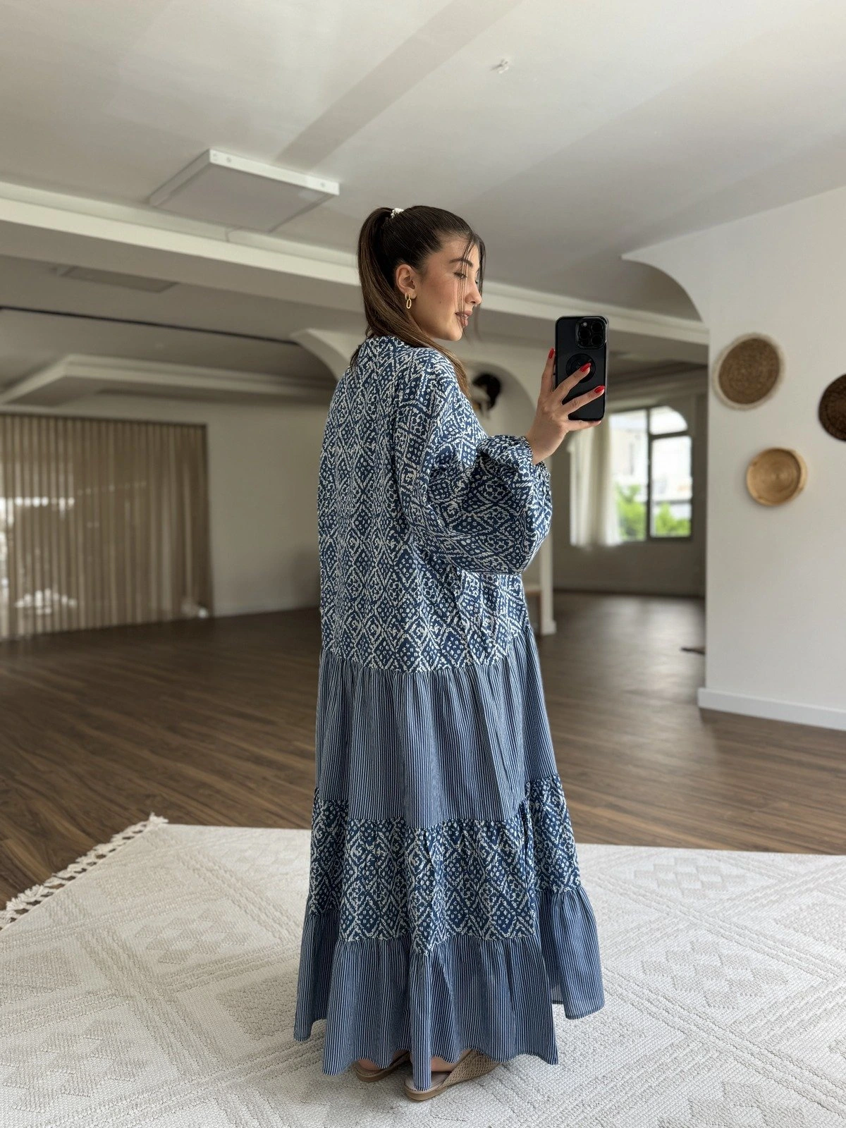 V YAKA BAĞ İPLİ DESENLİ UZUN PAMUK ELBİSE - MAVİ