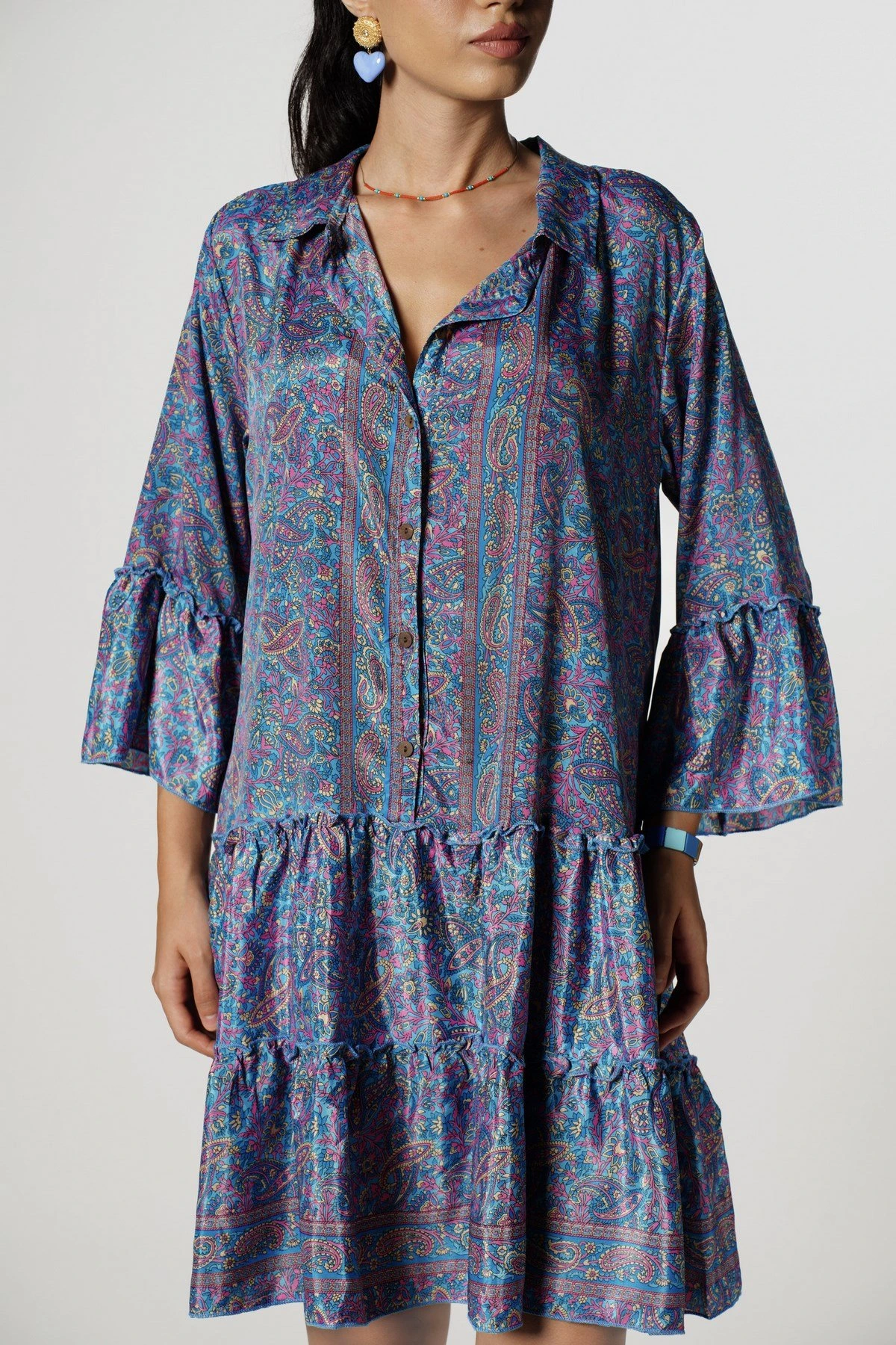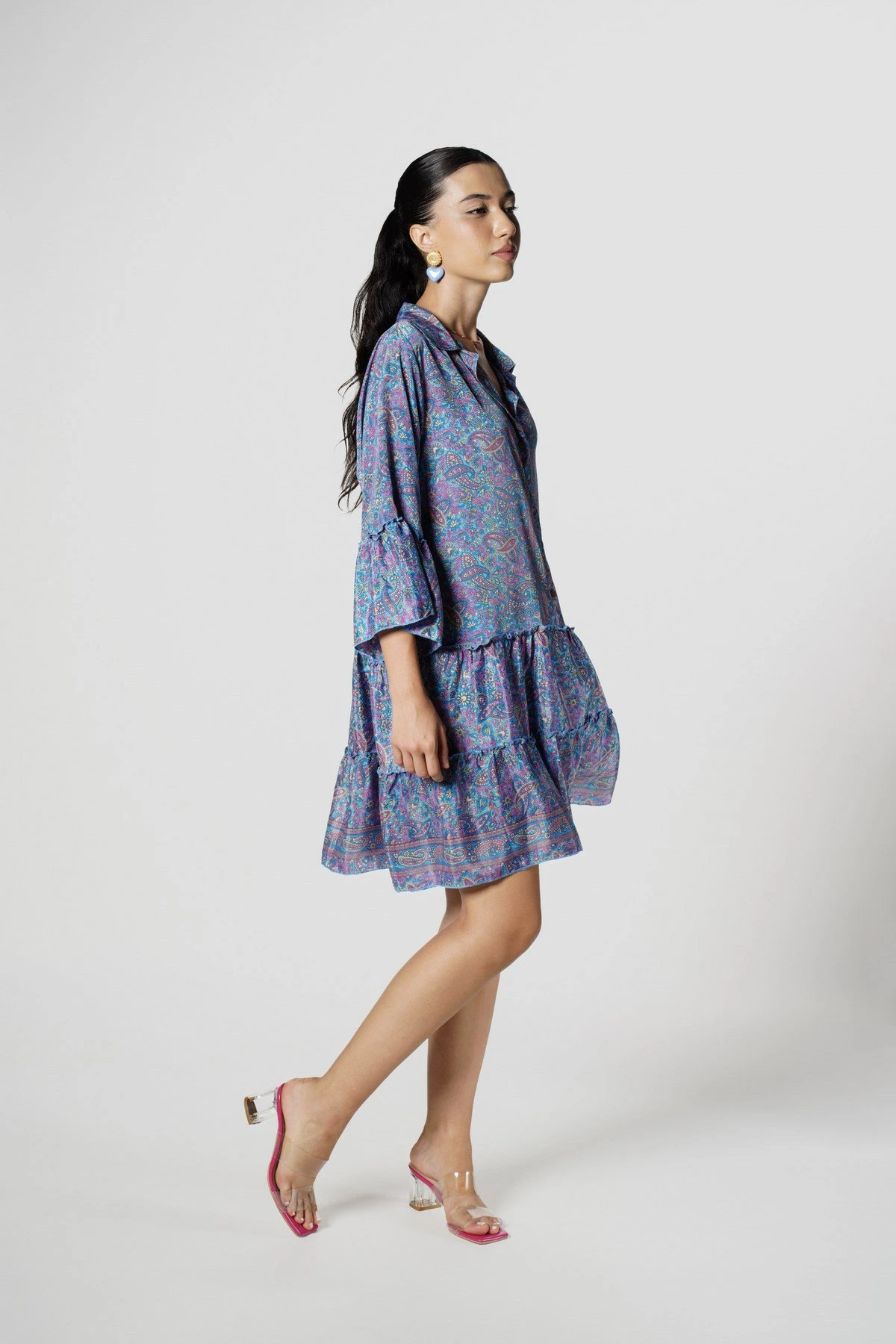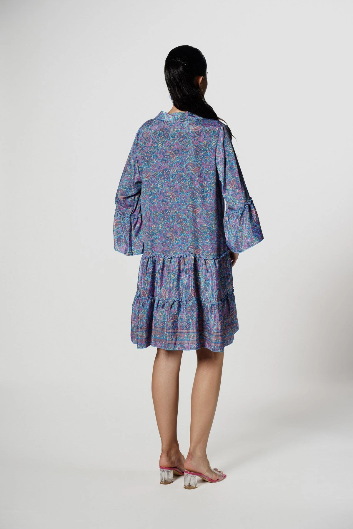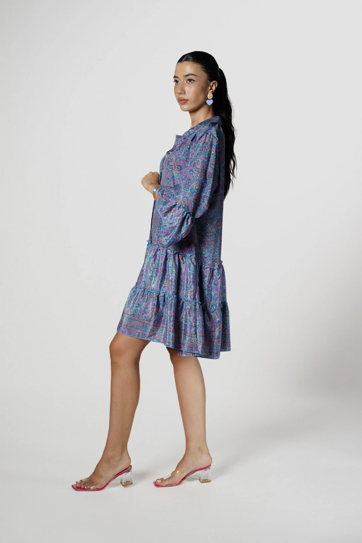 YARI PATLI KOL VE ETEĞİ KATLI RAHAT ELBİSE – MAVİ