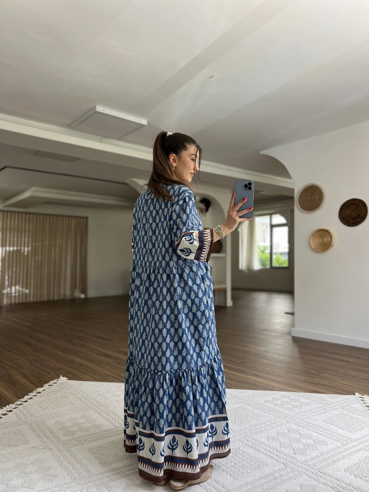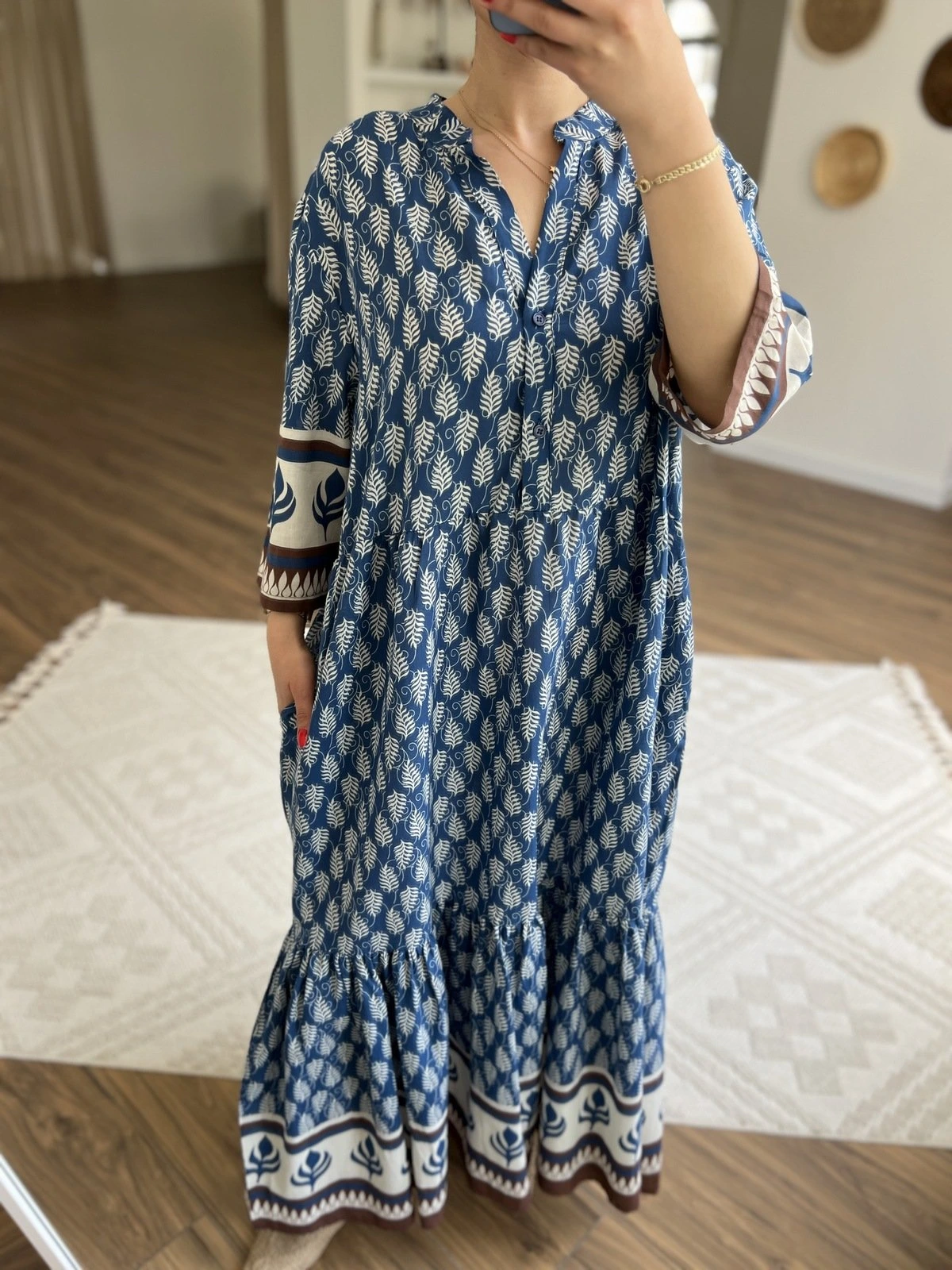 V YAKA BAĞ İPLİ DESENLİ UZUN PAMUK ELBİSE - MAVİ