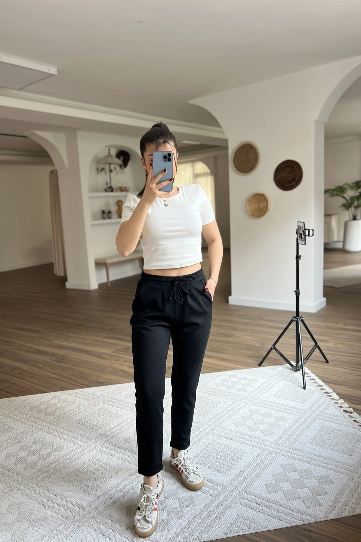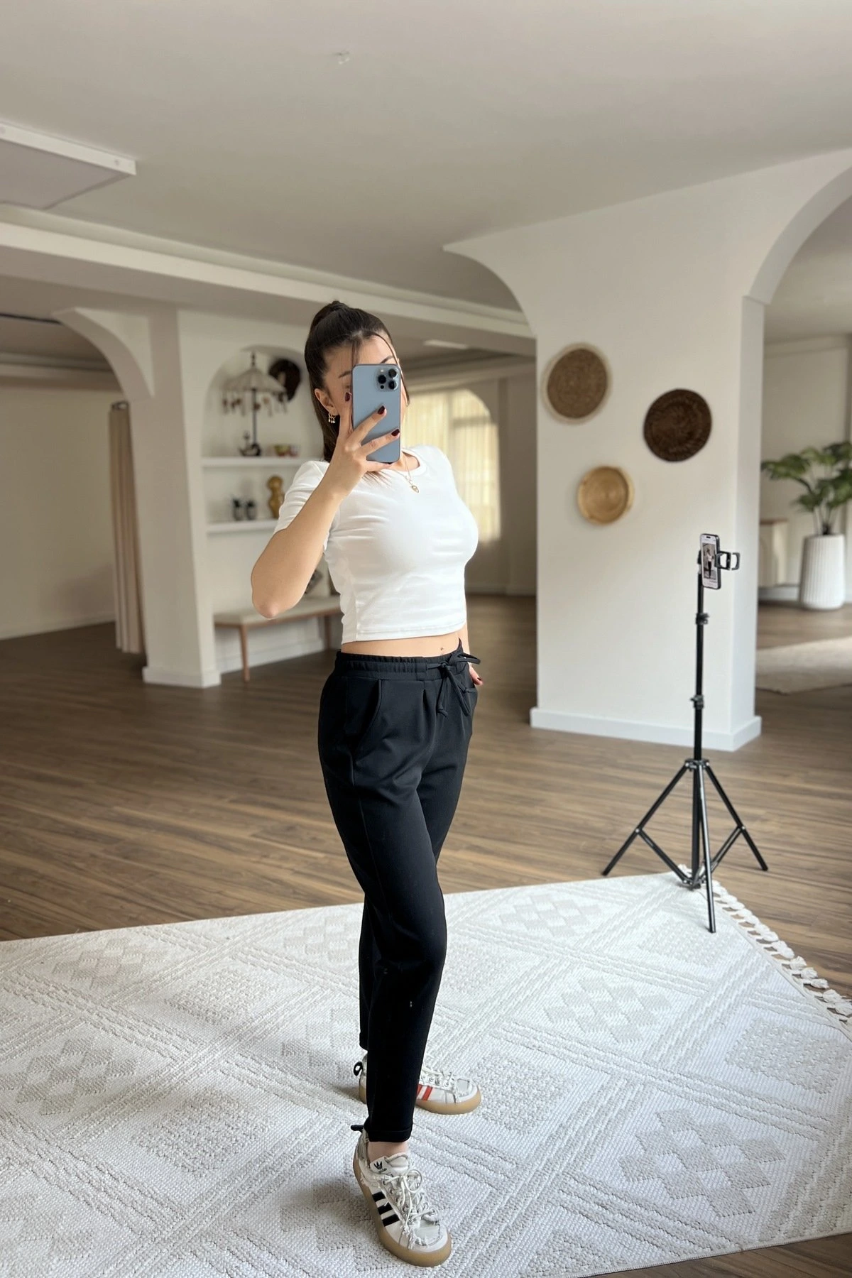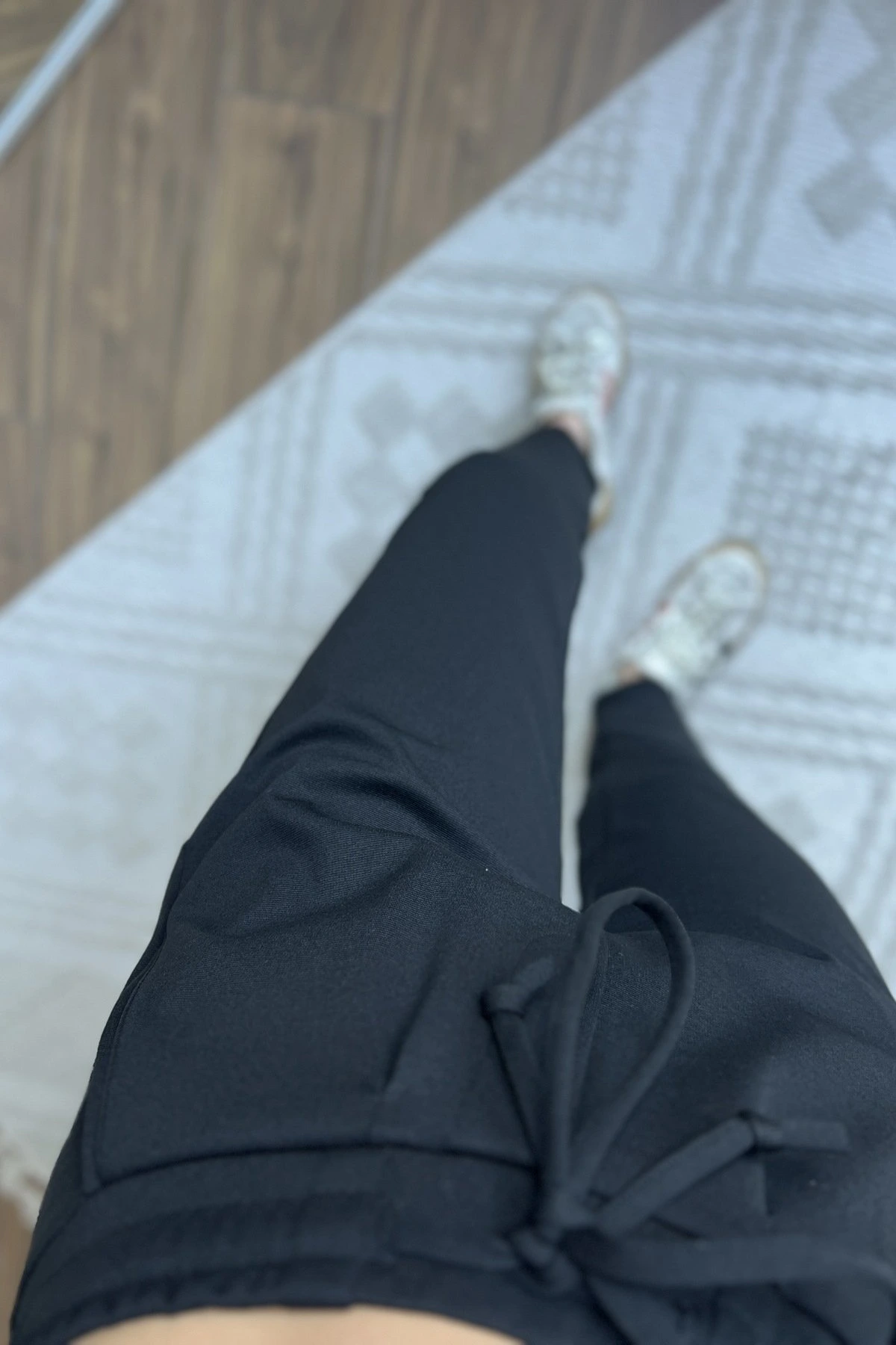 DUBLE PAÇA BEL LASTİK CEPLİ VİSKON EŞOFMAN – SİYAH