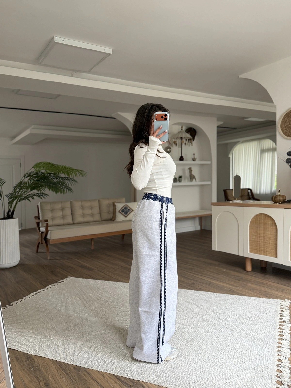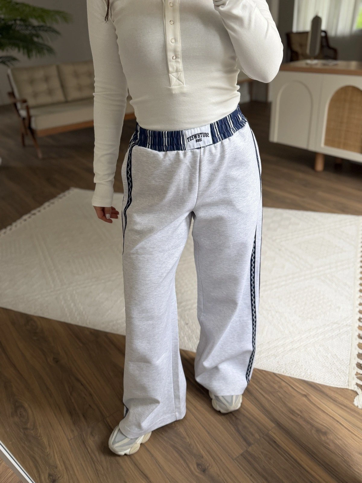 KENAR BİYE BEL YAZI DETAY EŞOFMAN – GRİ