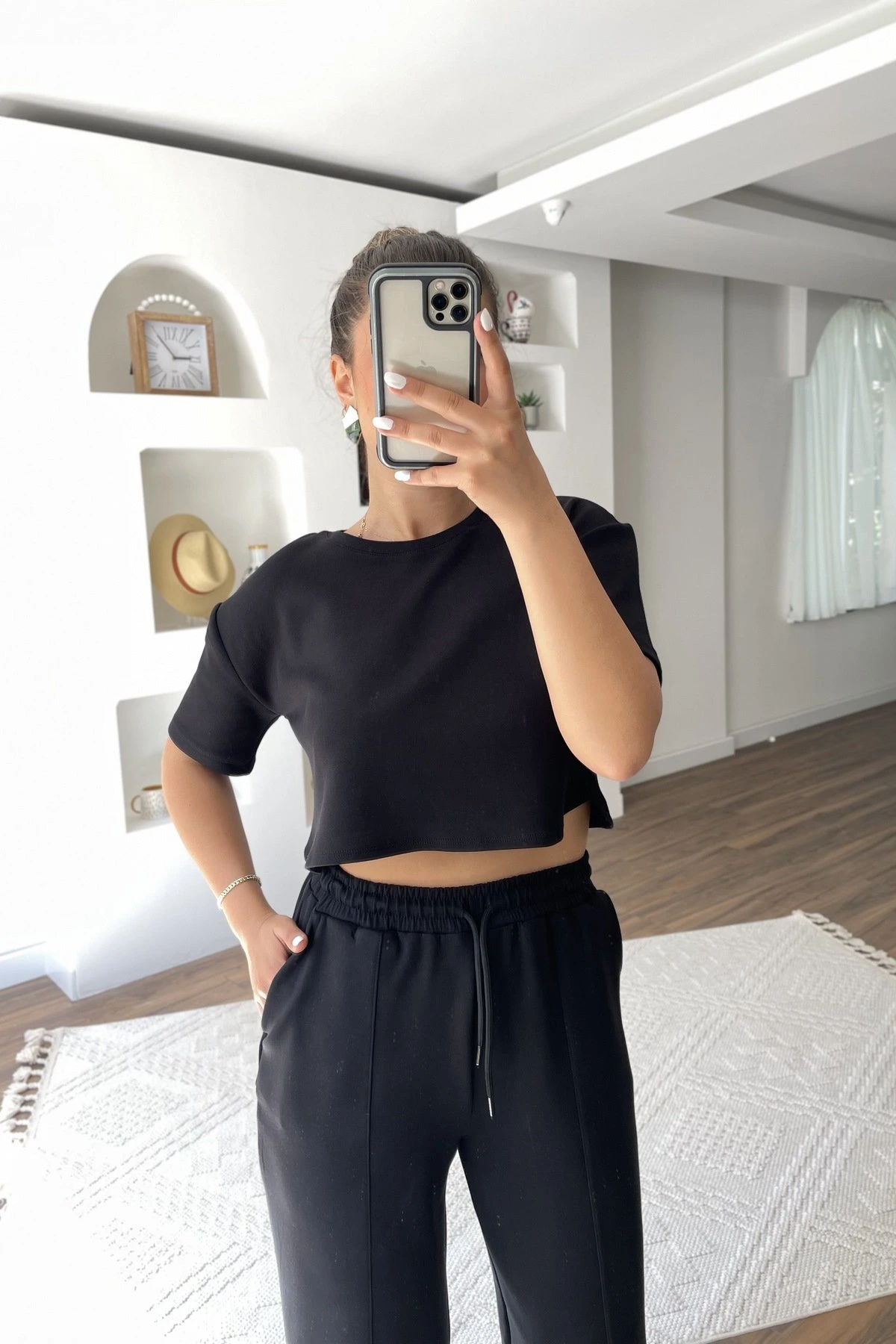 ÖN DİKİŞ CEPLİ BİLEK ÜSTÜ BALON MODAL EŞOFMAN – SİYAH