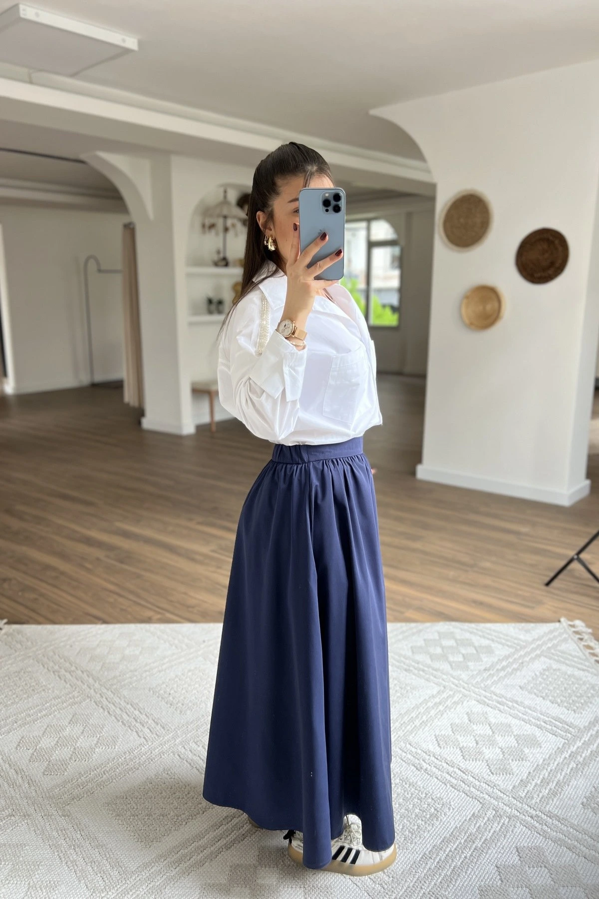 ARKA BEL LASTİK CEPLİ UZUN KLOŞ ETEK – LACİVERT
