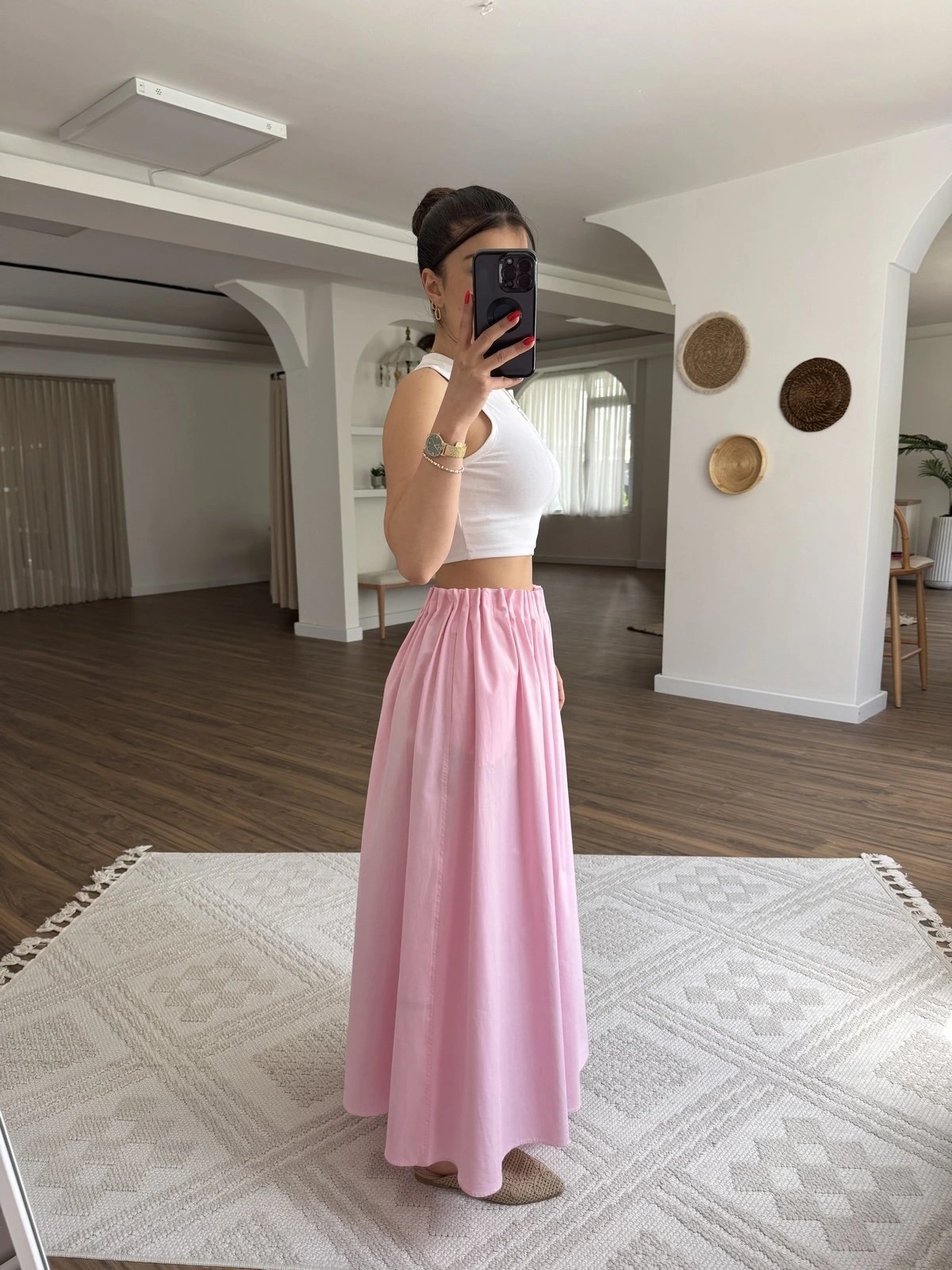 BEL FIRFIR LASTİK CEPLİ PAMUK UZUN ETEK – PEMBE