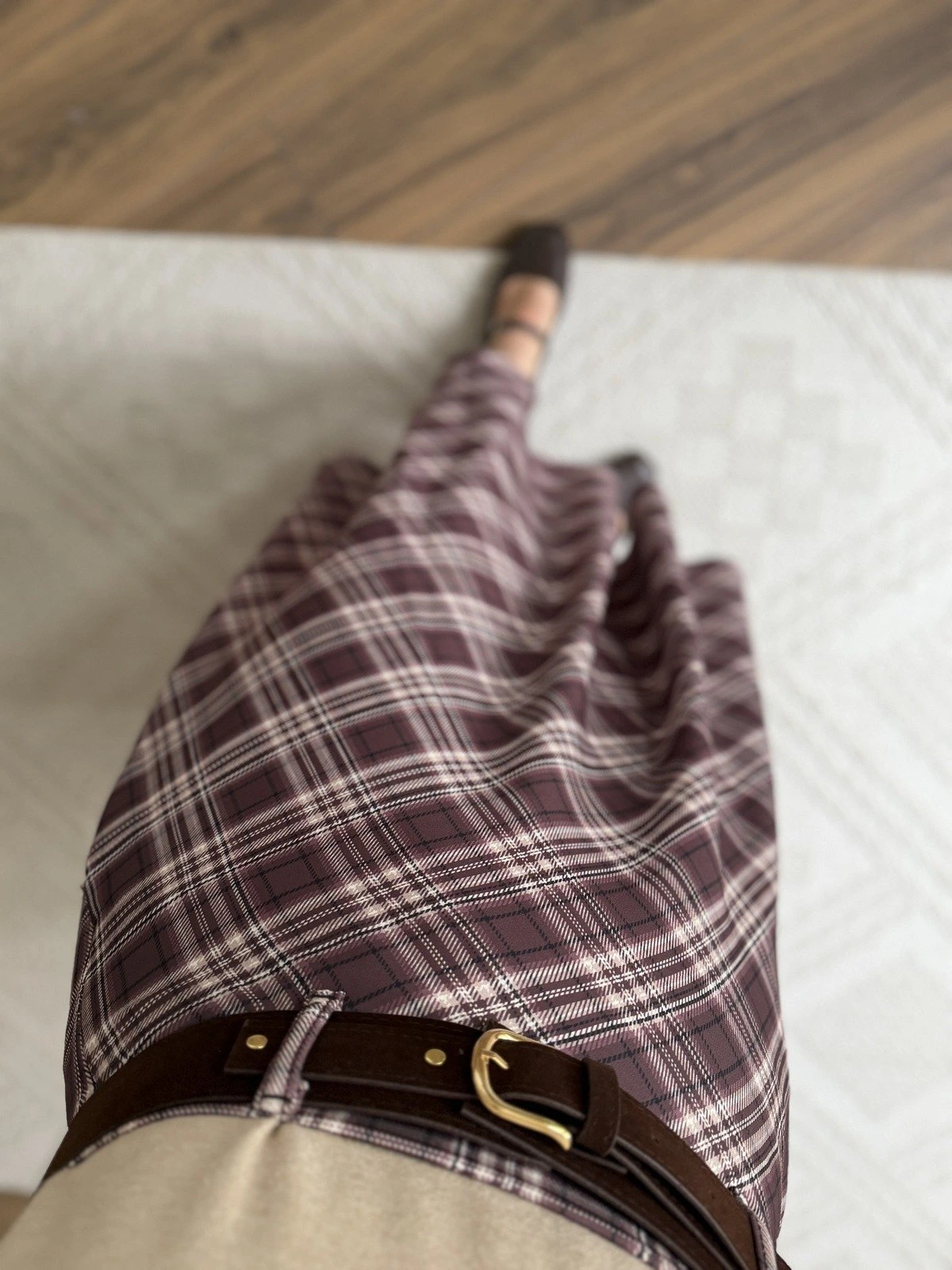 BEL KEMERLİ ASTARLI ÇİZGİLİ ETEK – KAHVE