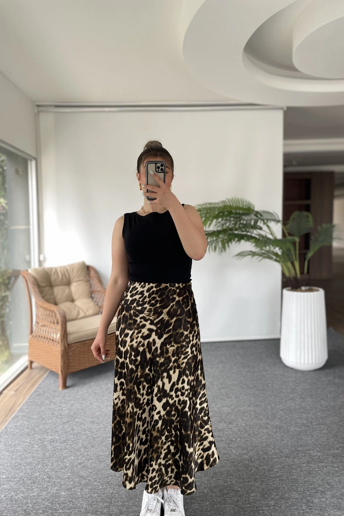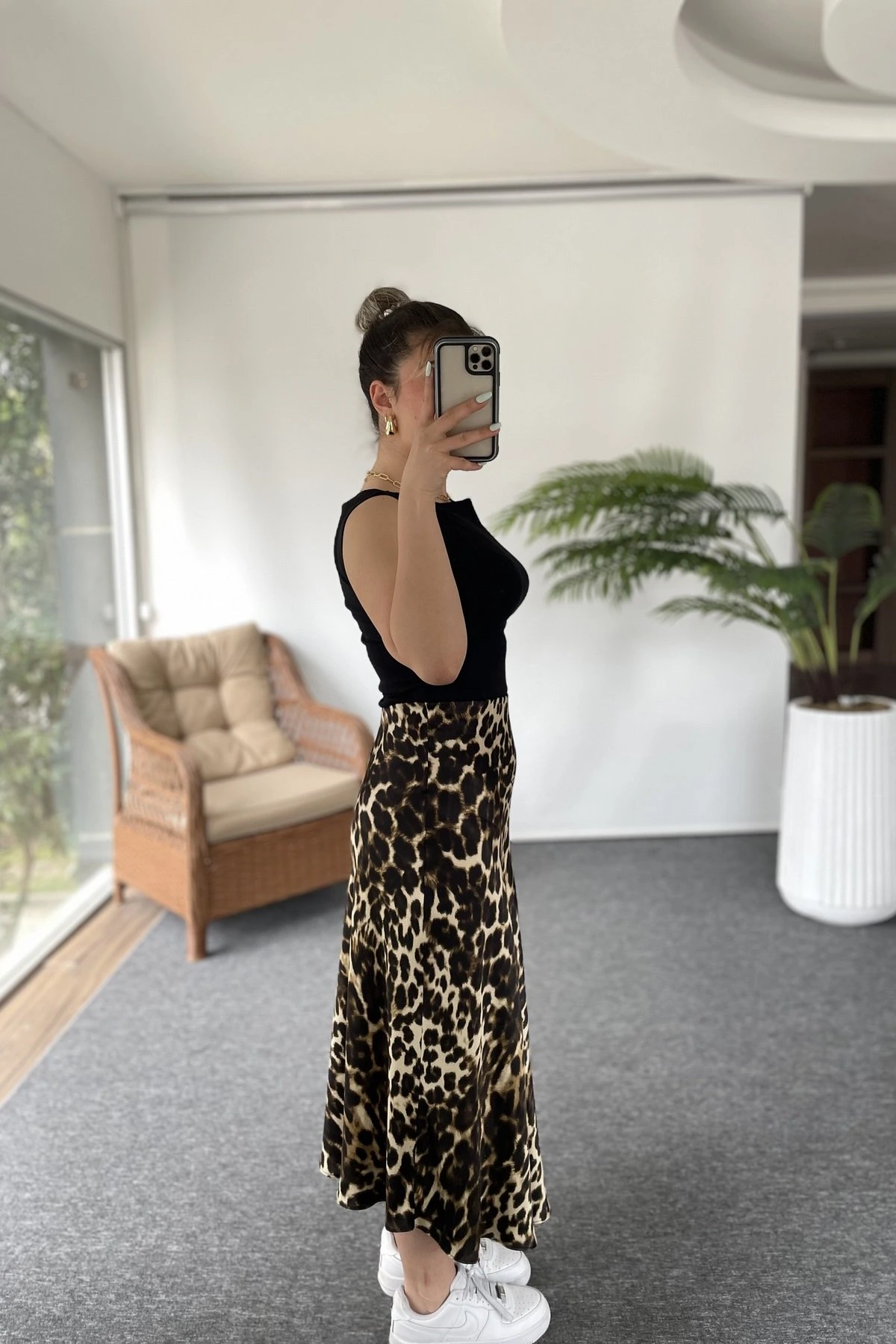BEL LASTİKLİ SATEN ETEK – BEJ LEOPAR