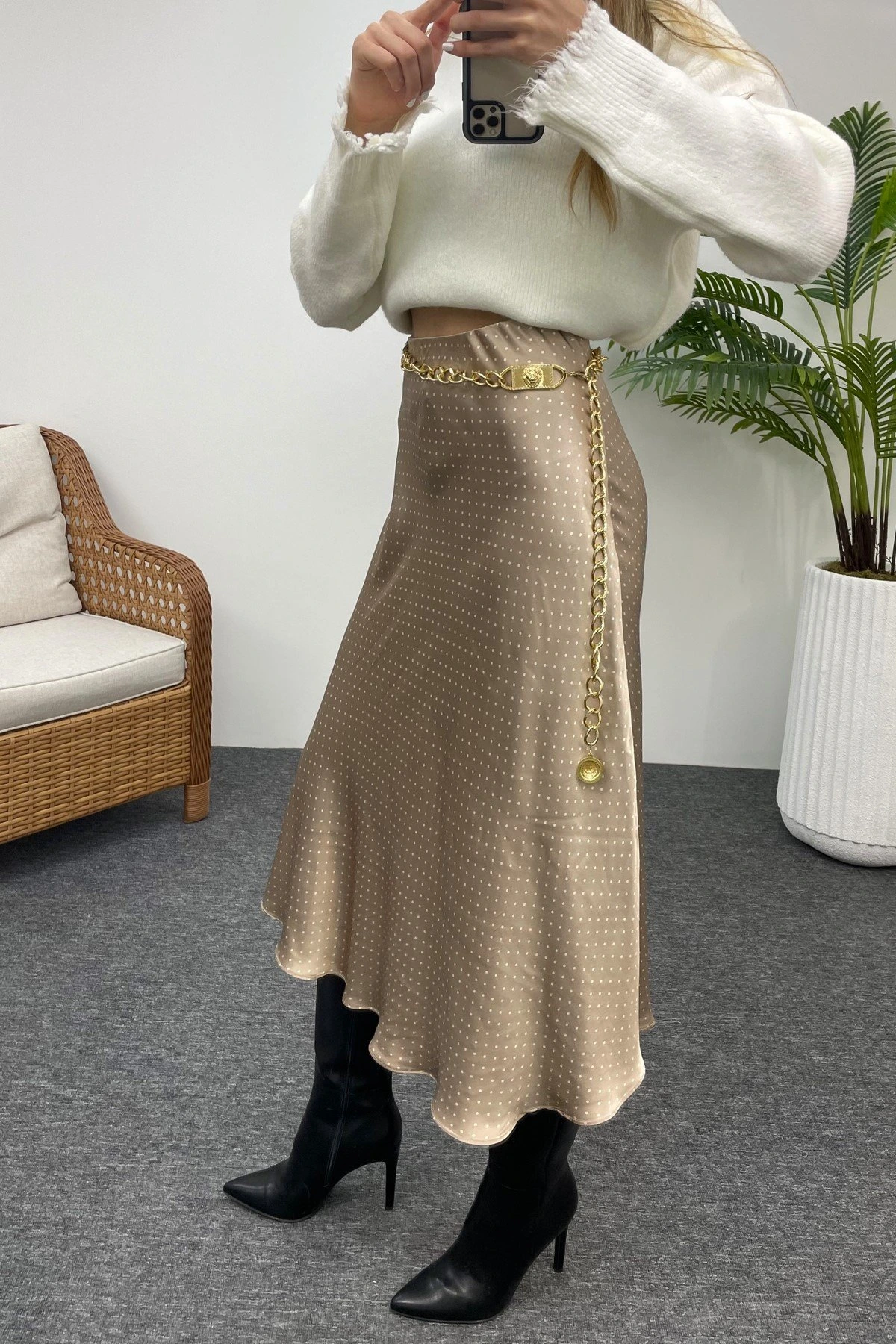 BEL LASTİKLİ SATEN ETEK – BEJ PUANTİYE