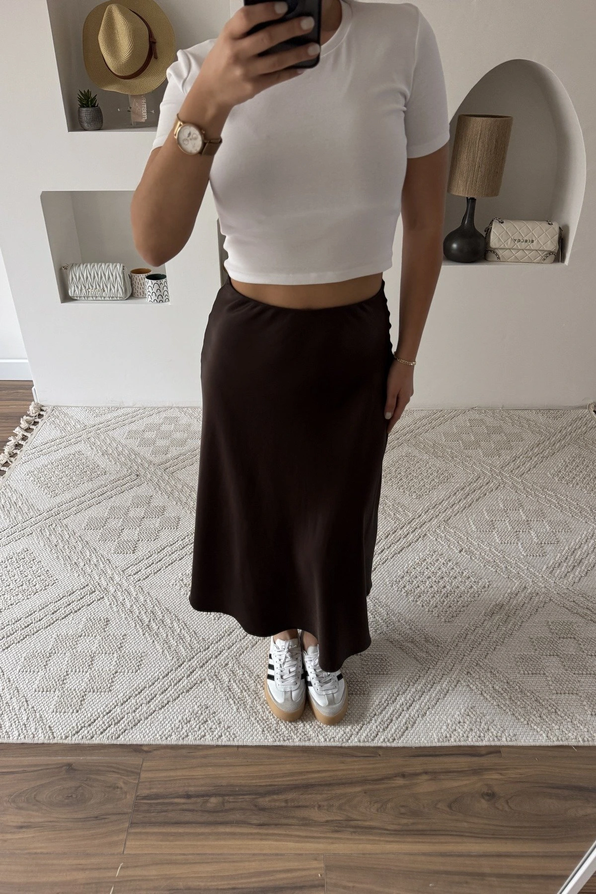 BEL LASTİKLİ SATEN ETEK – KOYU KAHVE