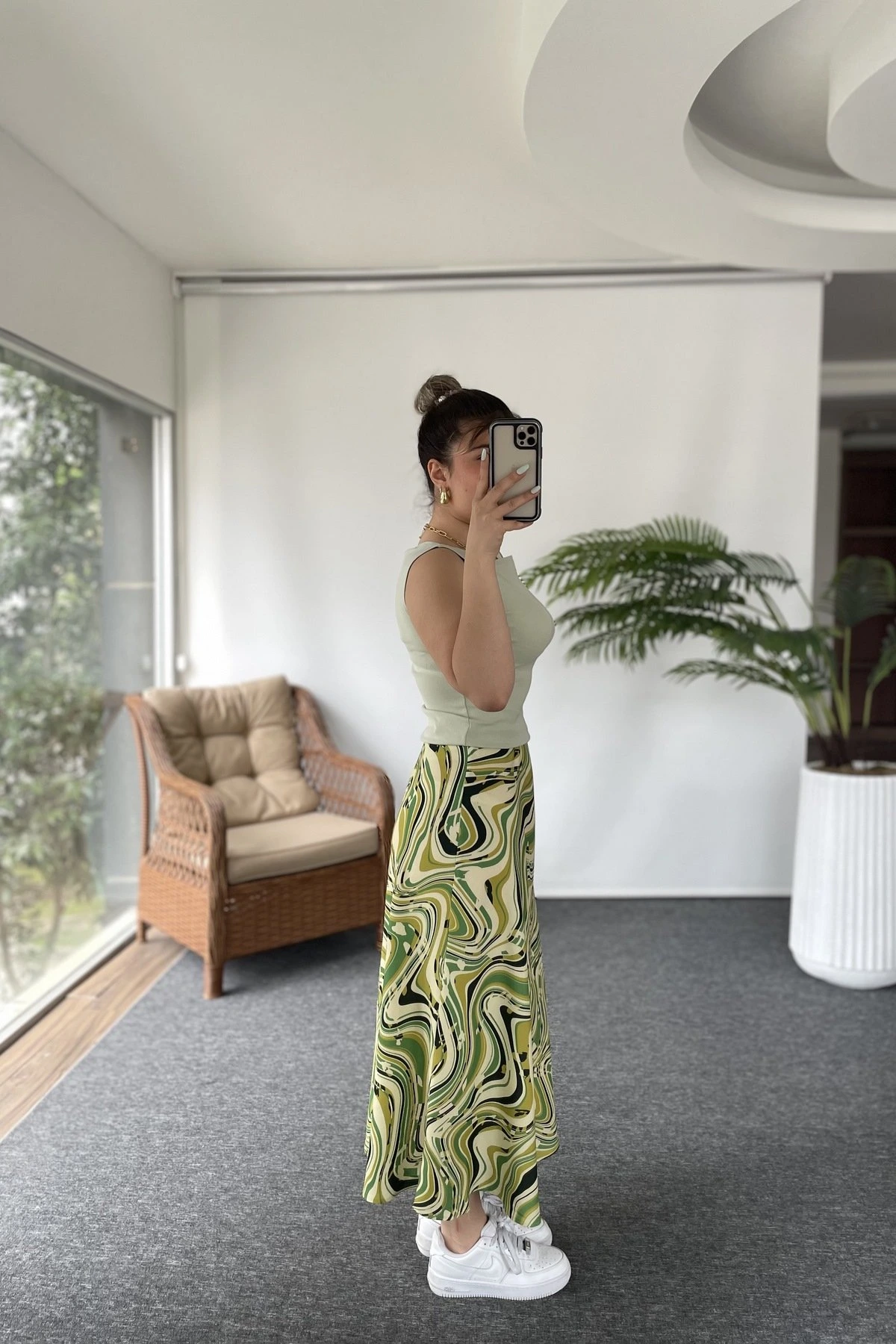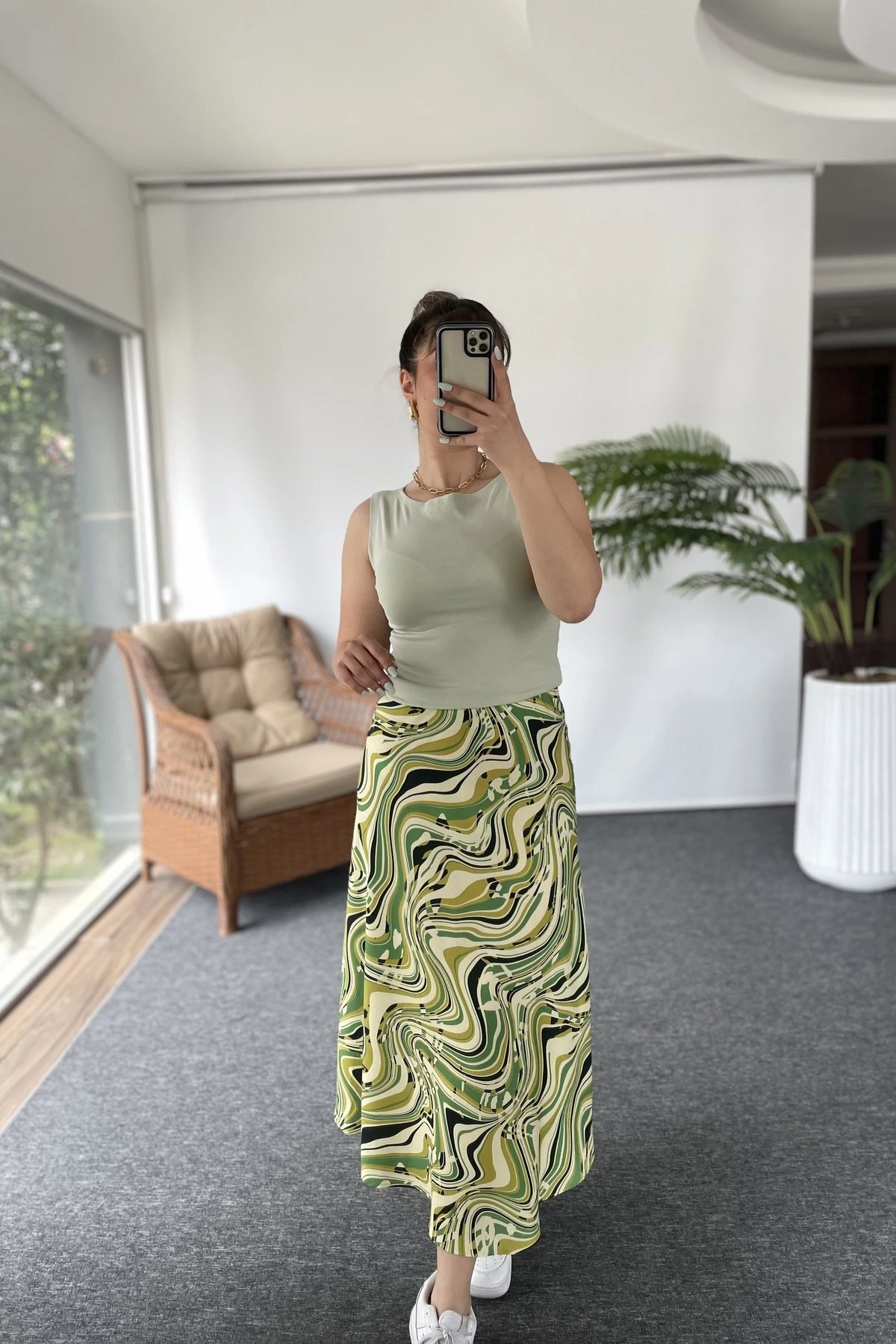 BEL LASTİKLİ SATEN ETEK – YEŞİL DESEN