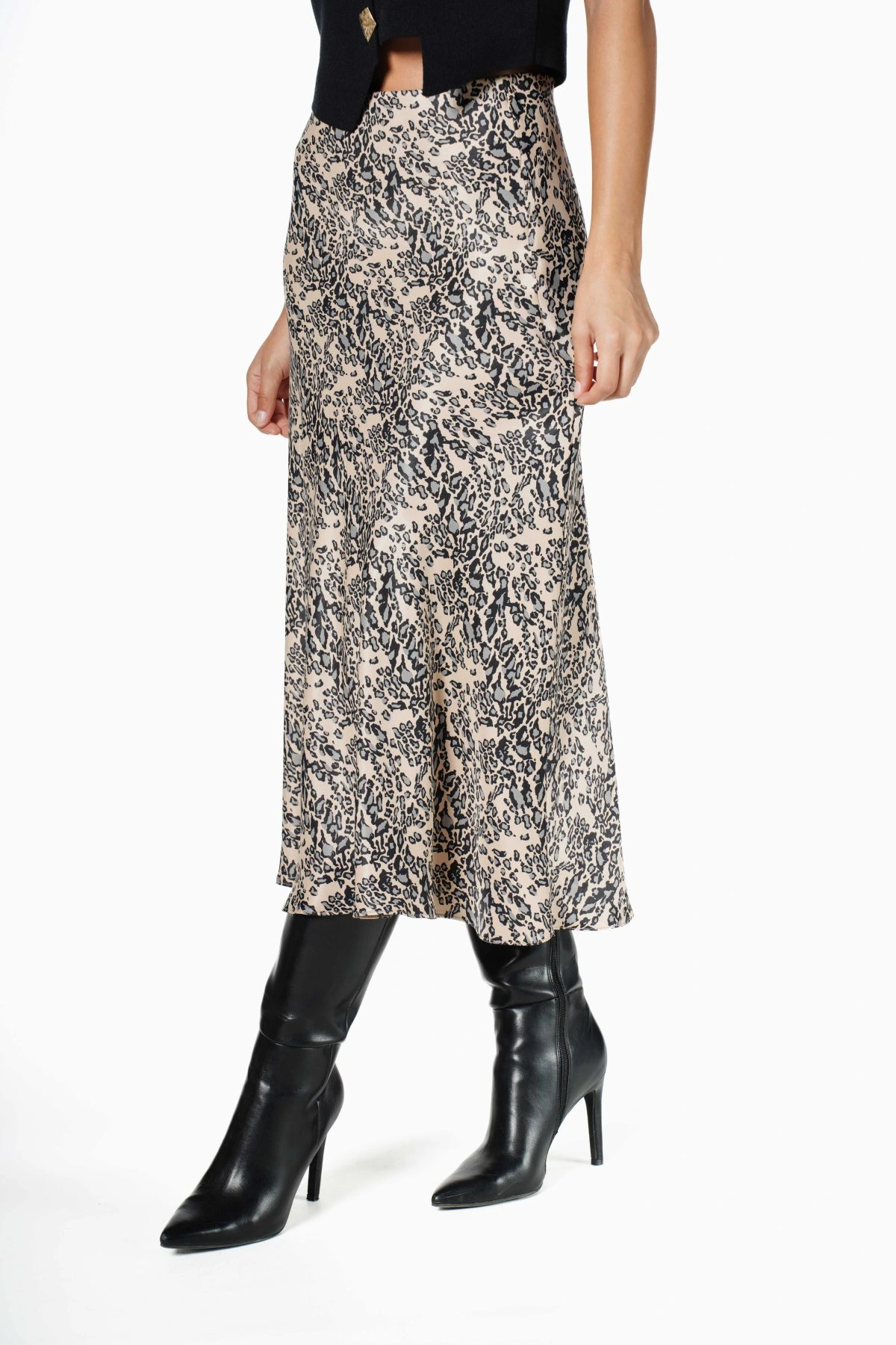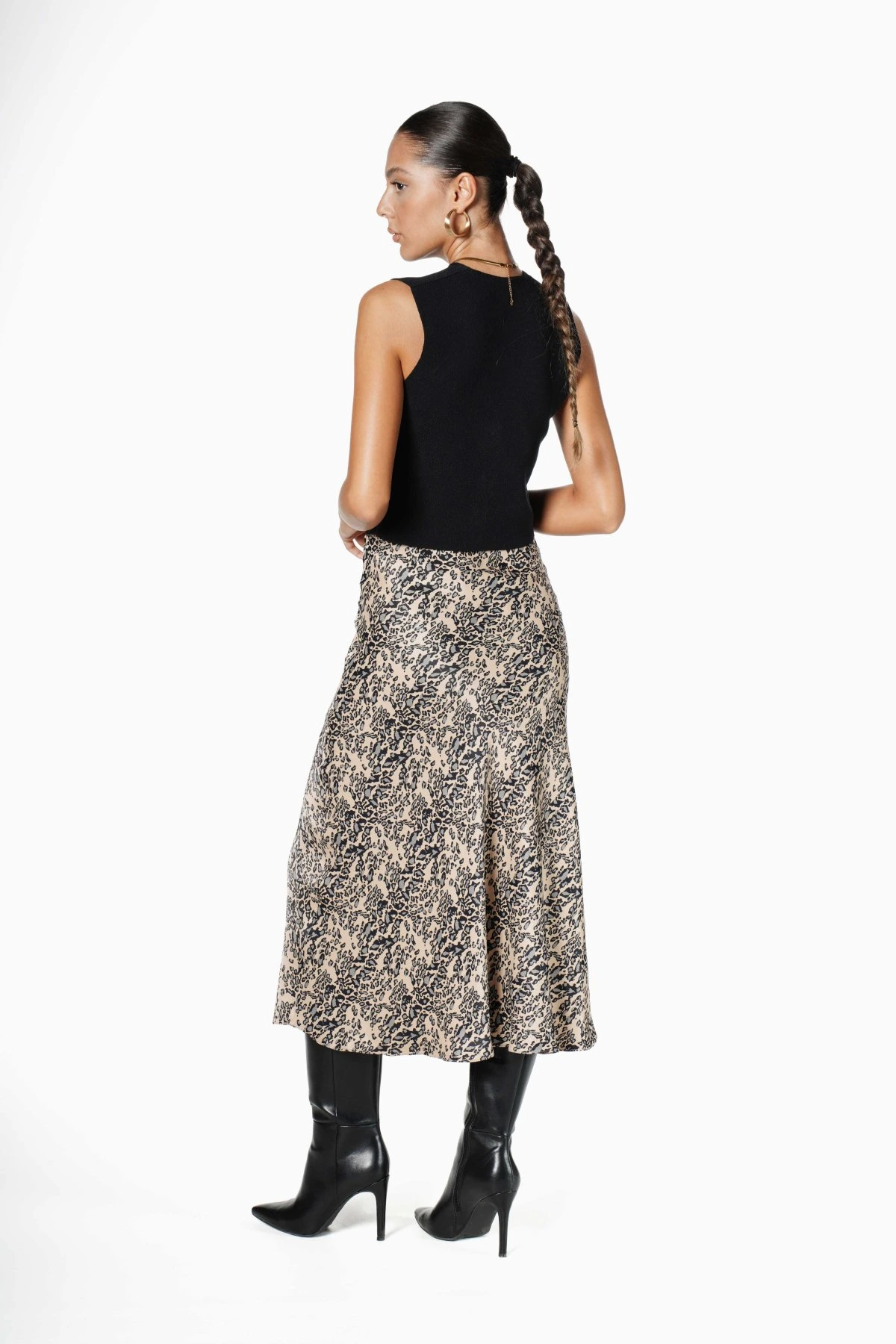 İÇ BEL LASTİKLİ DESENLİ VİSKON SATEN ETEK – CAMEL
