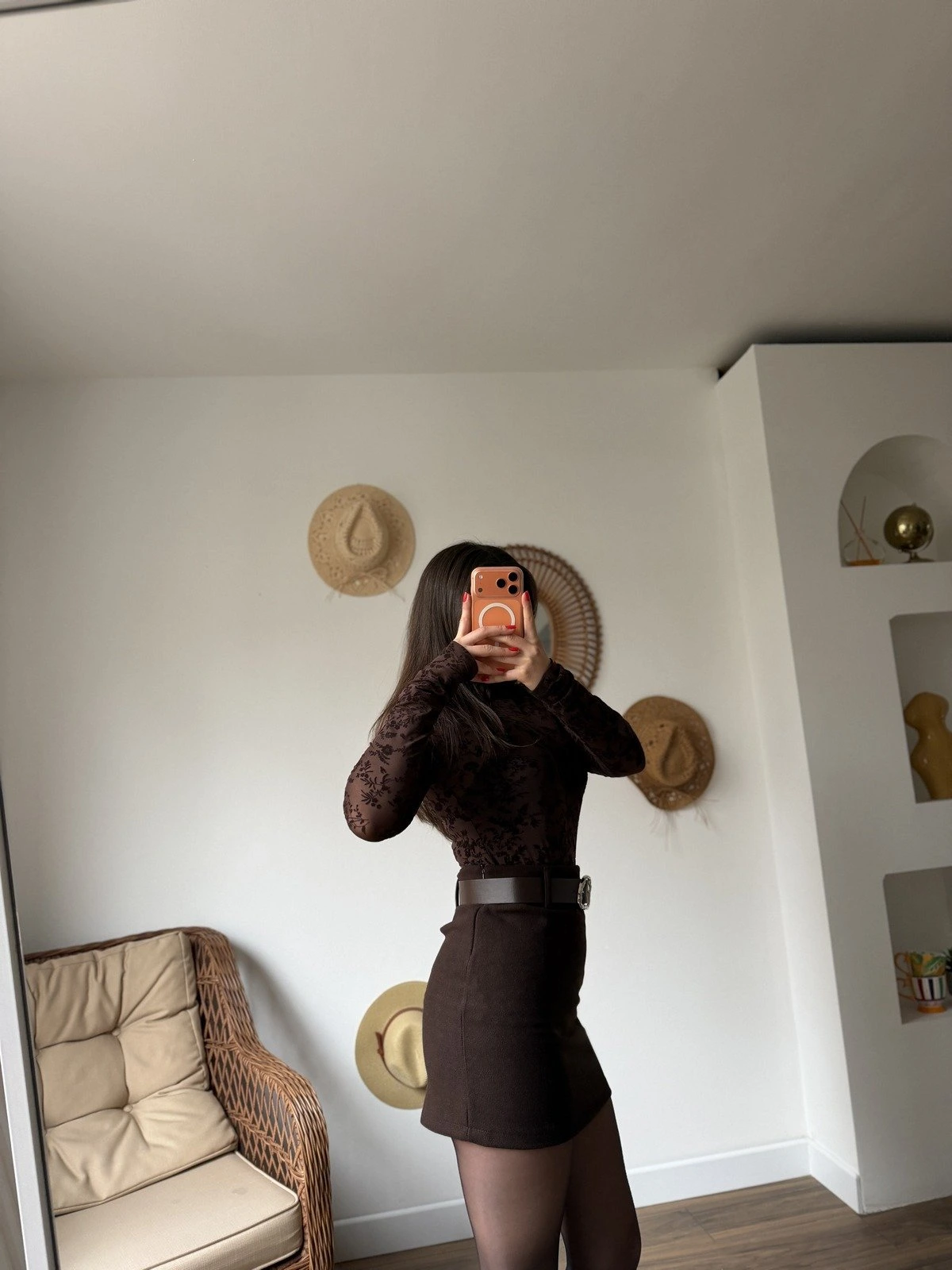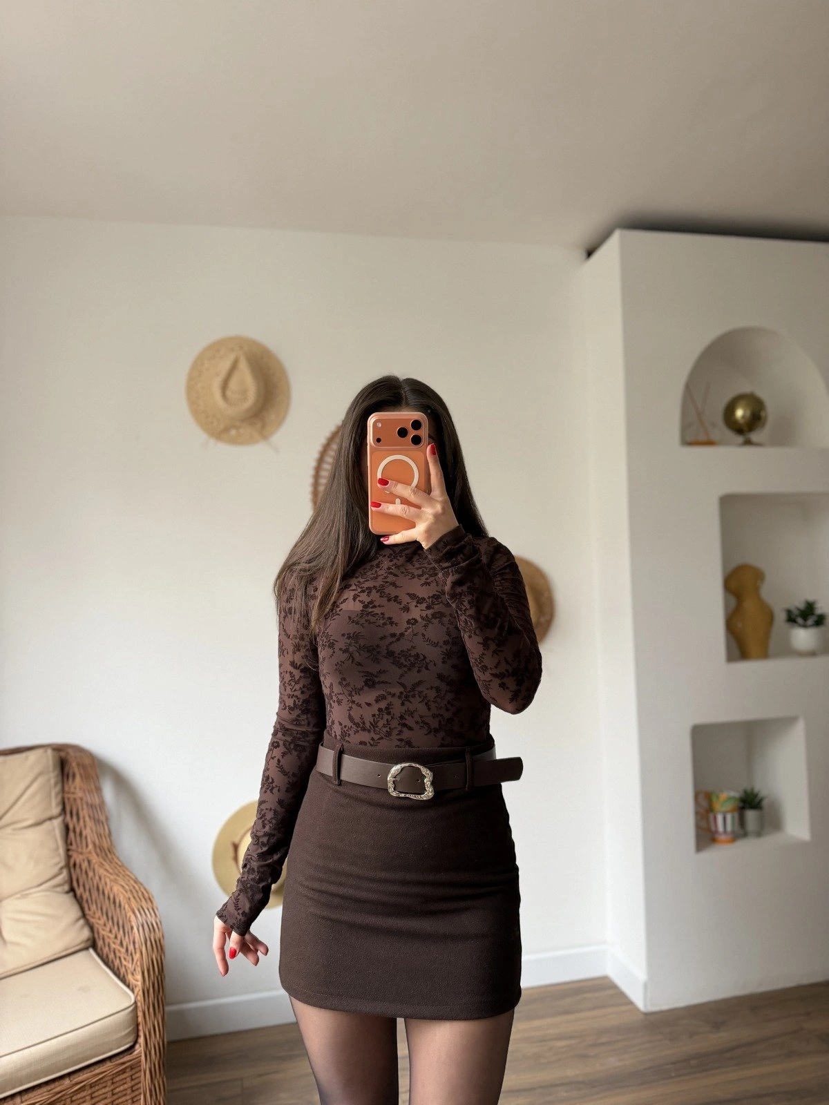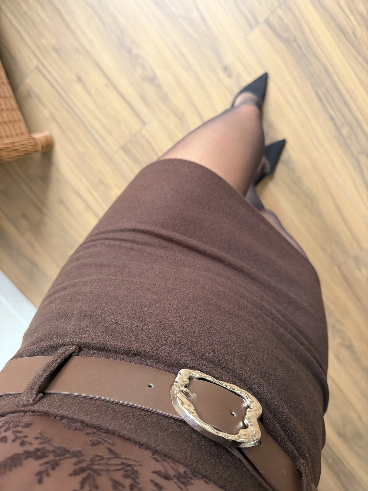 KEMERLİ YÜN KARIŞIM MİNİ ETEK – KAHVE