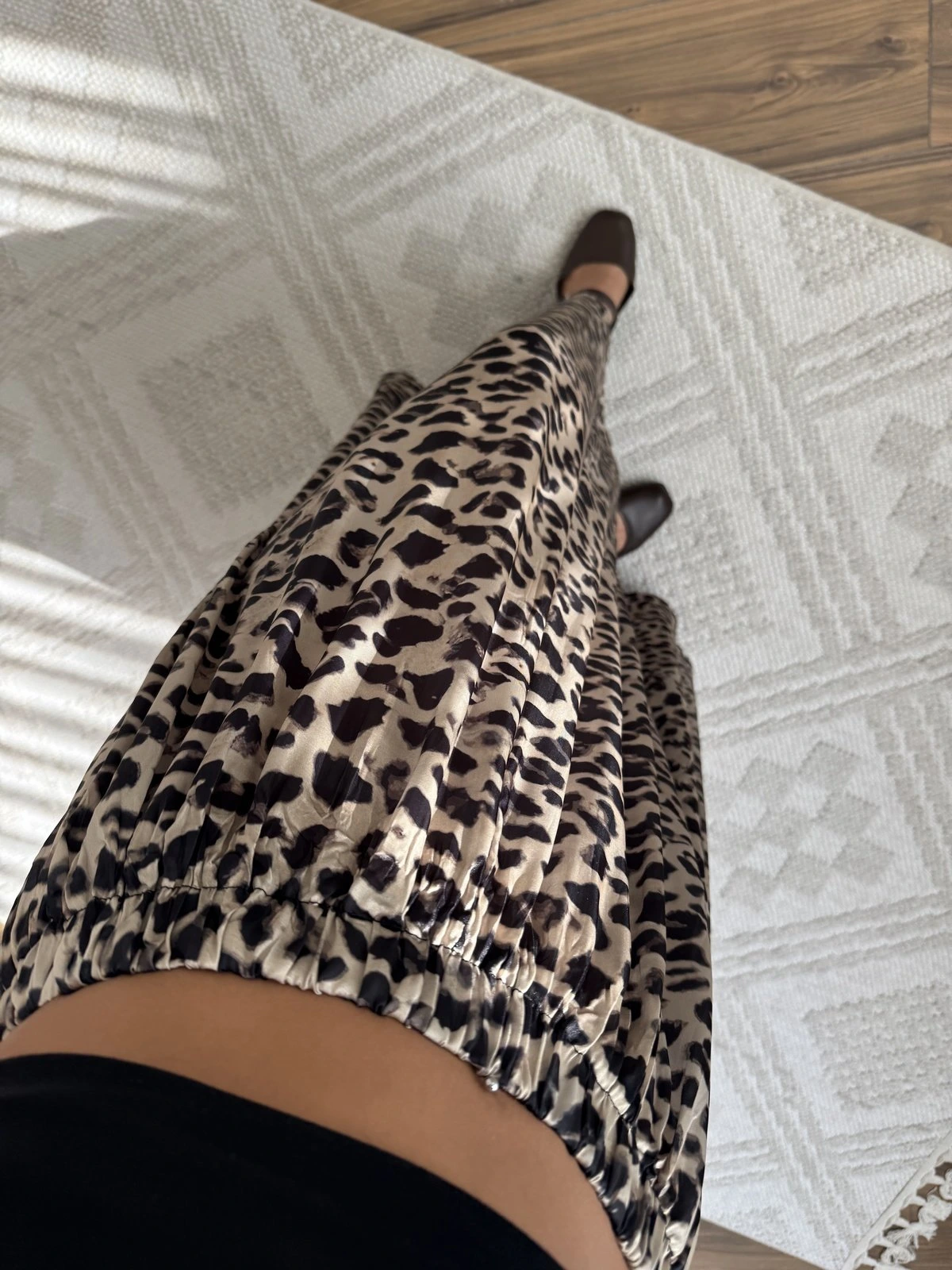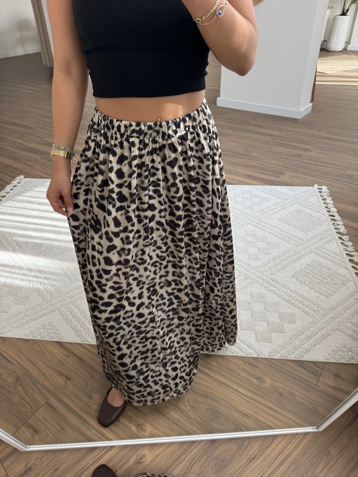 LEOPAR DESEN SATEN GÖRÜNÜM KIRIŞIK ETEK – BEJ LEOPAR