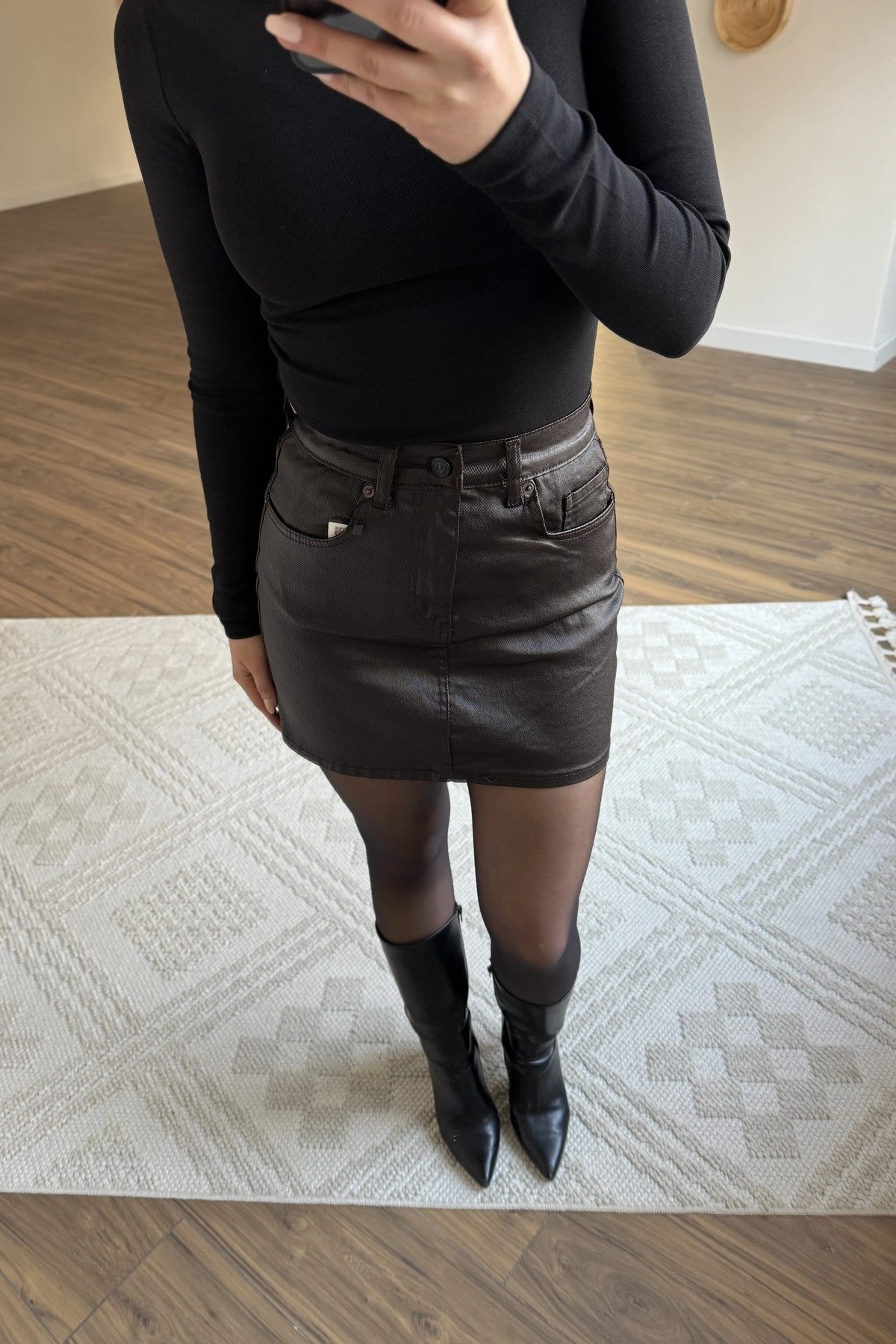 MARKA MODEL MUMLU LİKRALI MİNİ ETEK – KOYU KAHVE