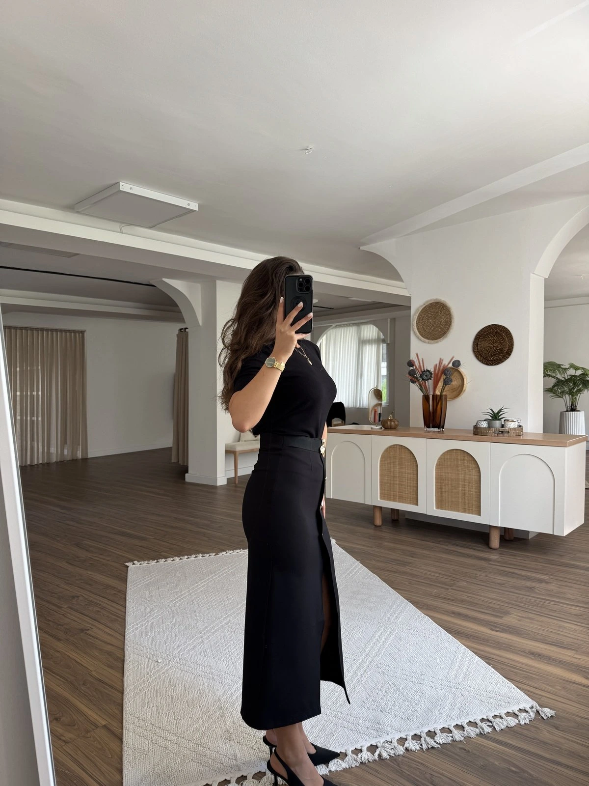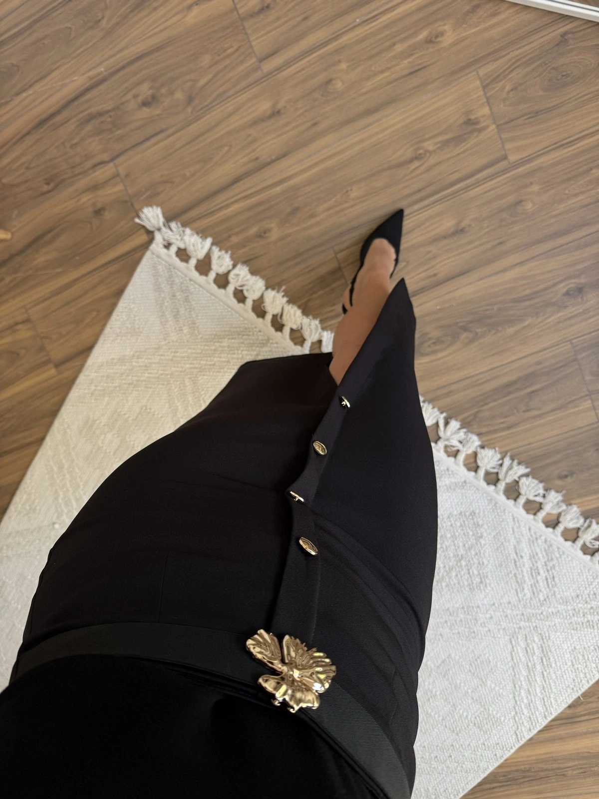 ÖN YIRTMAÇ GOLD DÜĞME KEMERLİ LİKRALI ETEK – SİYAH